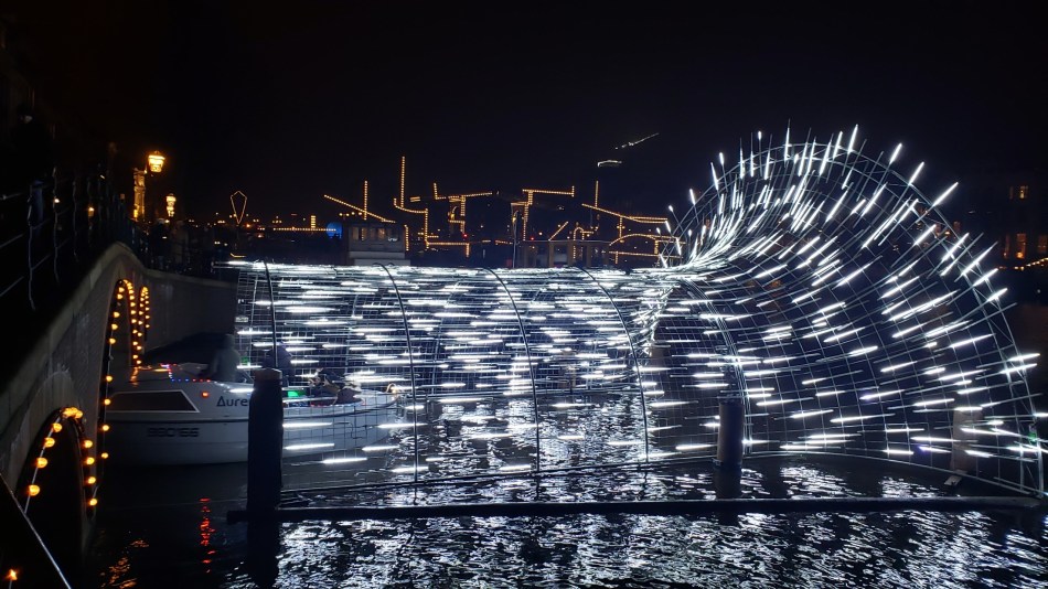 We resume photos from my wintry walk to enjoy the light festival, this time with some videos if your bandwidth is sufficient. 🙂 There really was a bit of a party atmosphere, with both the steady stream of pedestrians, adults and kids, couples on dates and sad singles like me – along with the boats, one of which you do see passing directly through the animated light sculpture above. Look closely and you’ll see kayakers and paddleboarders out as well, in these or future photos.
