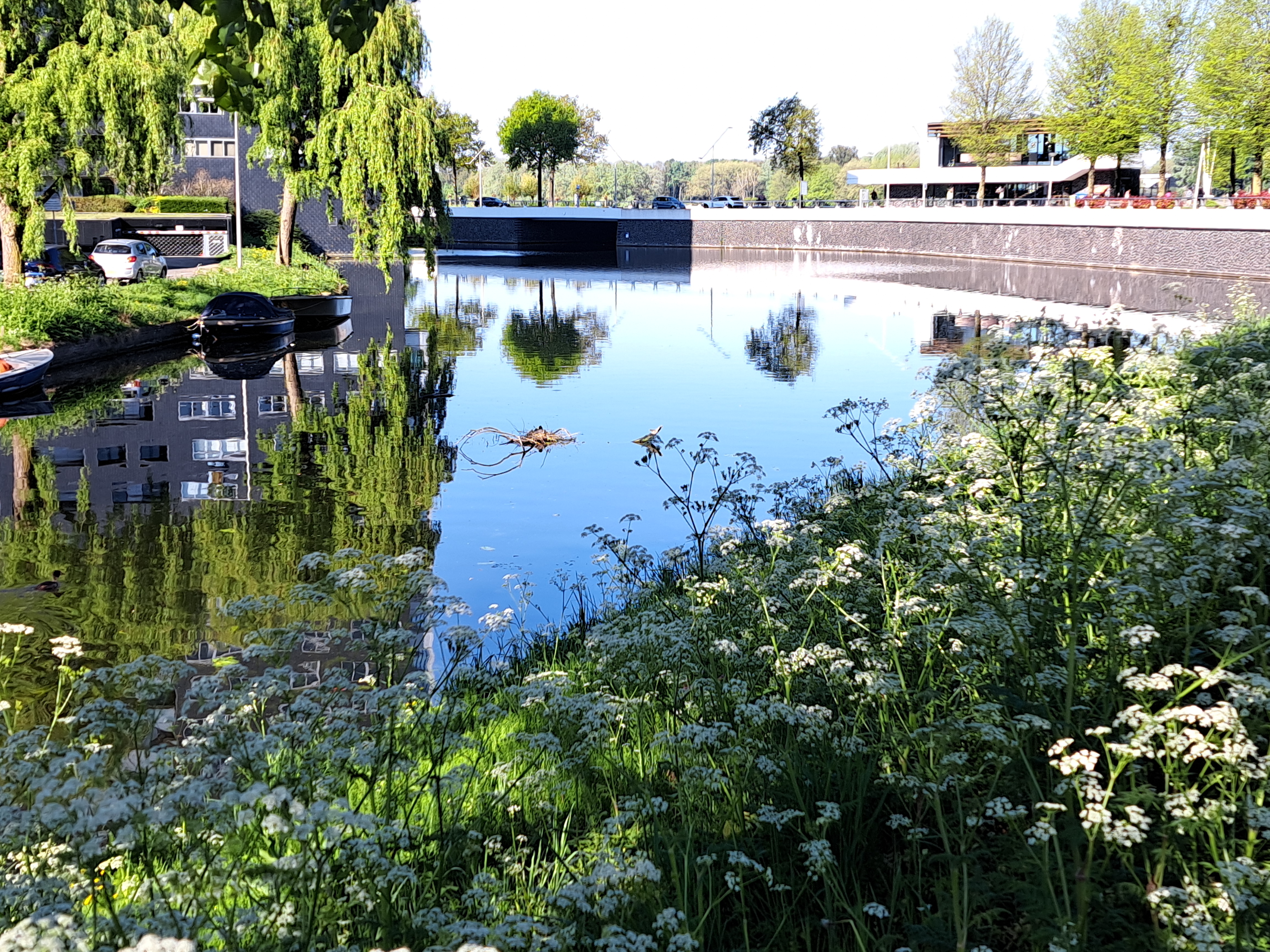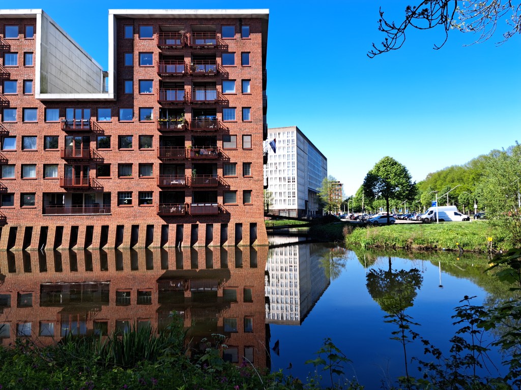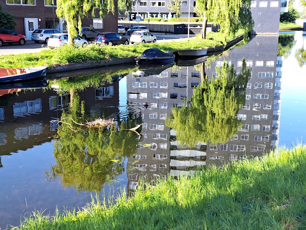 In the center left of the photo above, you’ll see a bit straw sitting on the water, and a coot swimming slightly to the right. That’s a coot nest, of one of two in the mini lake – canal thing that wraps around my building here in A’dam (yep, the tall on reflected in the water there) that I’ve enjoyed watching this season. All the various shots in this post are from the past few months on the interconnecting canals and lakes in my neighborhood.