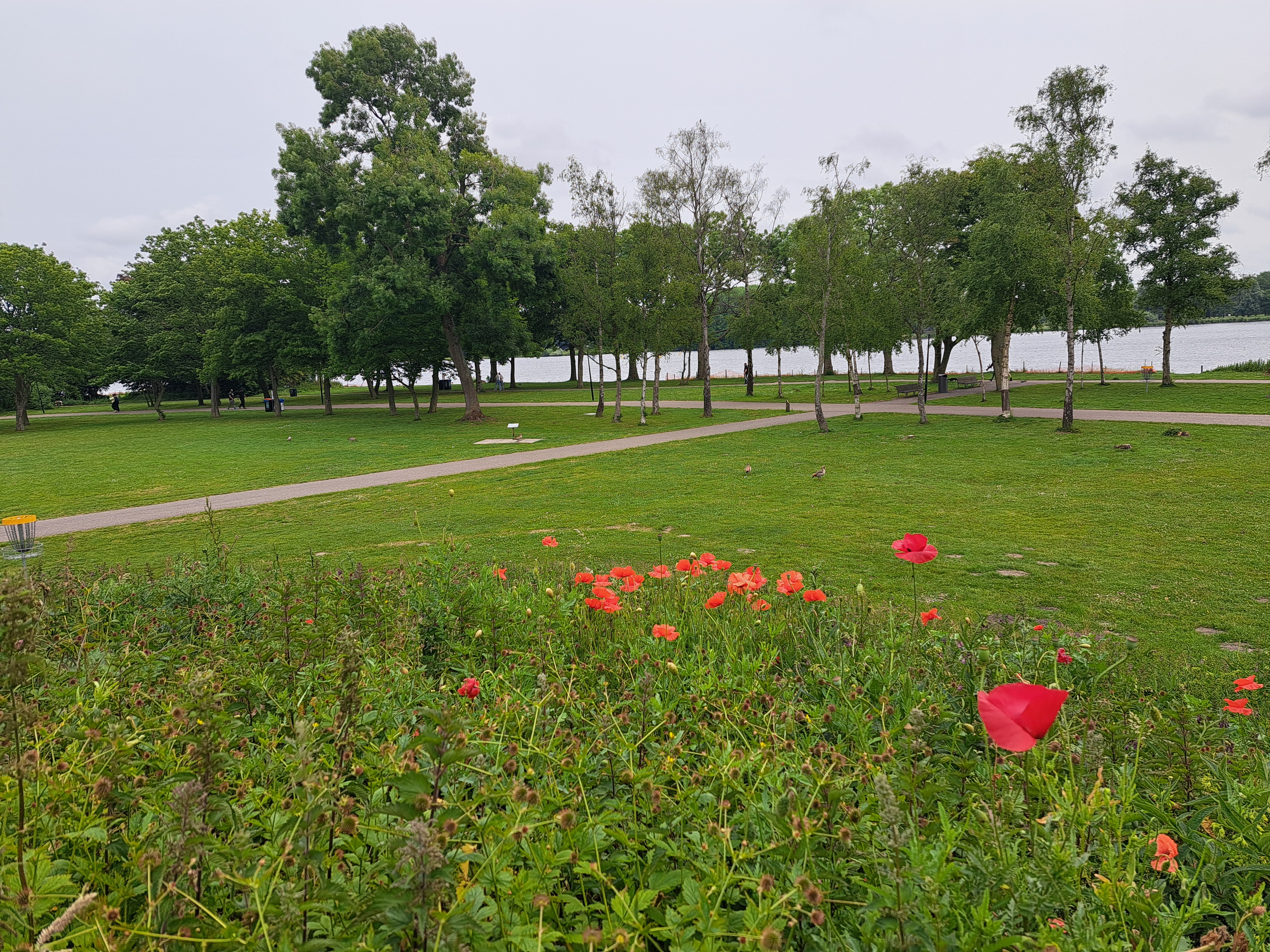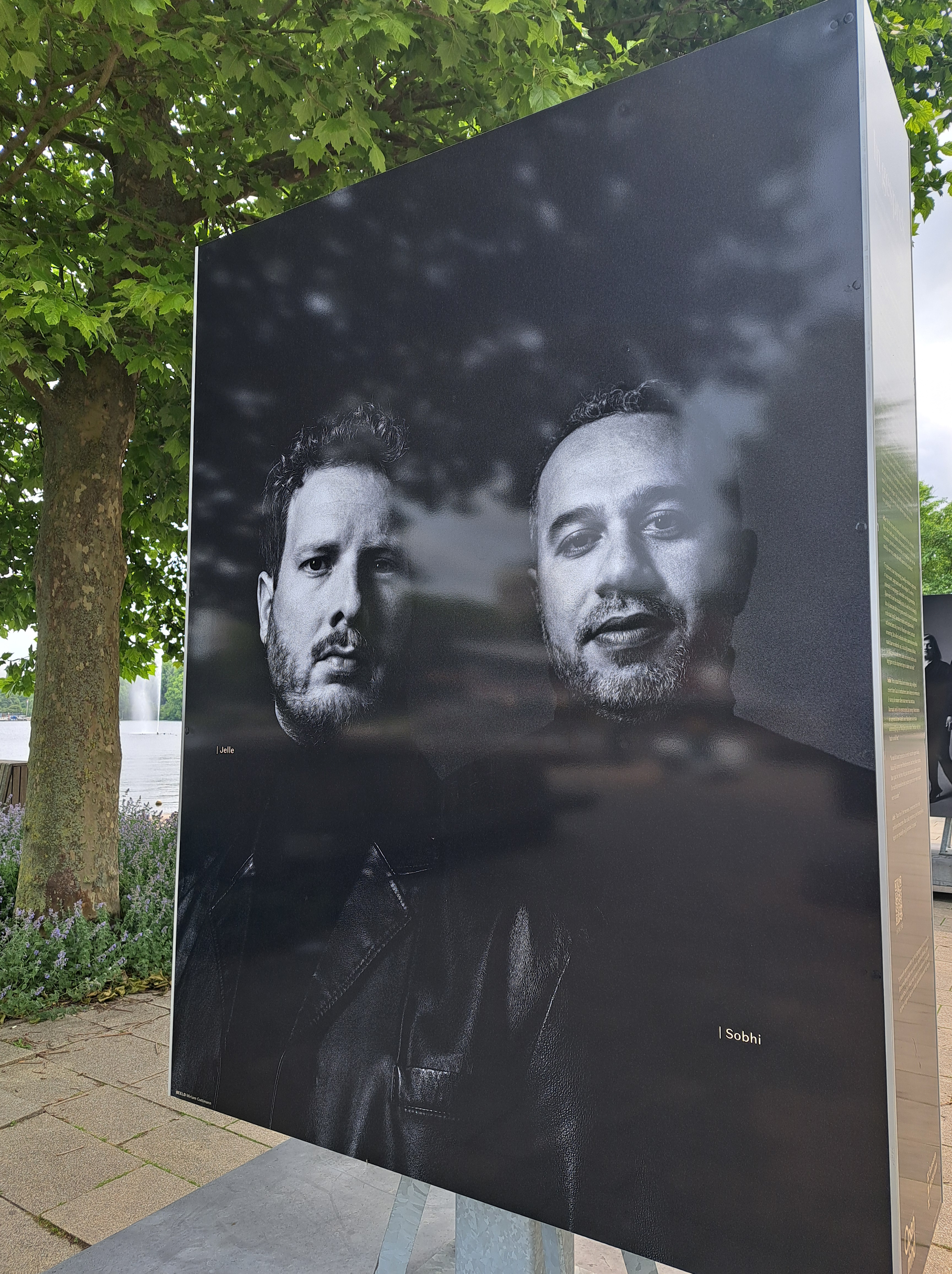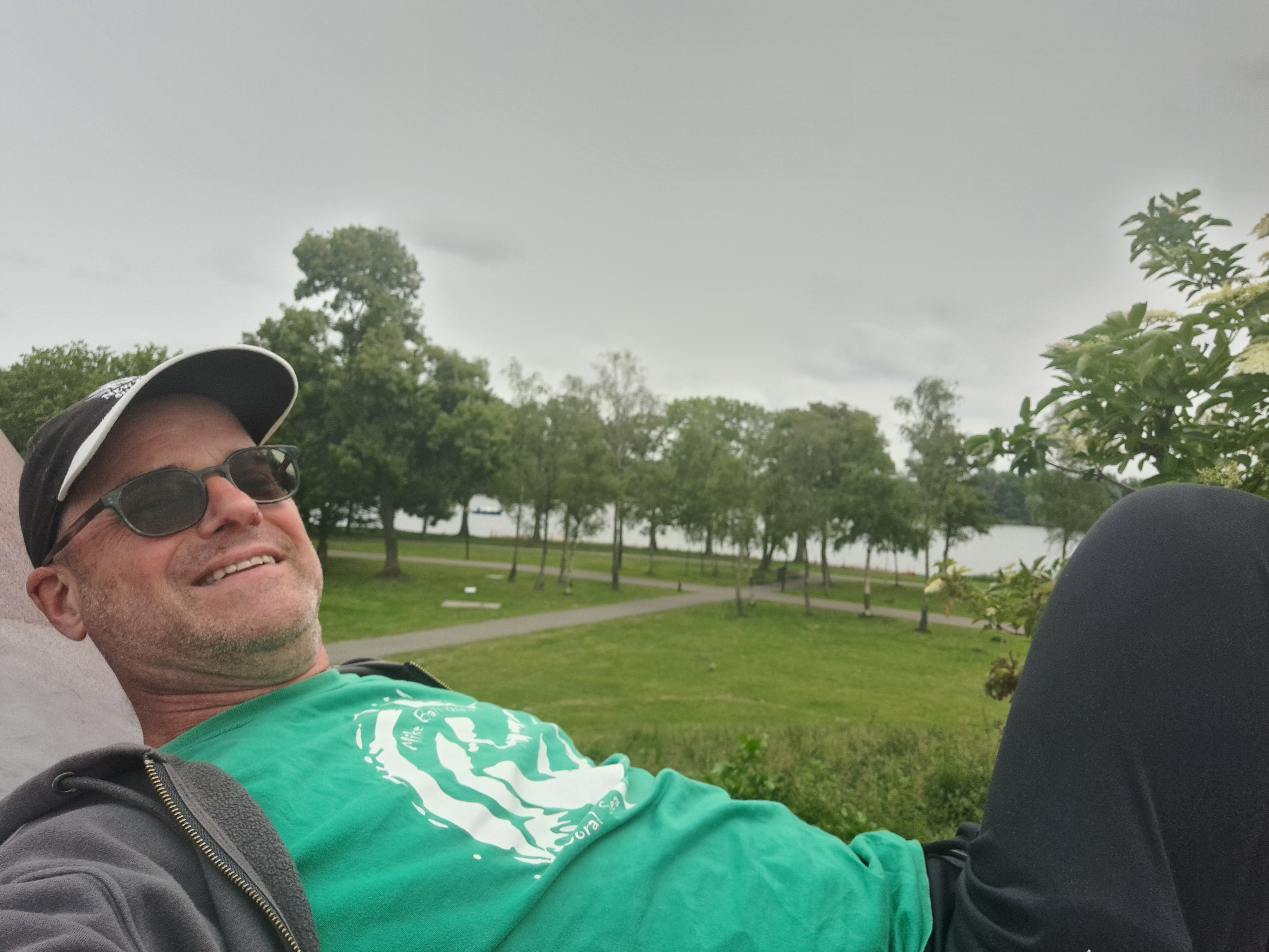 The joys of a contemplative, stress-free walking exploration of one’s local park & lake. E.g. I finally climbed up the top of a little hill with a sculpture on top, which I’d always just looked at from that path down below, previously. I’m lying on said sculpture in the image above. Also, a photo exhibit at the south end of the lake about building dialogue between communities.