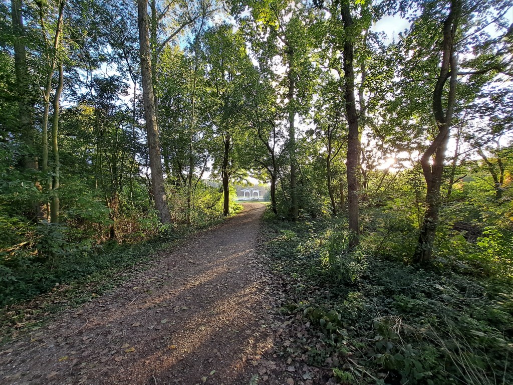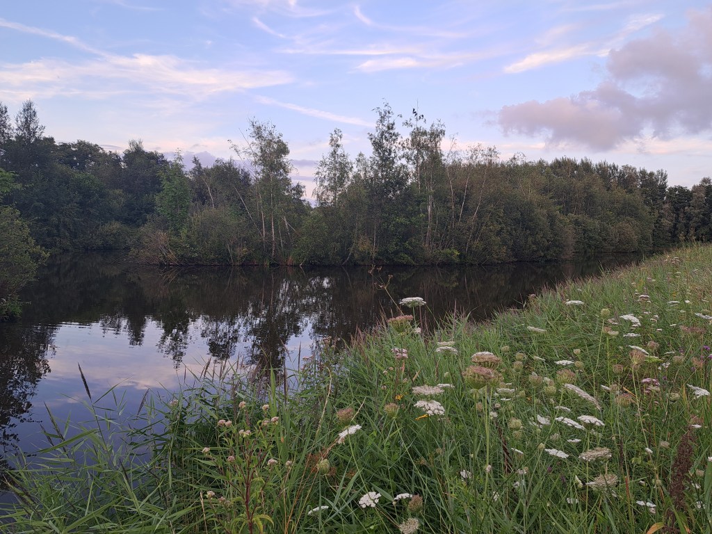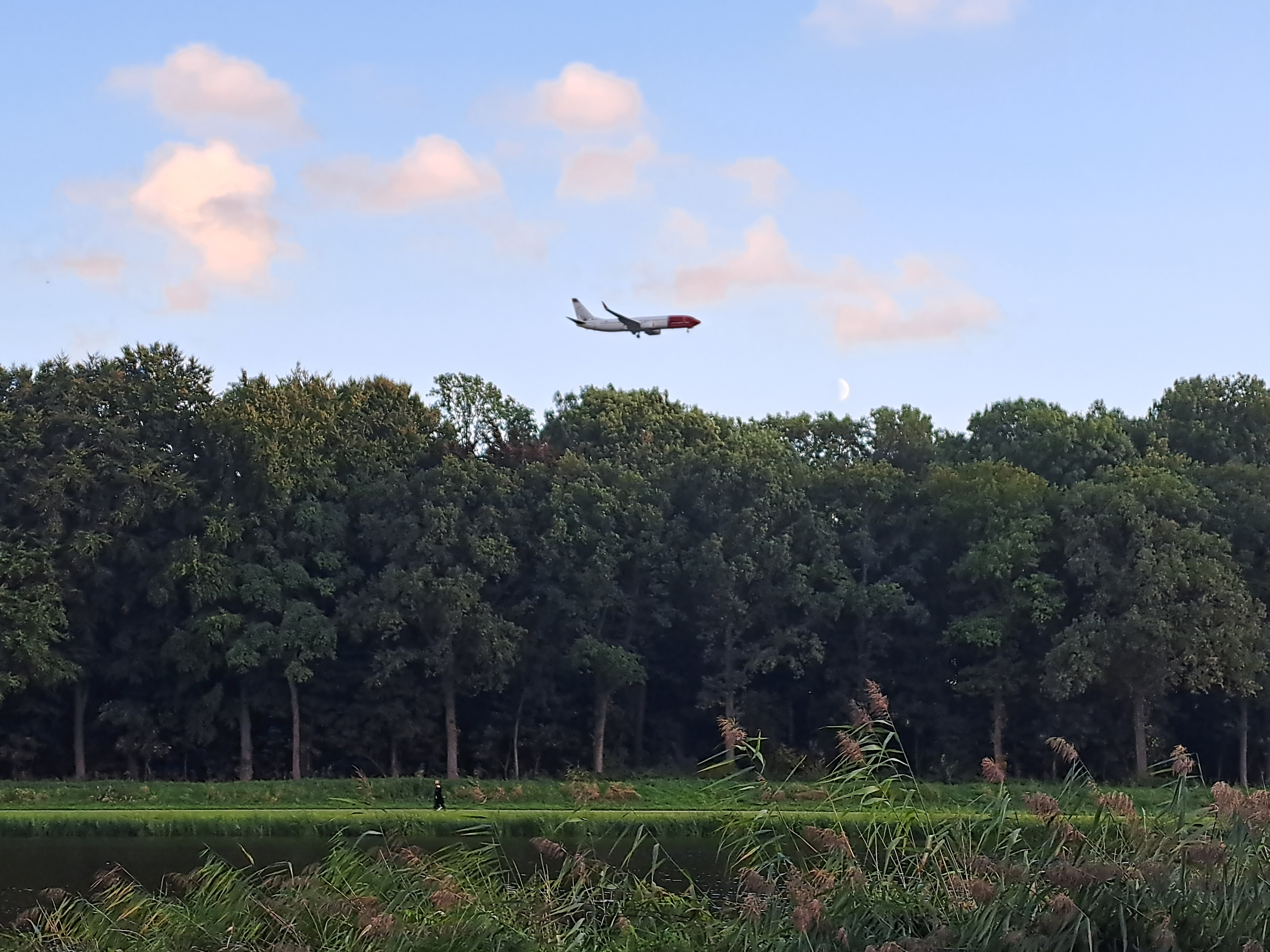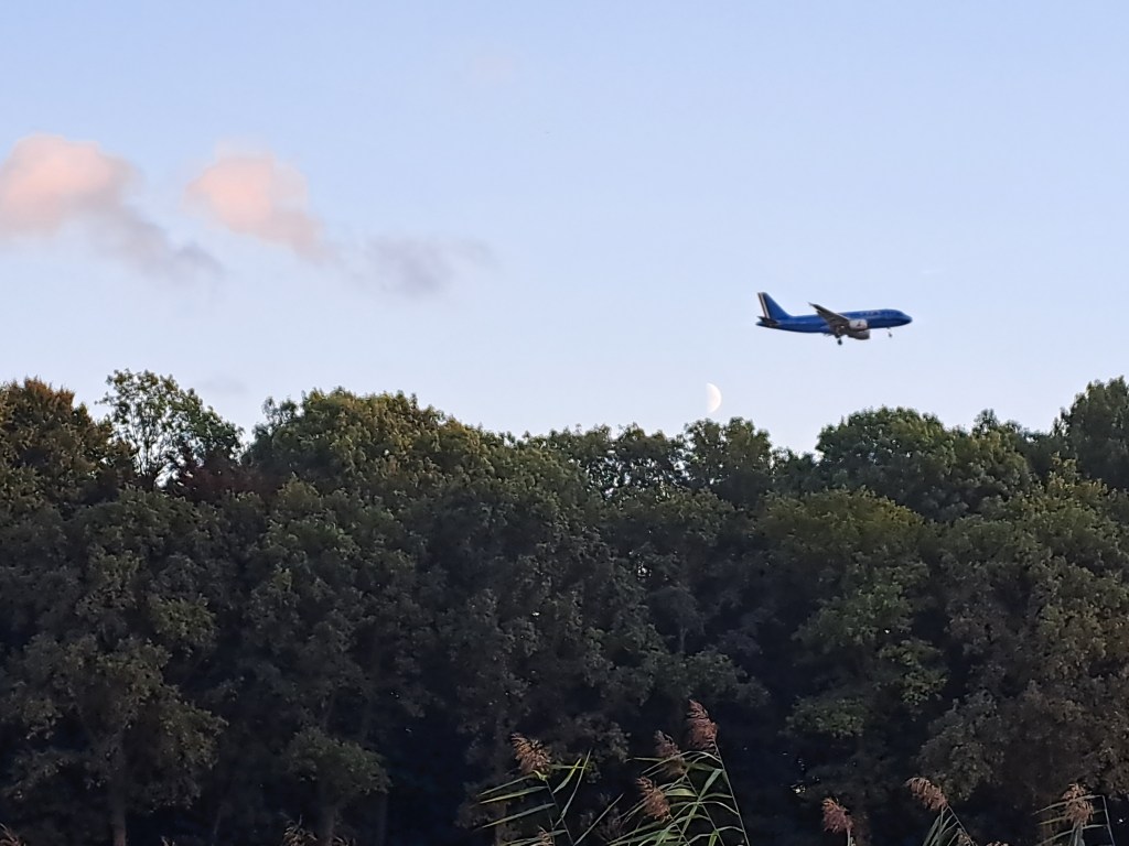 Back to the Bosbaan in Amsterdamse Bos on a lovely early-autumn evening. Note the moon just below the airplanes’ approach path to Schiphol, in the photos below. A well-placed bench allows one not only to contemplate the moon, the sky, the trees, the planes and the Bosbaan (the forest water track or water course, I guess) itself, but also to rest the weary legs.