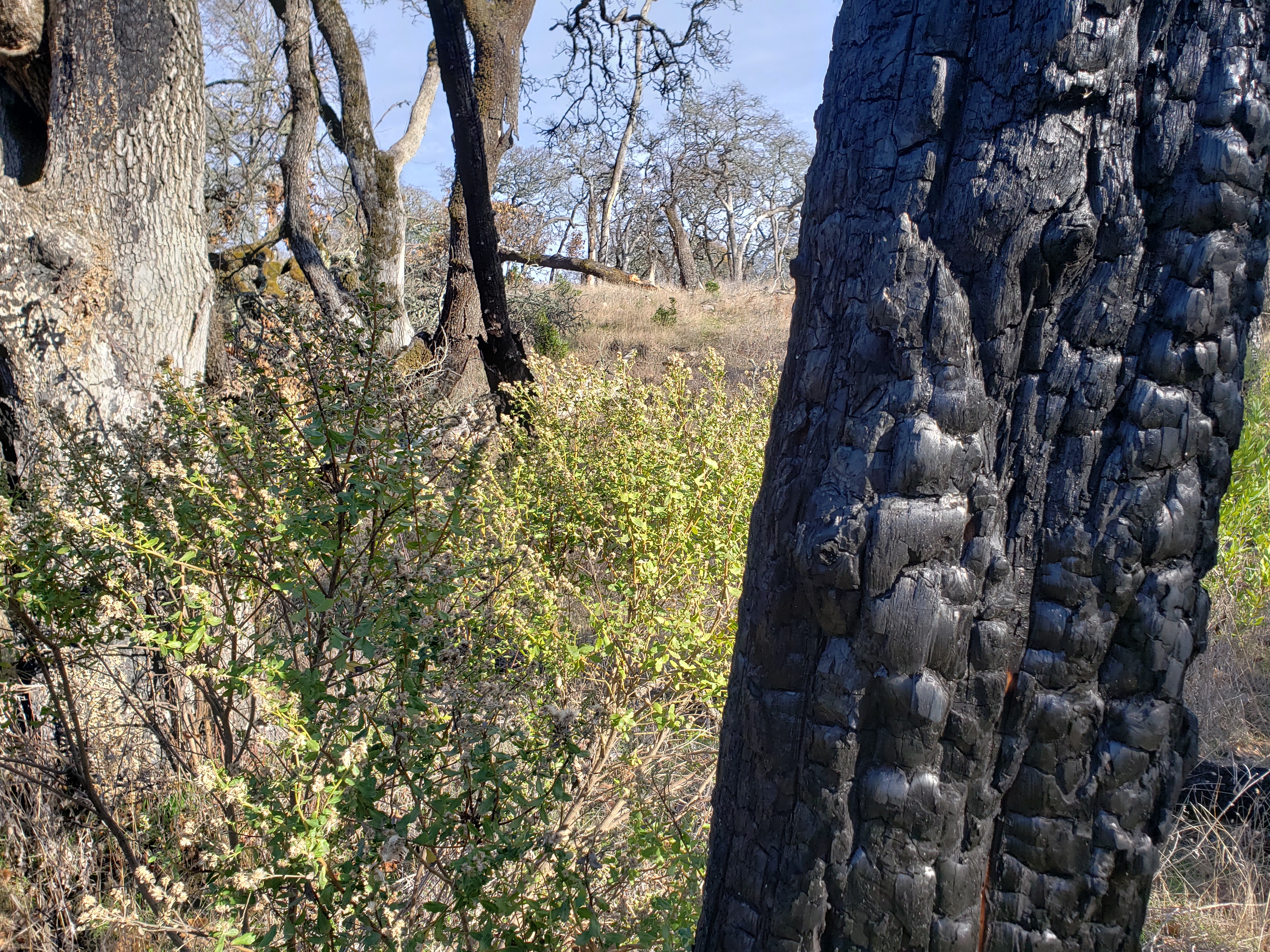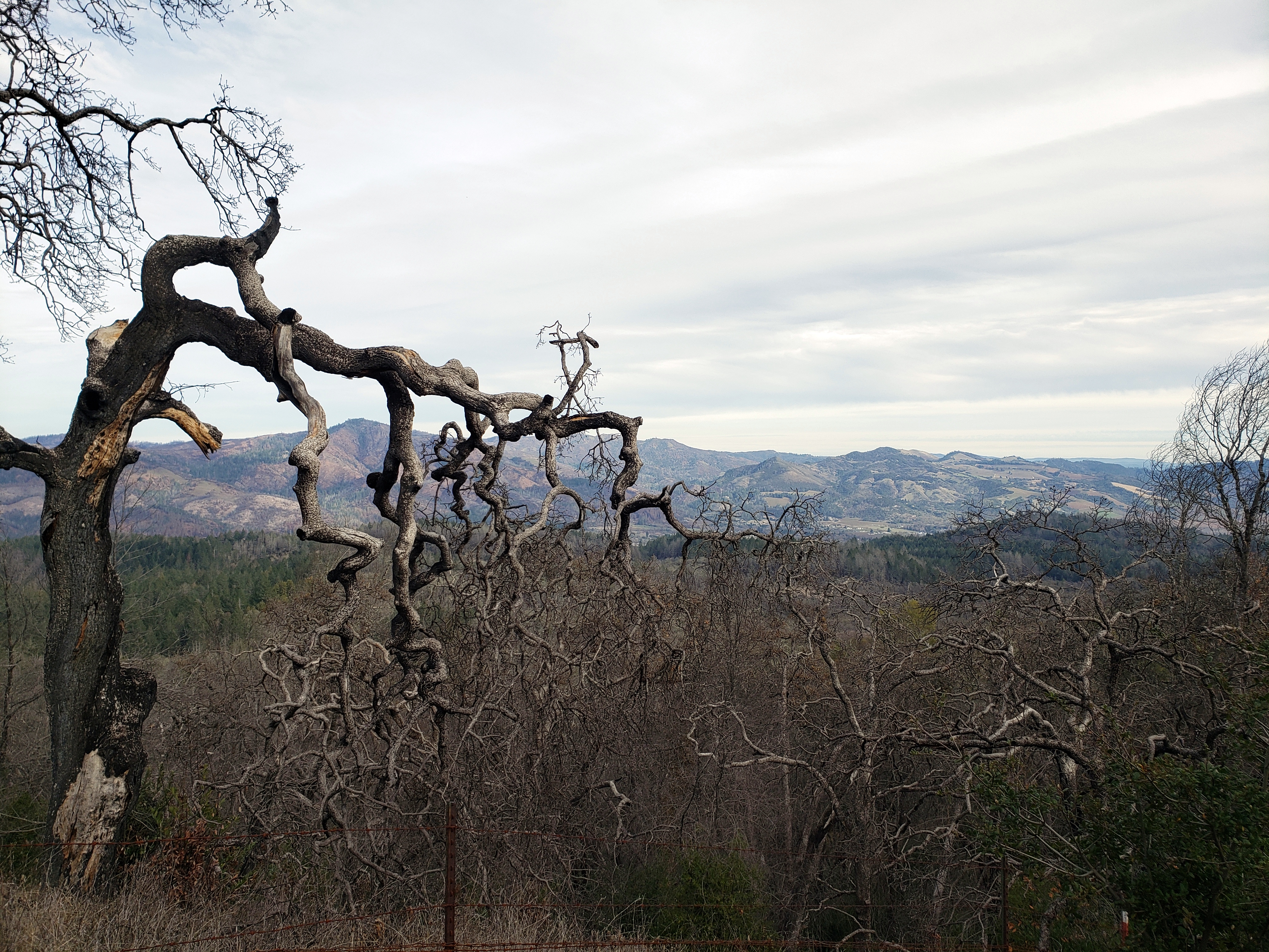 Although trees around where I stood when I took this shot *did* burn in the Nuns fire in 2017, the “burn” part of this photo is on the Mayacamas ridge in the distance – which, when I took this photo late last year, had just been burned again in the Glass Fire, after experiencing the Tubbs fire in 2017 at the same time as the south side of the valley, from which I took this photo, was burning in the Nuns fire. I remind us again that Santa Rosa hadn’t seen major immediately close forest fires for a few decades prior to 2017. Now we realize that with climate change, this is our life, and we rather desperately hope that both public and private policy and behaviors will speed their pace of change while we can still reduce the longer-term impacts on future generations and livability on the planet…