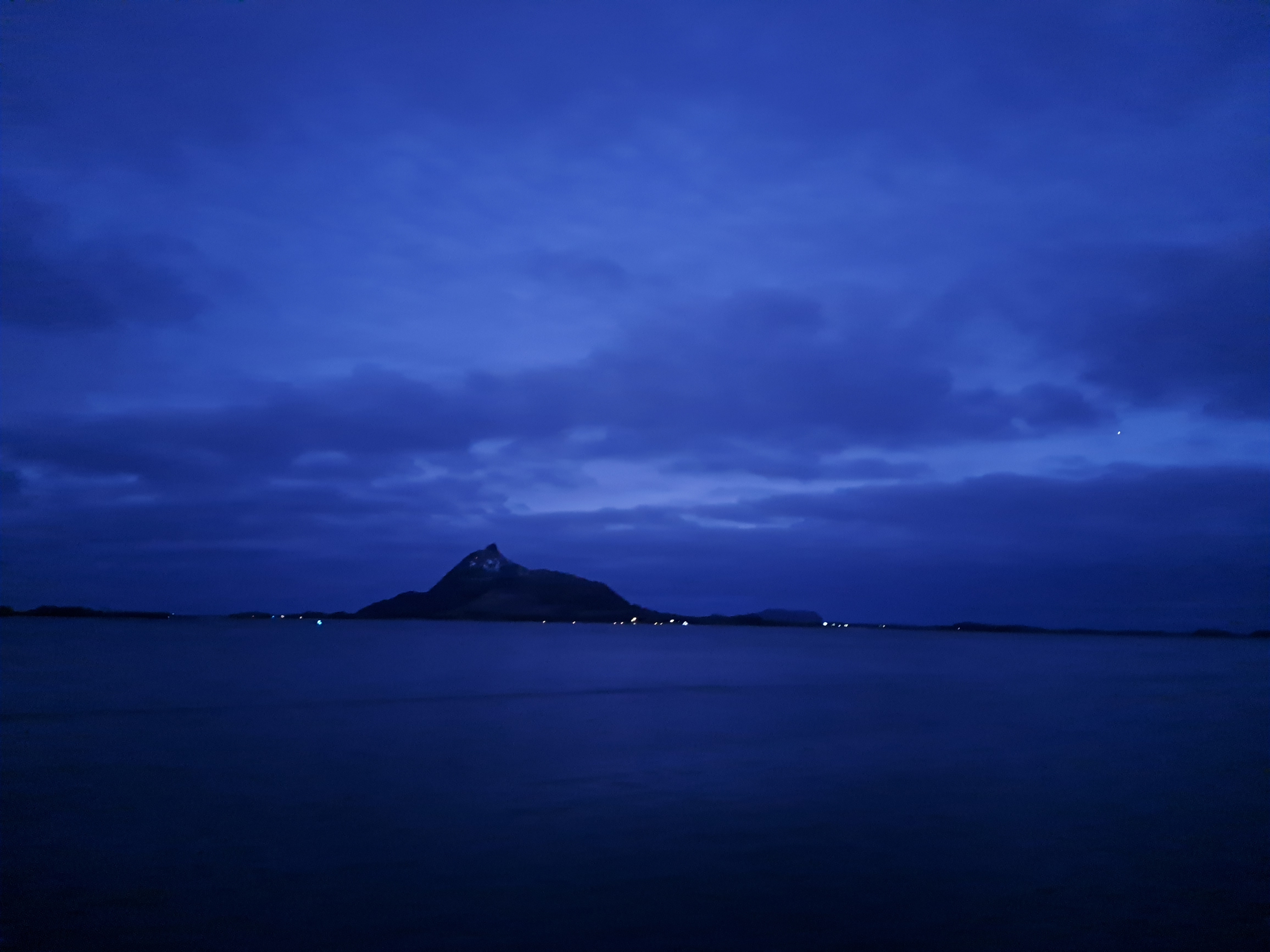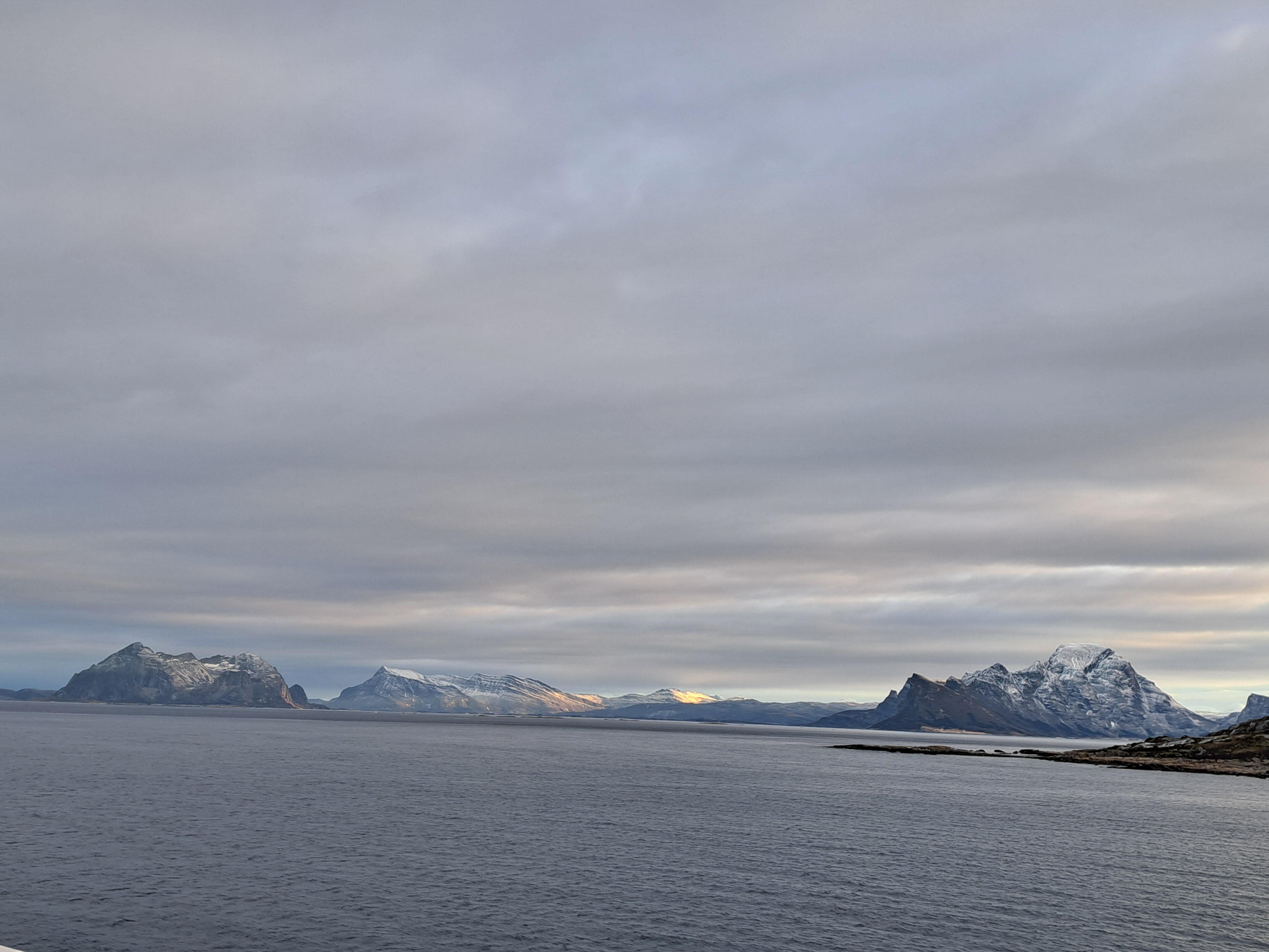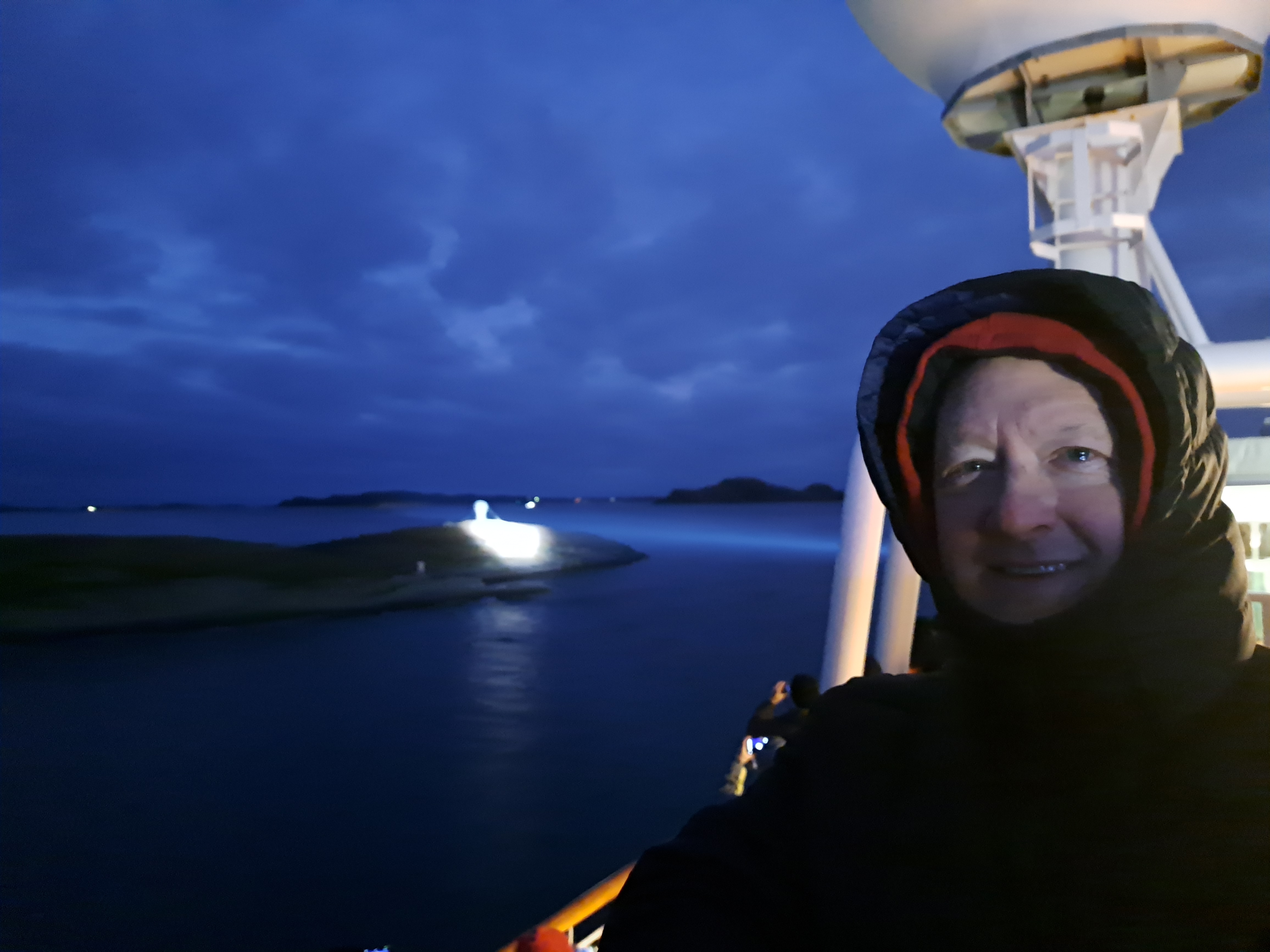Above, shortly after 8am on the 23rd of January, roughly two minutes before our boat crossed into the arctic circle. Below other mountainous coastal shots from the following hours before we docked at Bodø…including Gary with the ship’s spotlight illuminating the arctic circle monument behind him.