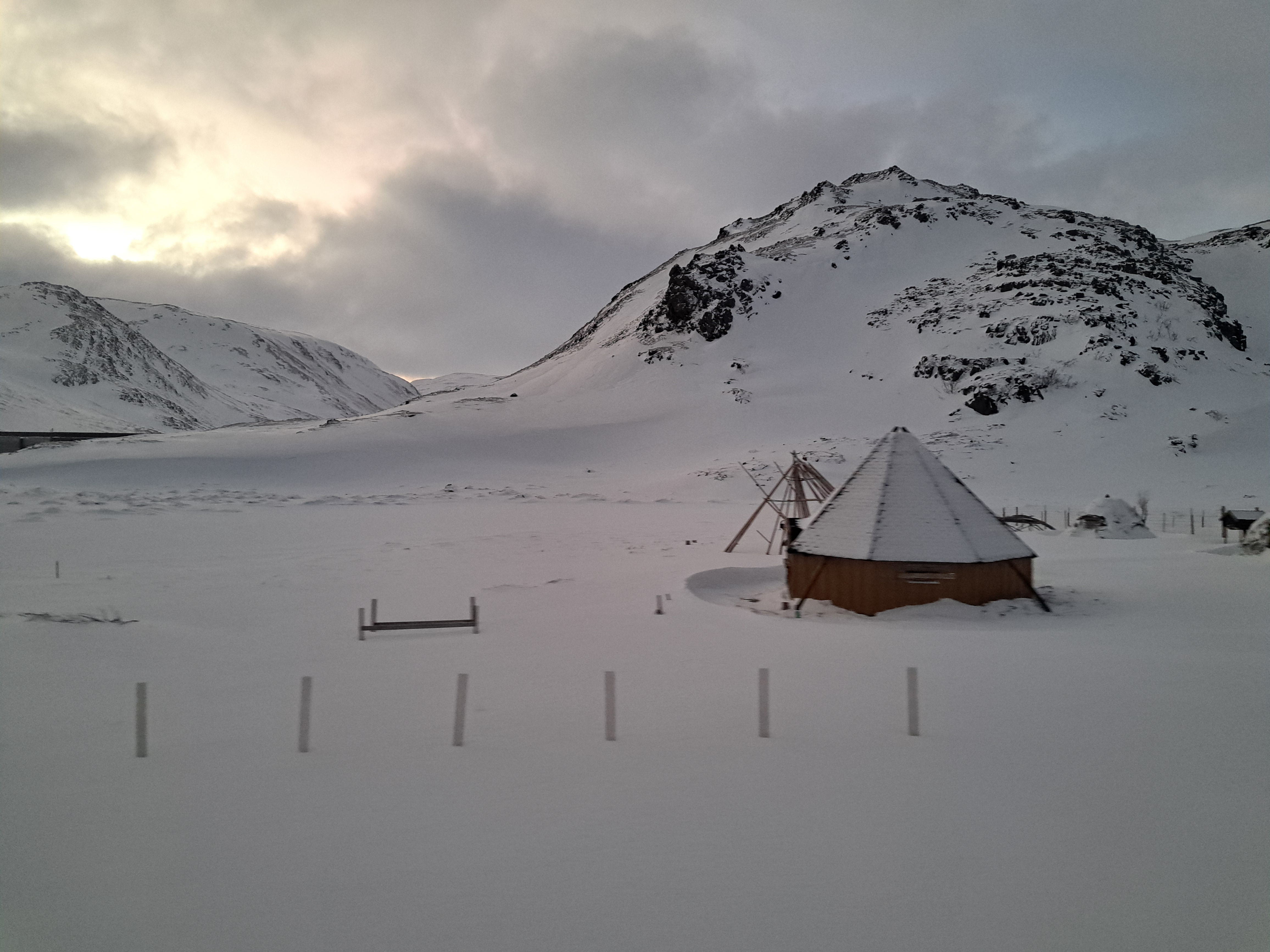 Last snowy-landscape shots from the Snowhotel Kirkenes, in Norway’s Finnmark county. Above, we’re looking out from the lovely big windows in the dining room over the frozen, snow-covered fjord that runs south from the harbor, on which we also did our King Crab outing that day. At the bottom of this post, for those interested, is a panorama of the compound in which you can see, at the far left, a conical-roofed cafe building which is next the sled dog kennels (shared in our prior post from Kirkenes), then the larger modern glass & brick structure that houses check-in and tour-group visits (tour groups do short trips for the King Crab, Husky Sled Dogs, etc.), then the heated modern lodge hotel building with rounded roofs up the hill from left to right, then the large bulk of the actual frozen Snowhotel itself (where we slept on our ice beds), and at the far right the building with restaurant, sauna, changing and warming lounge reserved for overnight snowhotel guests.