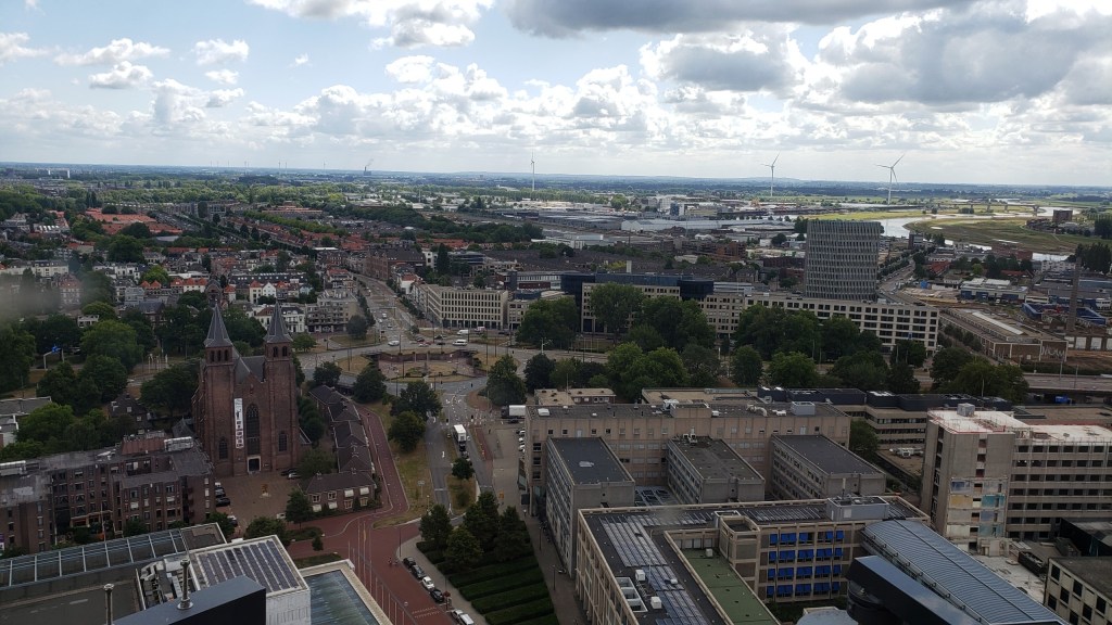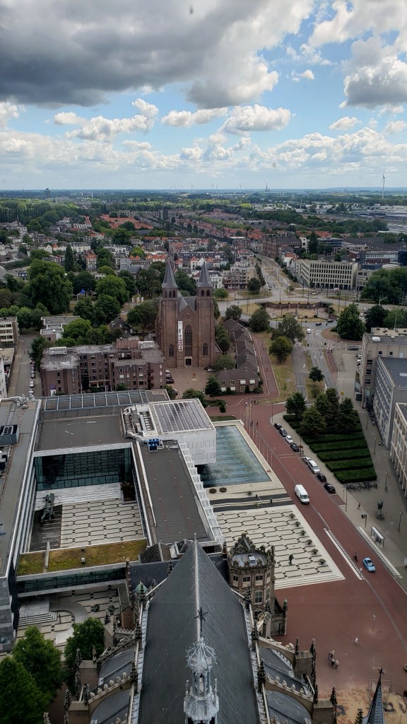 Our penultimate suite of photos from the lovely city of Arnhem, capital of the (by Dutch standards) very large province of Gelderland. My cousin Sam commented the first time I posted a photo of this historic cathedral that he loves the cathedral – simply because it’s a lovely and impressive structure and stands out in the cityscape, as you see. Add the history, to which I referred in an earlier post, and it gets even more interesting. But then, ask yourself how I got close enough to photograph the interesting sculptures of individuals you see in the photo above? And then look closely just above the left-hand clock in the photo below. Yes, that is one of two “glass balconies” built into this structure, and yes, I walked out onto both of them, and yes, even I who am really not afraid of heights found it a wee – bit – freaky. I do very highly recommend the experience and have already told Sam that we need to go when he visits. We’ll see if he can fit into his itinerary or not :-). In the gallery below, more photos from Arnhem as taken either from the church tower & glass balconies, or from my walks around town.