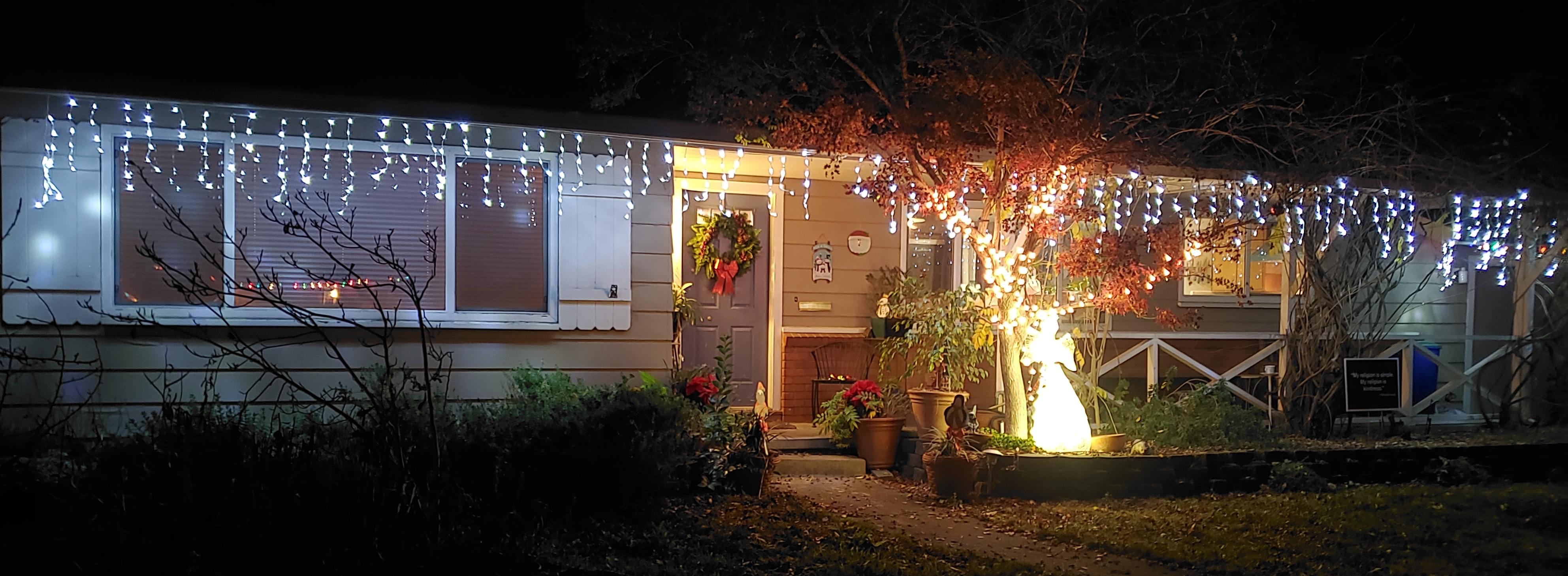 Being the exercise nut and climate-concerned-citizen that I am, I’m doing these explorations on foot or by bike only. I’ve now done a few after-dark walks, including some along streets so well known as the local hotspots for holiday-lit houses that they have quite literal traffic jams after dark. One’s a dead-end street, so the cars take longer to make it to the end of the street and back than most walkers do – spewing noxious fumes the whole time, thanks very much. But for you, dear readers, it was well worth the excursion. These few forays have given me the usual overload of photos to show you. I’ve edited them down a fair bit but there are still tons. There’s more to come in the days ahead, more specialized and even a video edition to look forward to. I’m going overboard on this particular post for the simple reason that today, when I’m posting it, will be the shortest day this year here in North America. So enjoy these lights and the knowledge that our days will steadily be growing longer in the weeks ahead.