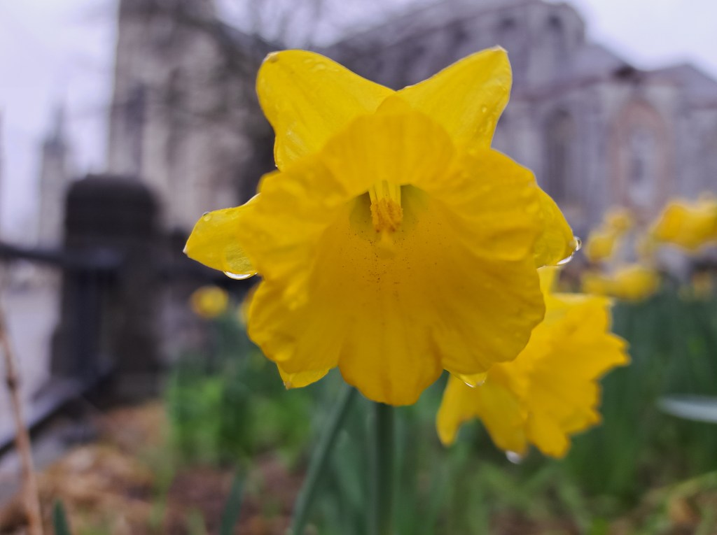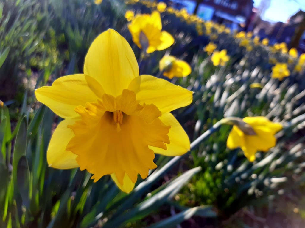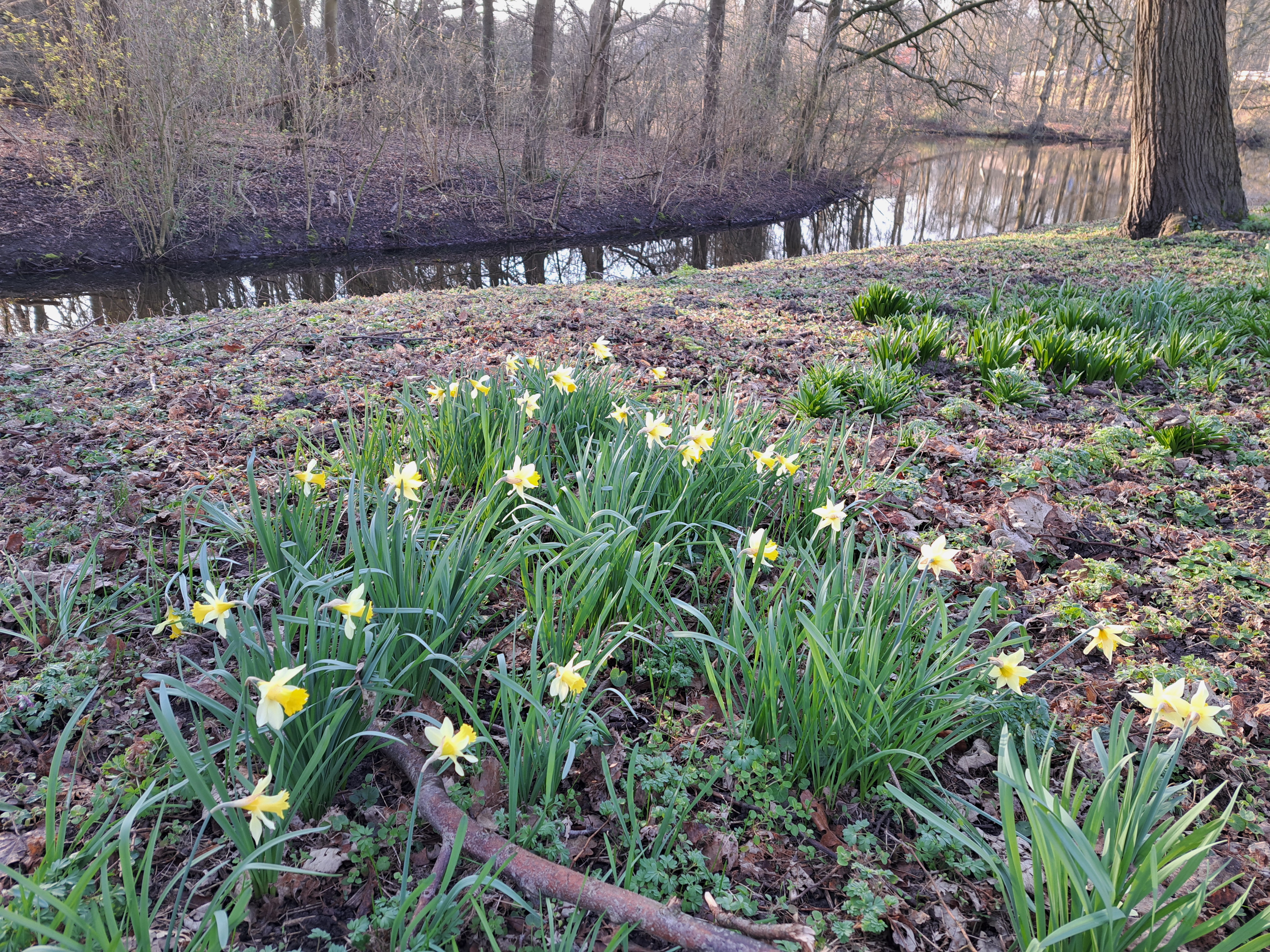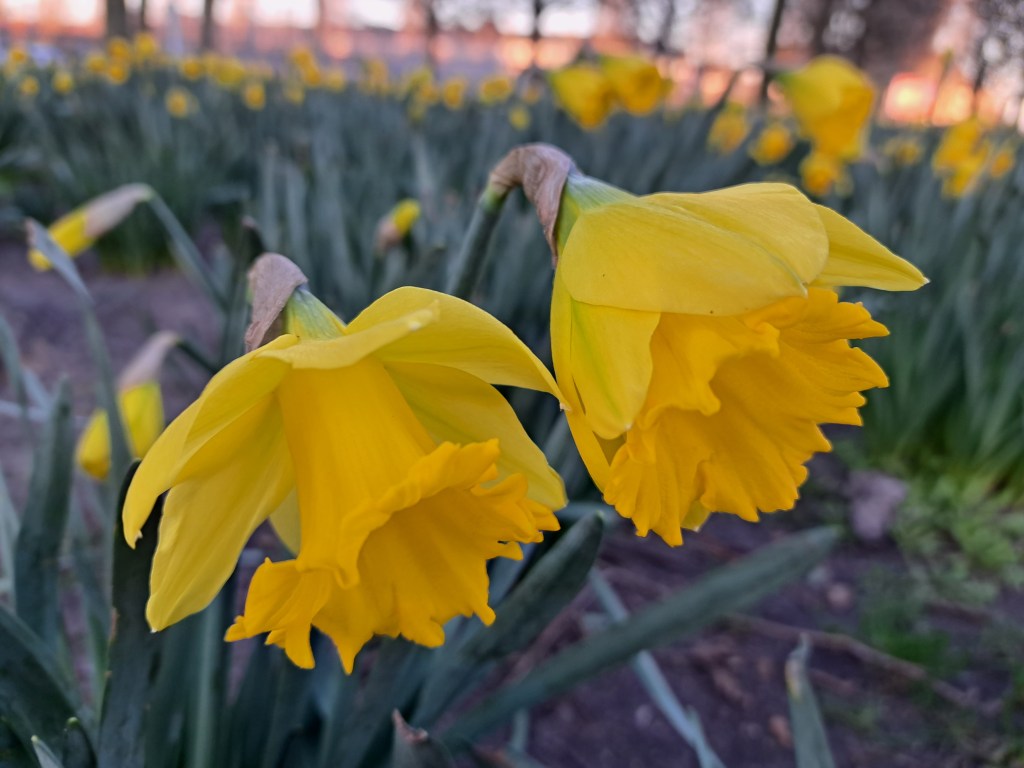 When I resumed posting last week, I started with daffodils photographed several weeks earlier, on March 7 on my way to work. Then, biking home from two lovely hours of doubles with friends late on Tuesday the 2nd of April…what should my eyes see but this lovely patch of flowers (are these daffodils? jonquils? something else?) lit by the late-evening sun.