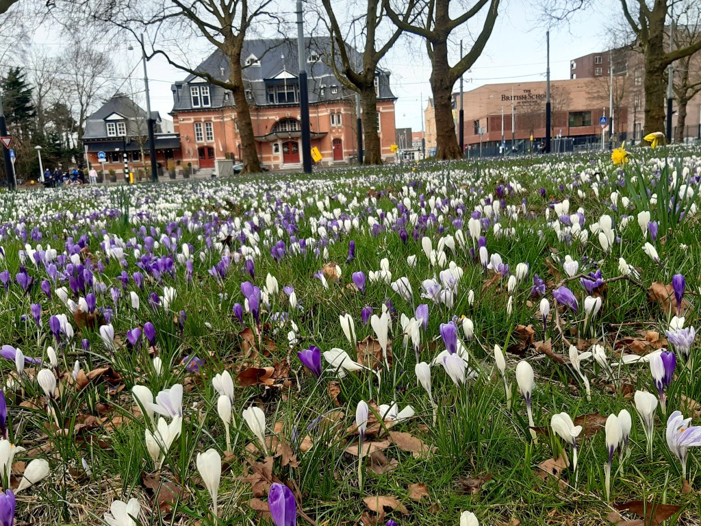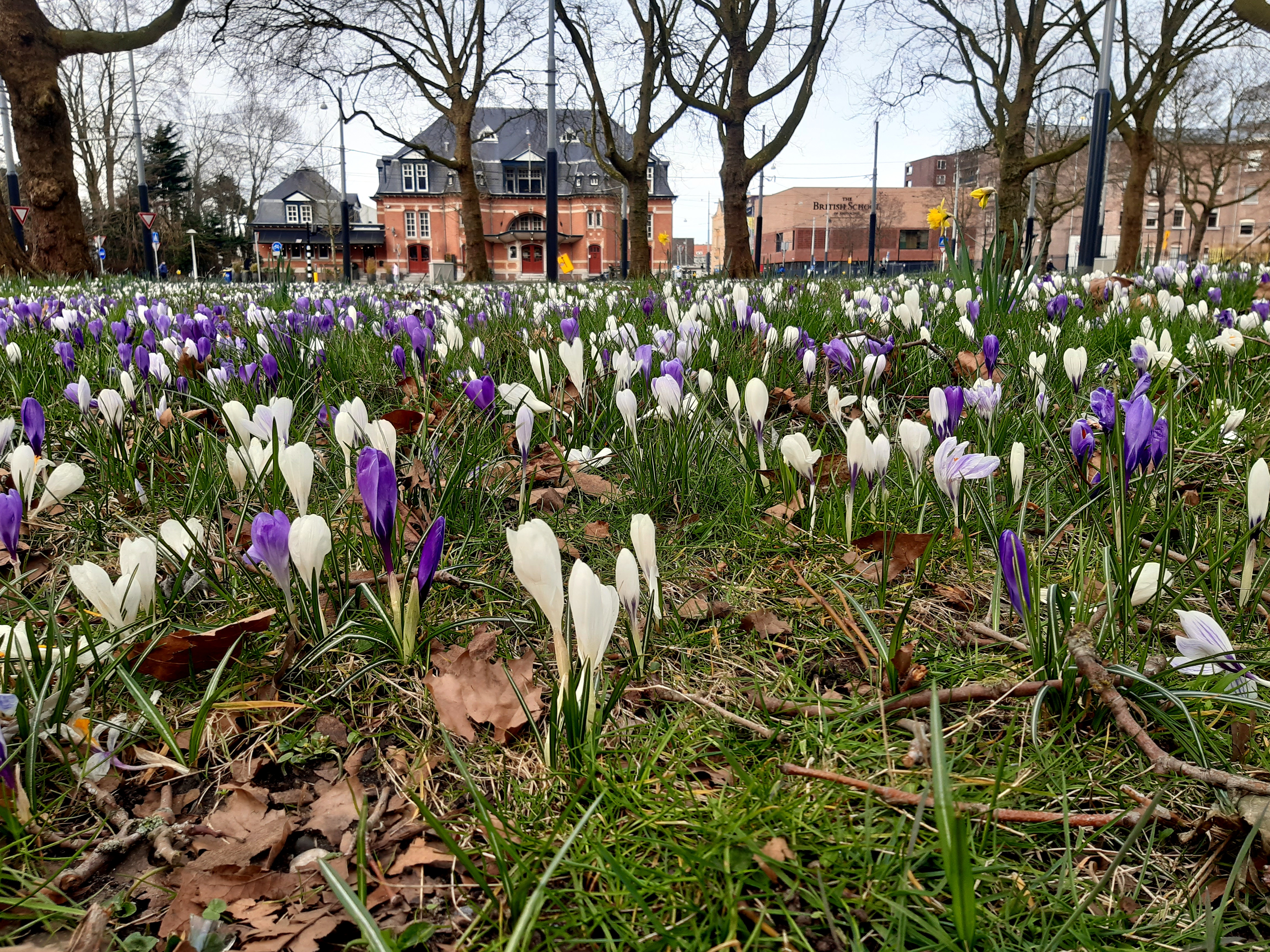 My brother’s just finished a week-long visit during which the sun shone every day, ever more trees and bulbs burst into bud and flower, and the crocuses in this lovely central traffic circle (visible from my windows, as well…) just kept on blooming and blooming. I snapped these yesterday morning while walking back to my place, after seeing him onto the bus to the airport. And the one below, a full nine days earlier – as you see, these crocuses just keep on giving :-).