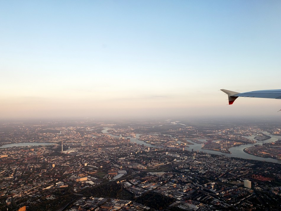 Clearly, I fly a great deal. And clearly, I like to look out the window, dream, and see the world from a new vantage point. At left: the salt-evaporating ponds full of bacteria along the shores of San Francisco Bay, shortly before landing in April. Below: Hamburg and its major harbor along the Elbe, shortly after takeoff in September. In the three galleries lower down: more of the lovely colorful salty ponds plus a few shots from a late-May flight into SFO when sky was clear enough to see over the peninsular mountains to the Pacific Ocean; more of Hamburg as well as clouds above London and easternmost England, later on that flight; and then a trio taken while flying into SFO again from Dallas, in September. And at the very bottom, a large photo showing both some salt ponds near San Jose, as well as the mountains on the peninsula and the sky over the Pacific Ocean at sunset. There are reasons I’m always happy when I fly home to the Bay Area :-).