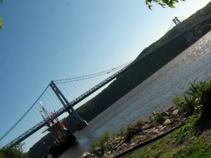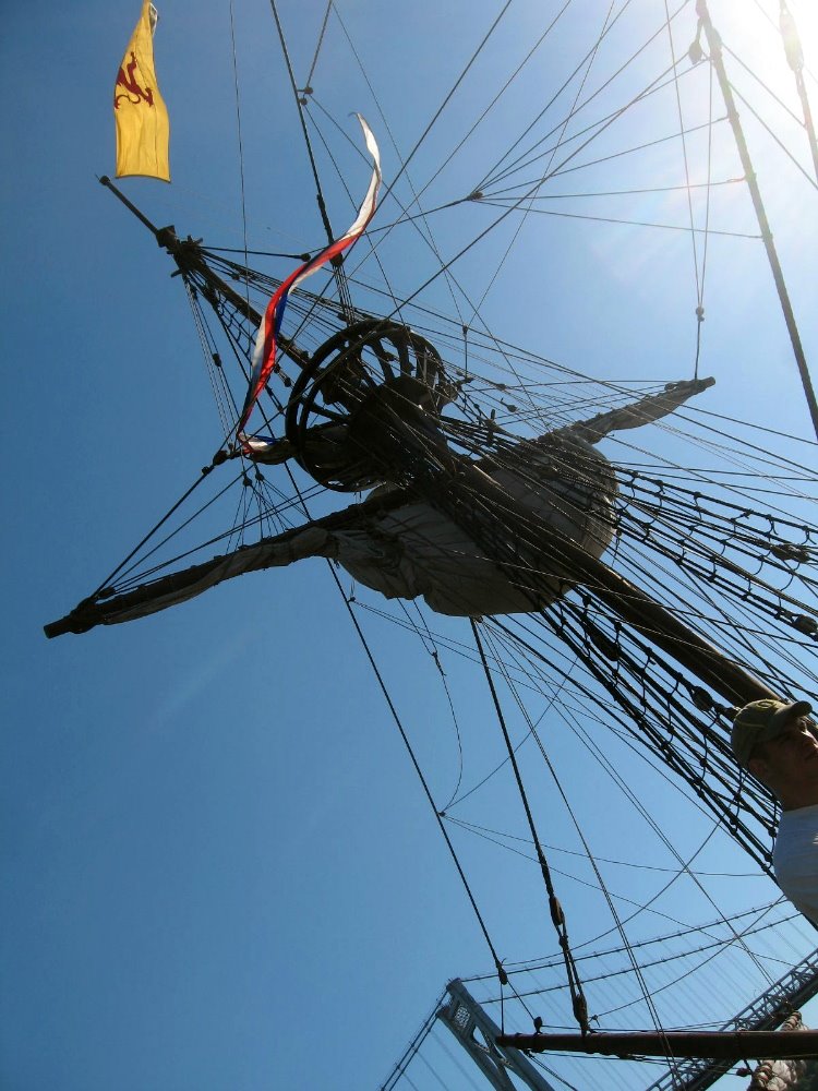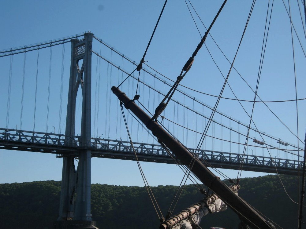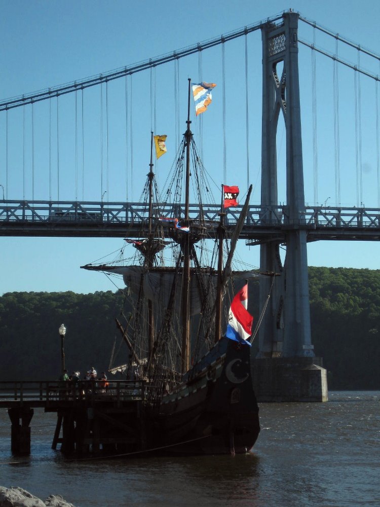 Above, the Roosevelt barn & garage in classic Dutch colonial style. Below: 2009 is the 500th anniversary of Henry Hudson’s voyage up the Hudson, which made him the first European to explore and map the region. This ship is a close replica of Henry Hudson’s ship Half Moon, which is doing a tour of historic towns in the Hudson region from Albany south, in honor of the 500th anniversary of European arrival on these shores. As you can see, I fell in love with how the rigging of the ship looked against the rigging of the (Franklin Delano Roosevelt) Mid-Hudson bridge, which connects Poughkeepsie (east side) to Highland (west side).