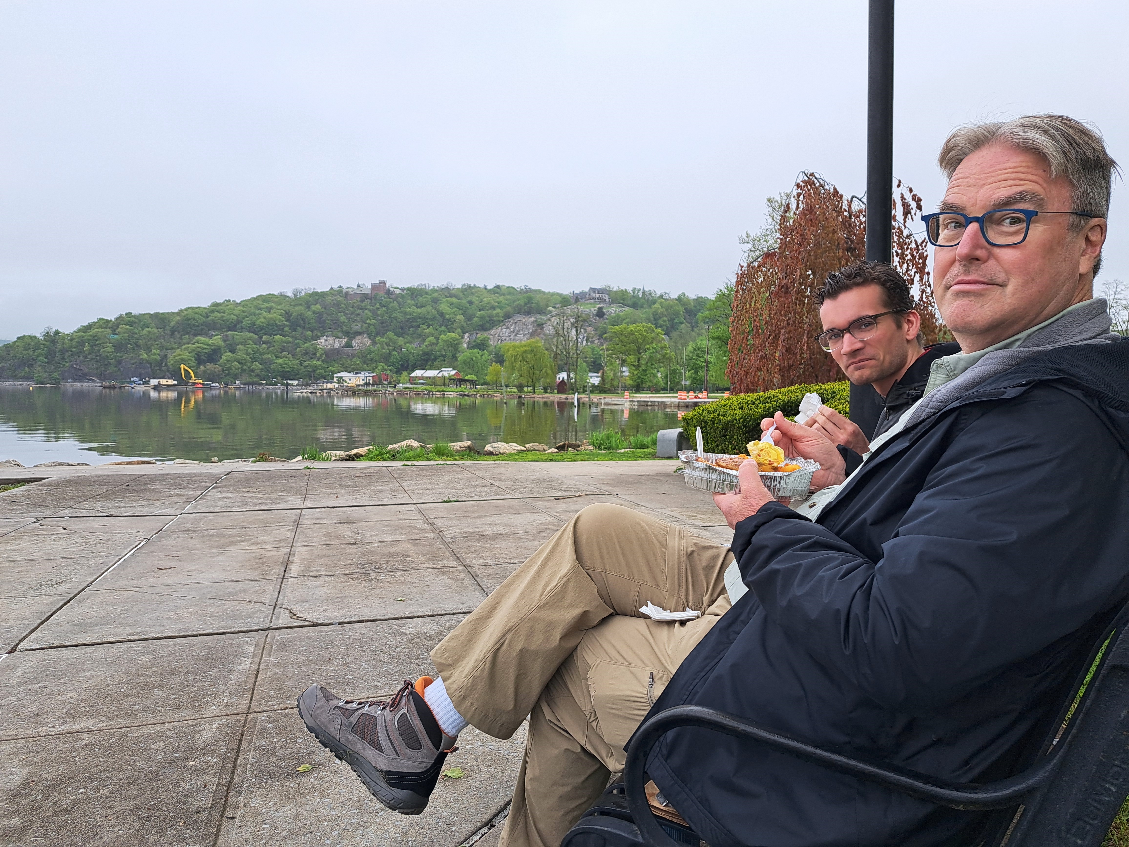 Above, the Bear Mountain Bridge with the mountain named Anthony’s Nose to its right, on the east side of the Hudson River. At the bottom, and in the gallery below, Bear Mountain Inn & the mist-shrouded Bear Mountain (on the east side of the river) as seen on the misty, drizzly afternoon of Sunday May 5th when Steve & I arrived. We were here for another personal celebration of our mother, who hiked us as teenagers across that bridge, where the Appalachian Trail crosses the Hudson River and immediately climbs to the top of the Nose, having already scaled Bear Mountain and various other peaks in both Bear Mtn Park & the neighboring Harriman State Park. To really focus on our memories of the trails and be close to Storm King (which, yes, we’ll be showing you also soon), we splurged to stay in this lovely old Inn – and were so happy that cousins Sam & Maria also joined for the Mom-celebration stuff, that Neal and Elizabeth came for an evening, and Chris for the Storm King day. Thanks, everyone and especially Mom who was certainly with us in memory and spirit :-).