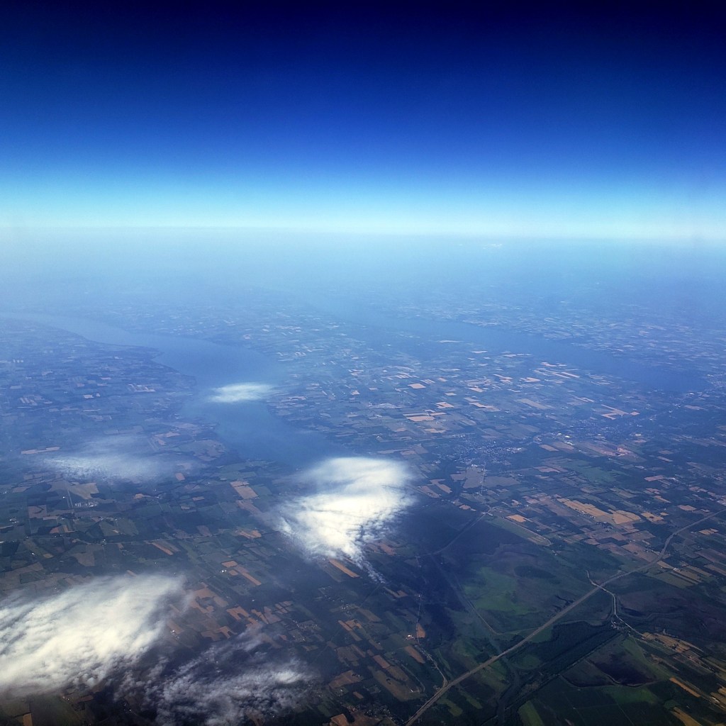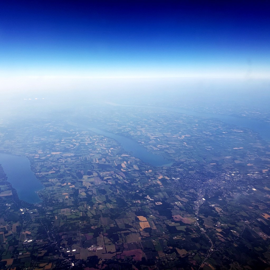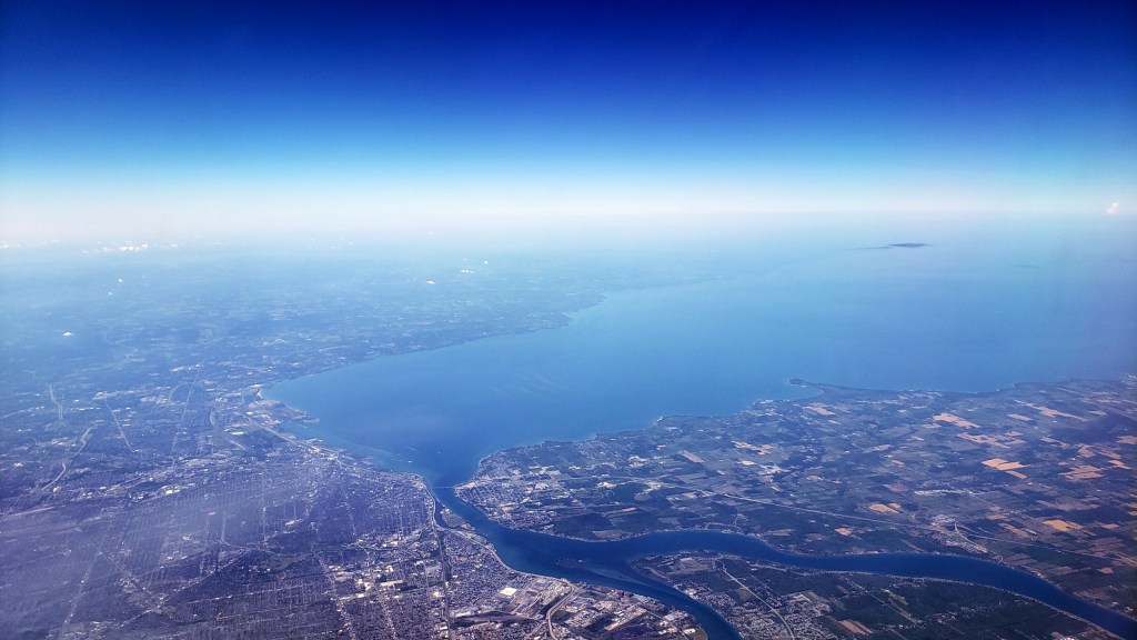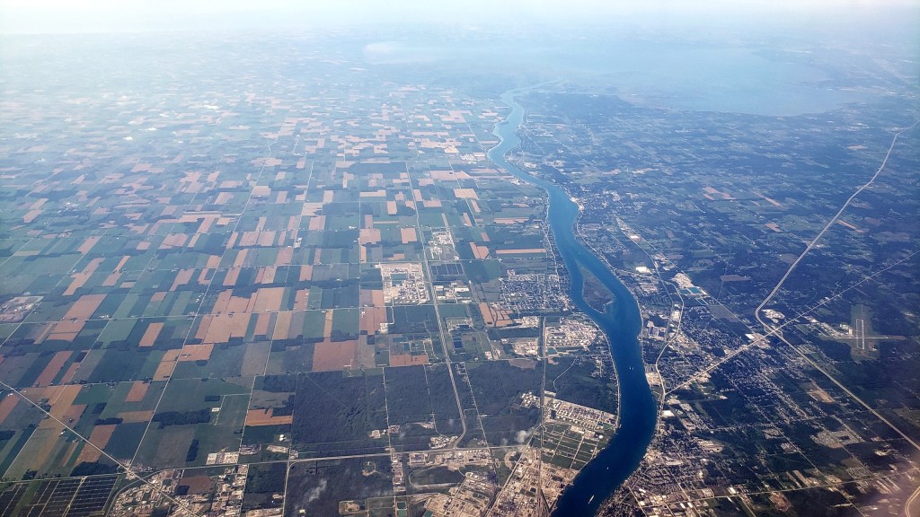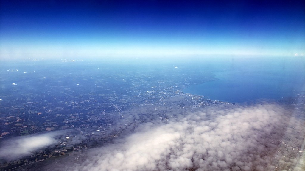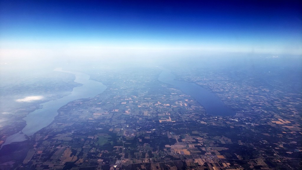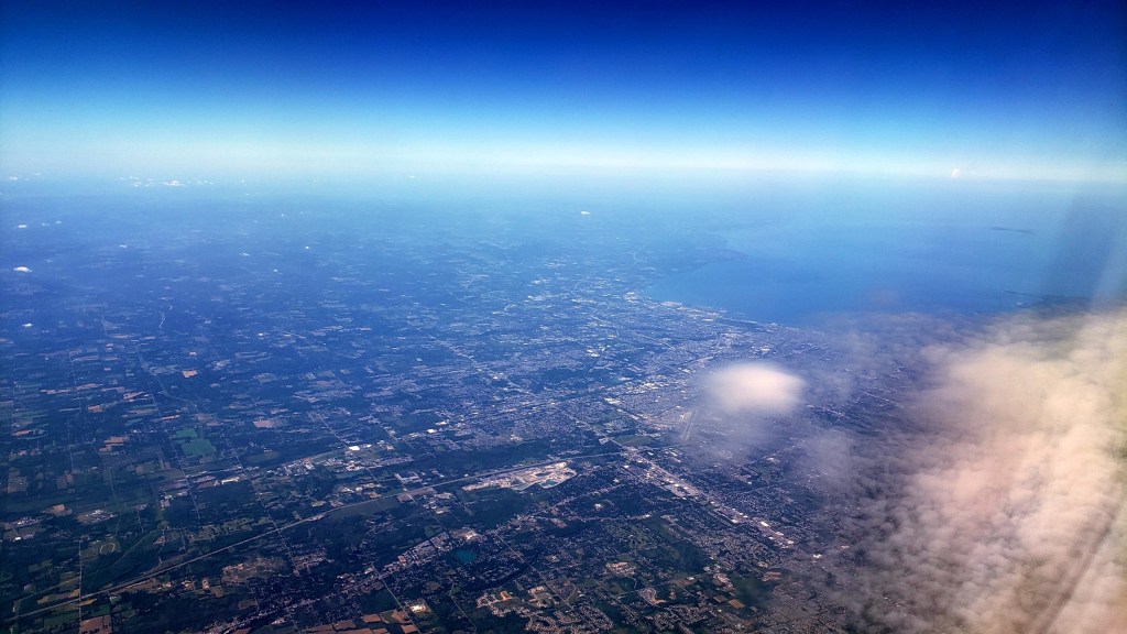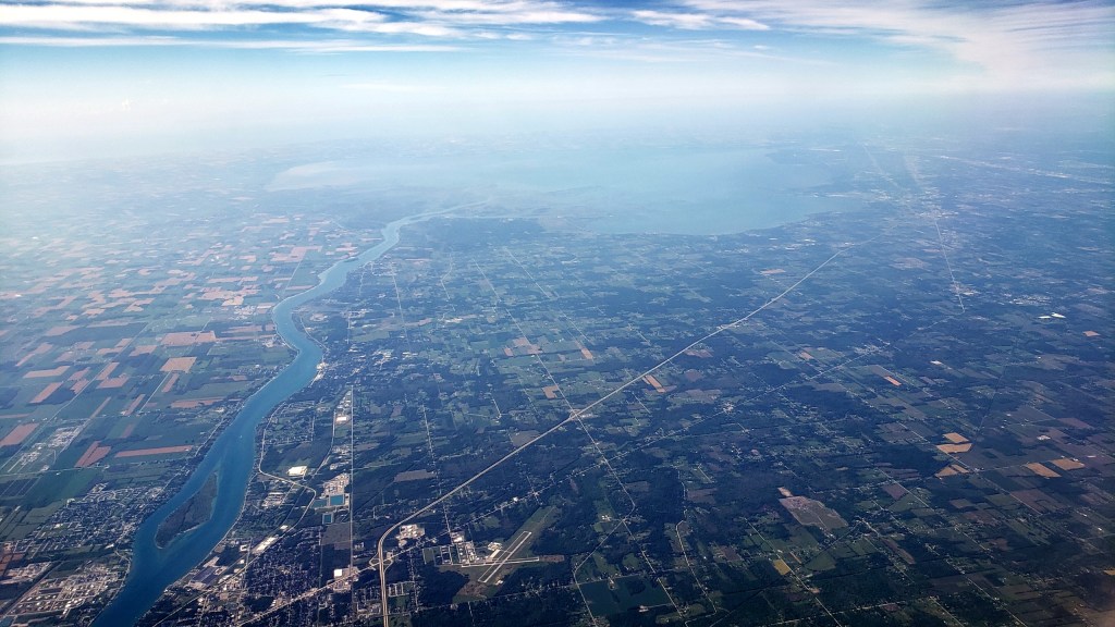 Regular readers and friends will have figured out that, in this smartphone-in-your-pocket era, I’m always on the lookout for views lovely, strange, new, interesting or otherwise engaging to photograph. Unlike most airplane travelers, I stare endlessly out the window when I’m fortunate enough to have a window seat. Below are shots, mostly in chronological sequence, as my plane from Boston to Chicago flew along the northern edge of the Finger Lakes in NY State, over Buffalo (pictured also in the out-of-sequence large photo at the top of this post), then over the southernmost part of Ontario in Canada, between Hamilton & Detroit, then across the US state of Michigan, the Great Lake named Lake Michigan…and north of a fog-and-rain-bound city of Chicago, into O’Hare airport. For readers who’ve not explored the Great Lakes regions of the US and Canada, or the Finger Lakes region of New York State – do. There’s a lot to see and do. 🙂