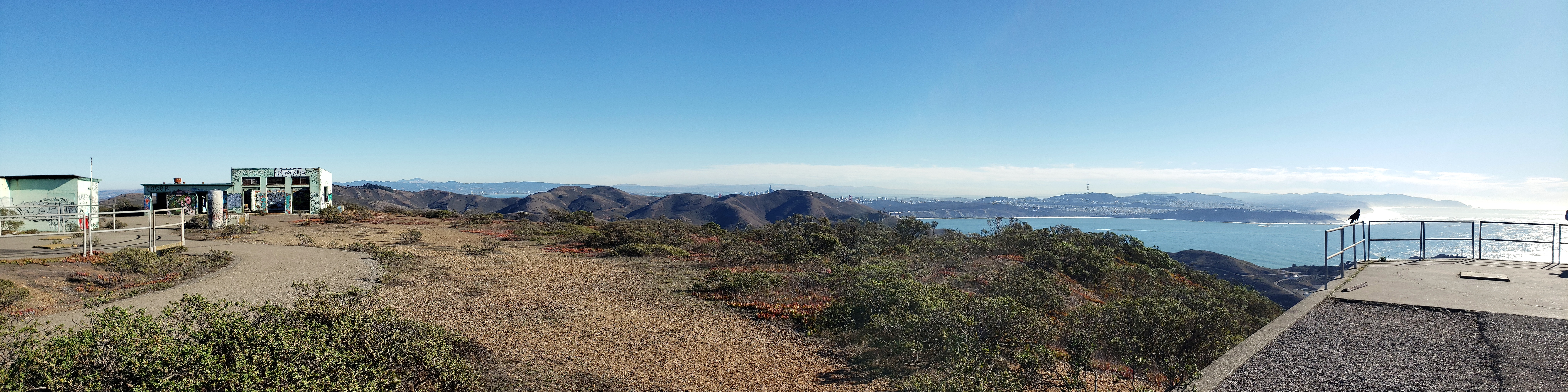 In the midst of those beautiful hills & vistas I showcased to start our year yesterday sits Hill 88. On which sit these abandoned buildings from some past military radar or other installation about whose purpose I know nothing more. These buildings, while being slowly eaten by natural processes, for now provide ample canvases for graffiti artists. The first photo above, I must say, makes me think of Keith Haring and what things were like in NYC in the 1980s… (If his name is new to you, look him up.) To orient you, in the panorama just above you see – from left to right – the east bay with Mt Diablo (two bumps just to the right of the graffitied building), running to the SF skyline (including tops of the towers of the GGB, if you look closely enough) then the hills and Pacific Coastline along the peninsula.