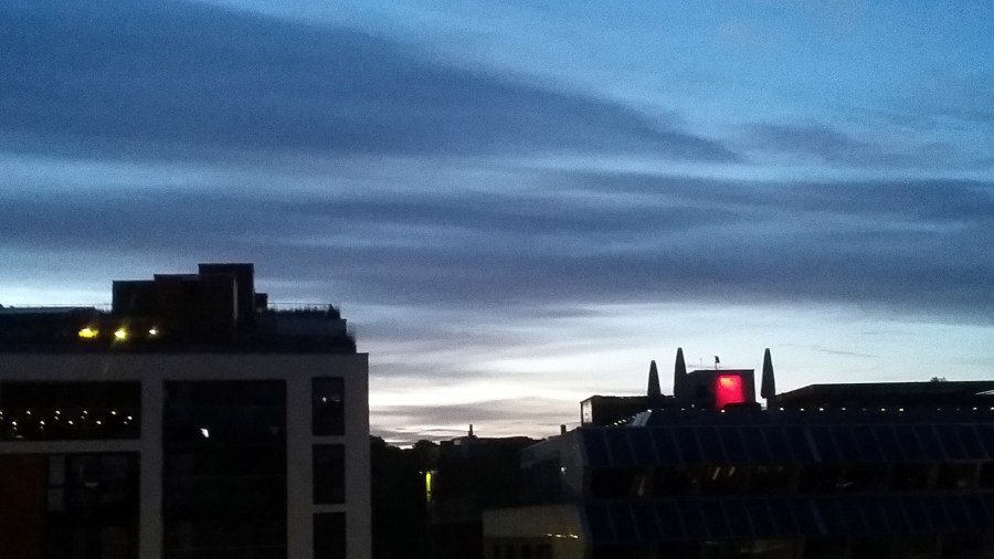 This photo of clouds against a darkening blue sky was taken just after 21:00 (9pm) on June 20th, while the next shot of a dark-ish sky over buildings was taken just past midnight. Fun 🙂