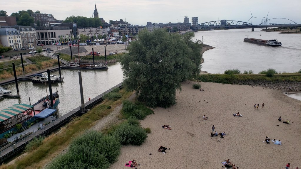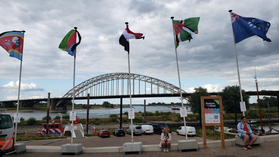 Last shots from Nijmegen, including international flags along the riverfront which I assume were there for the opening and closing ceremonies of the Eurogames, an LGBTQI+ – oriented (but naturally welcoming to all) sports festival and competition at which yours truly took home a “bronze medal” in the (very, very small) draw of men’s singles that I had joined. Those games and playing a ton of tennis while watching many friends play tennis (and many others whom I don’t know play soccer, volleyball and squash) took up most of my time during those days in Arnhem and Nijmegen back in July. You’ll see a few more shots pertaining to the games — including the list of sports planned for next year’s event; see if you can spot the sport which demonstrates life imitating art… Immediately below, a few more highlights from Nijmegen’s excellent and well situated museum (yes, same bridge – it’s on the bluff above the river).