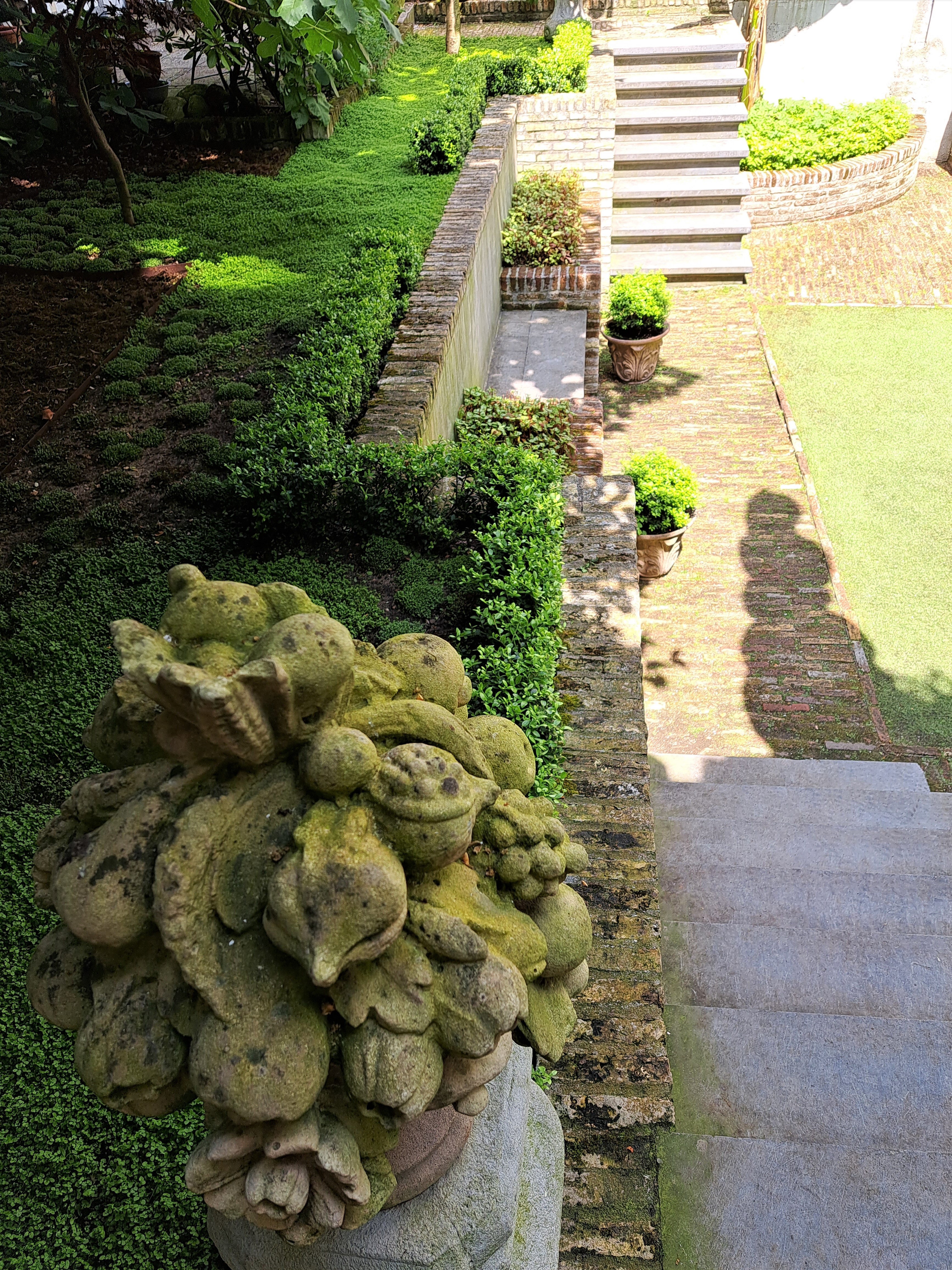 And another set of images from a single garden, behind a building which has an interesting history documented in the middle photo of the three-photo gallery just below. (Note: if you don’t see all these images on your small-screen, try again with larger screen or a different browser.)