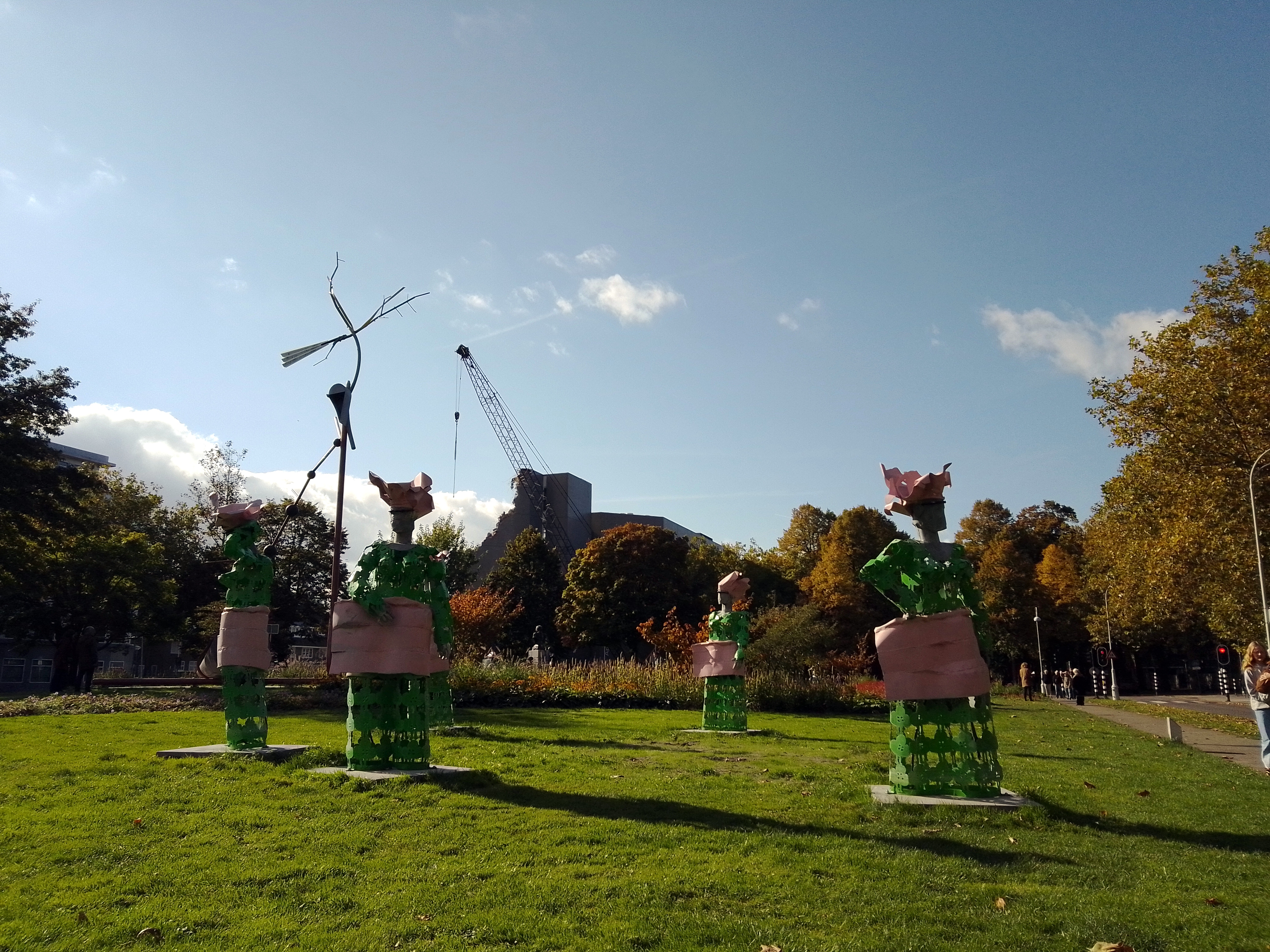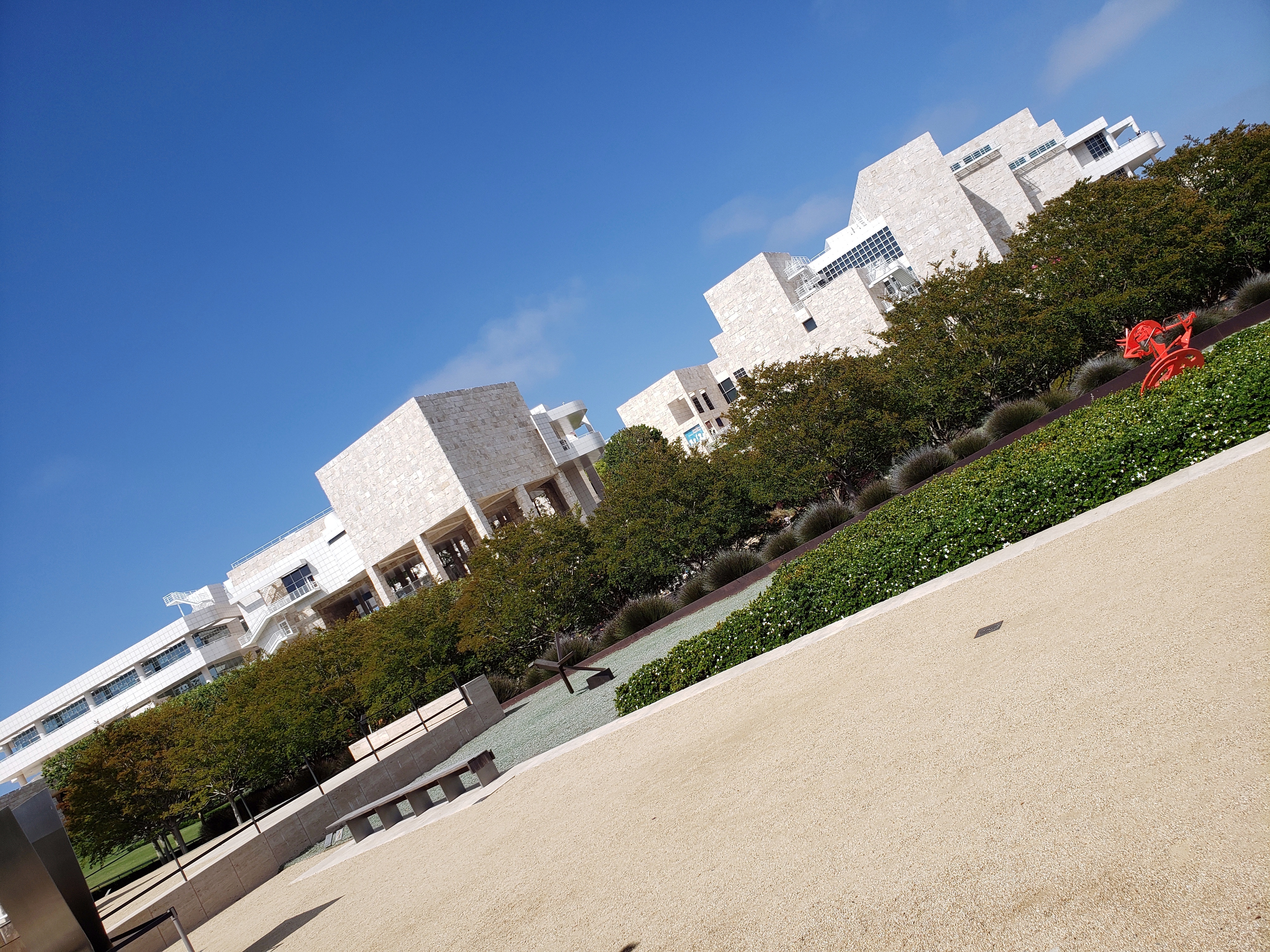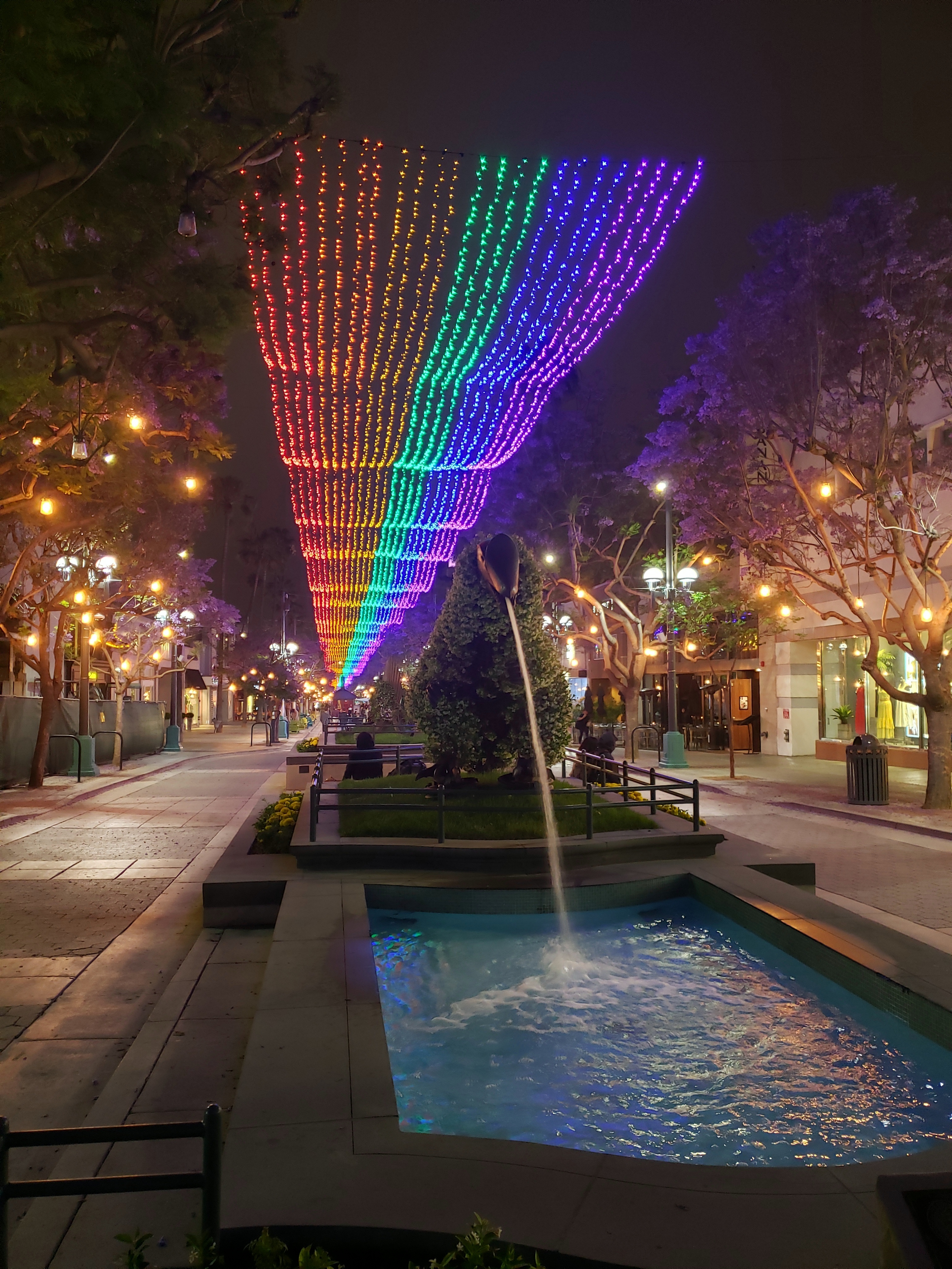 was to visit dear friends and pick up a car from them, with which I then drove back home to the bay area and renewed my acquaintance with that quintessentially American experience, the long road trip in a big car on good roads with music blasting and the miles going by rapidly out the window. It was lovely. Even more lovely were the the (too) few days I enjoyed in LA with a few friends. Several hours one day were spent with a visit to the Getty Center, perched on its hilltop in the Cahuenga pass – the first time I’d been up there since a wonderful trip with Mom in early 2013, during which we watched an outdoor dance performance taking place all across the sprawling grounds and gardens. (See photos of that performance, and of Mom enjoying the grounds with our cousin Pat, here: https://somuchworldsolittletime.com/2013/04/15/creeks-peaks-streets-malingering-in-la/ Since then, they’ve added more outdoor sculpture around the gardens which I (and Mom) always loved…meaning she’d have loved it all even more now, so I made sure to enjoy it extra much in her memory :-). It was also pride month, and Santa Monica marked the occasion with seasonal lighting on the Third Street Promenade. Capitalism at its best, eh?