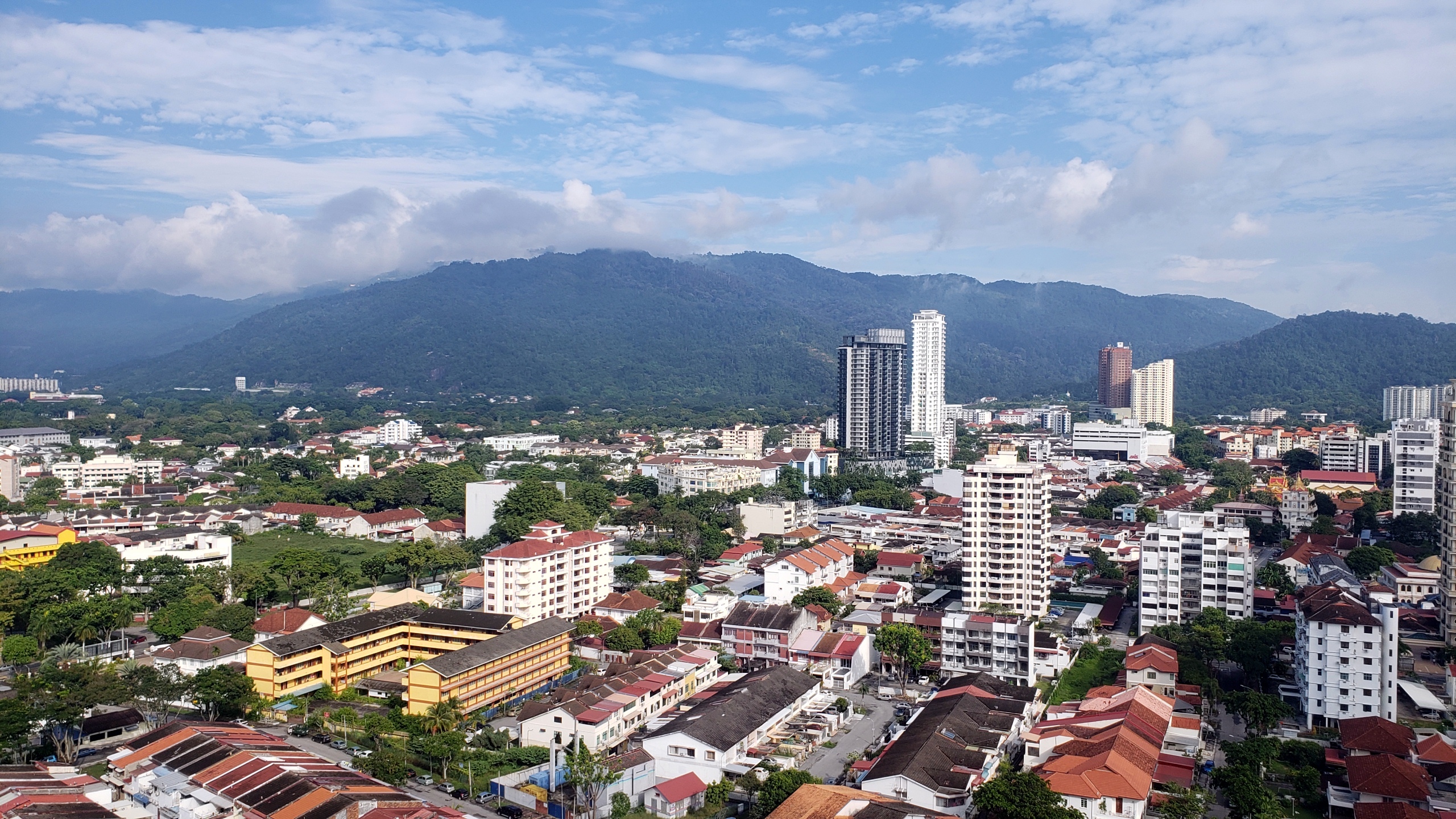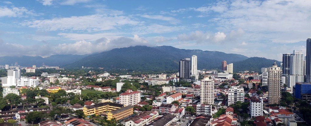 Above: George Town & mainland Penang State as seen from top of the hill. Below: two views of the hill as seen from the 20th floor of one of those buildings near the water, above….
