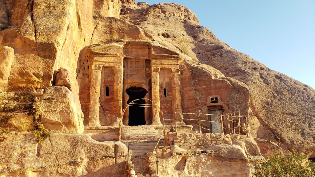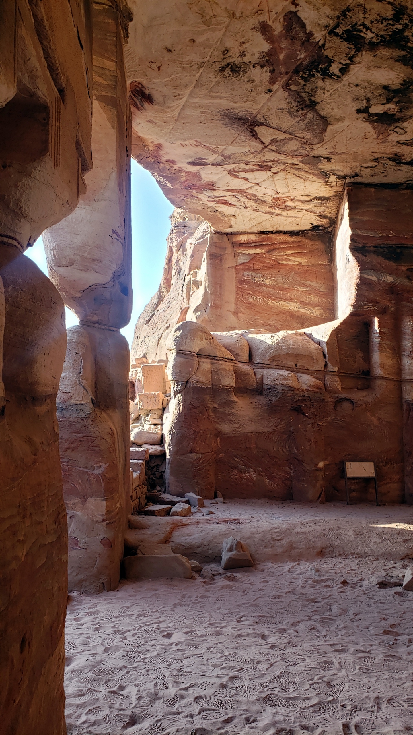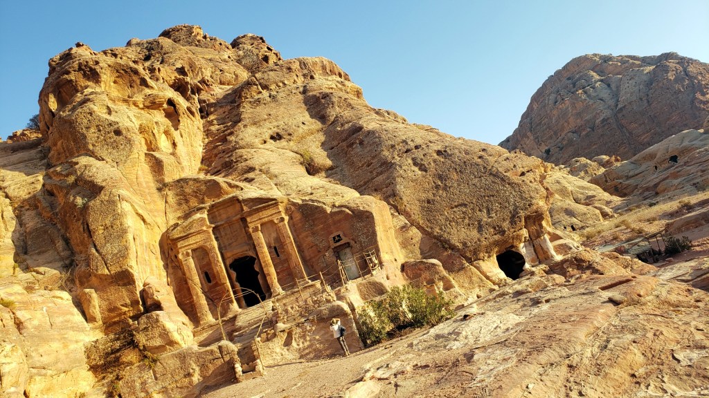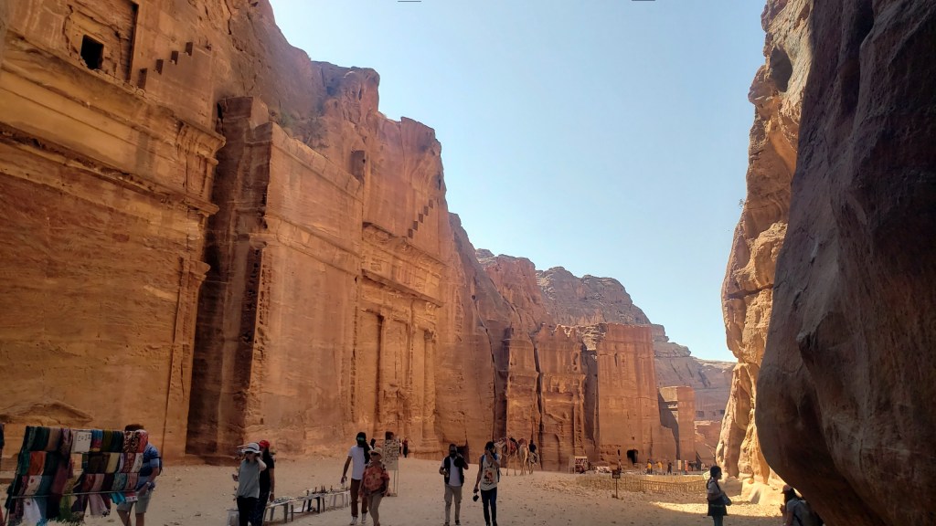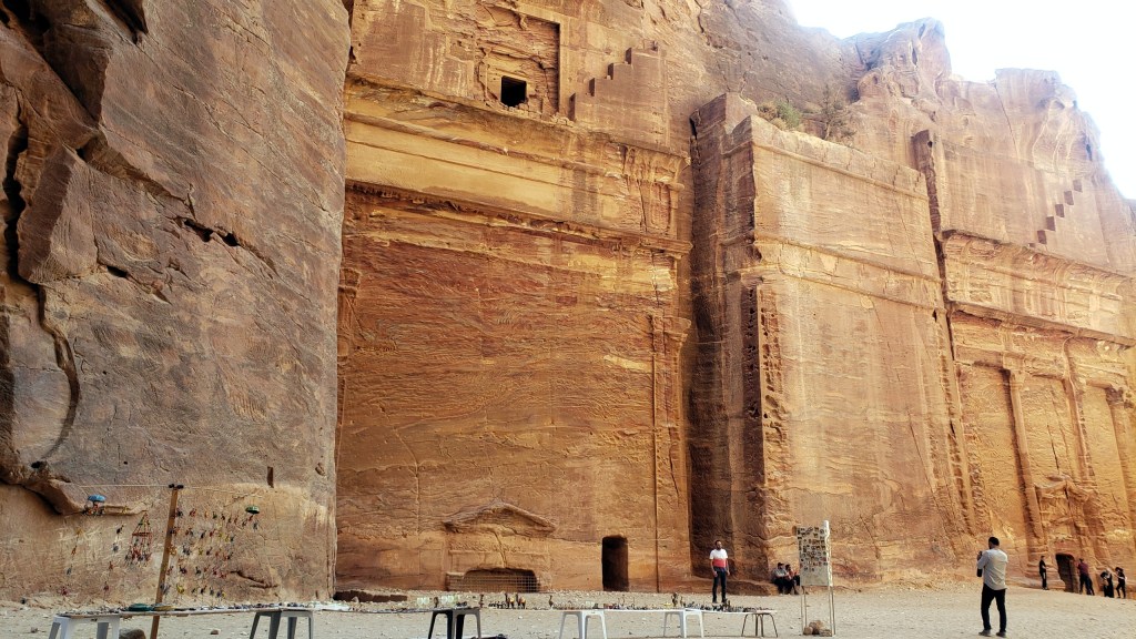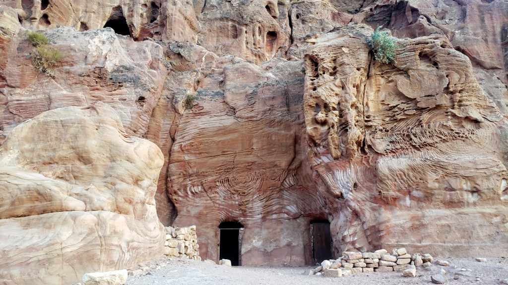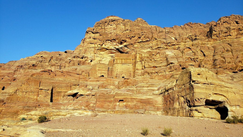 This shot was taken from Painted Triclinium, looking at Roman Soldier’s tomb: both on the Wadi al Farasa side trail, below the Garden Tomb of which I posted many photos in Petra.4. Your first view of Painted Triclinium came with Petra.7 — and I believe the colors are all natural rock, not actual paint. But I didn’t scratch to see :-). There will be more of Painted Triclinium ahead – it’s off the main path, so less noticed, but truly remarkable. As I sort and set up this post, it’s a week since I flew out of Jordan back to A’dam, and two weeks already since my full day inside Petra. I’m so grateful for the many kind comments and emails you’ve sent! I’m doing precisely what I recommended to you, my readers: looking at the map, checking the time stamp on the photos themselves, and reminding myself what I did when. I have to finish sorting and naming all of these before I forget! And there are so many! It’s an endlessly amazing place! And I barely showed you one photo of Amman, a week ago…and have not yet even given you a glimpse of Jerash!