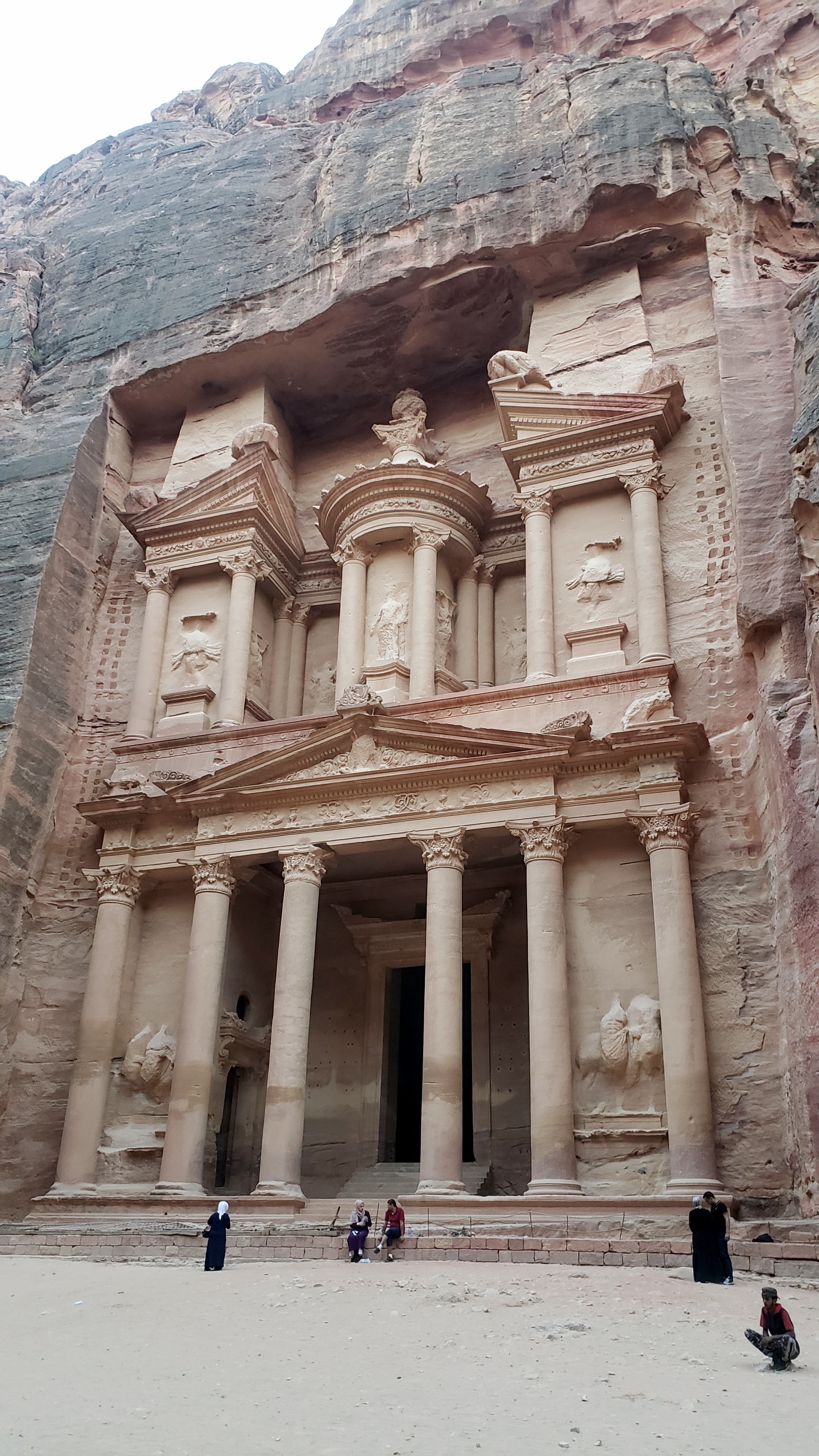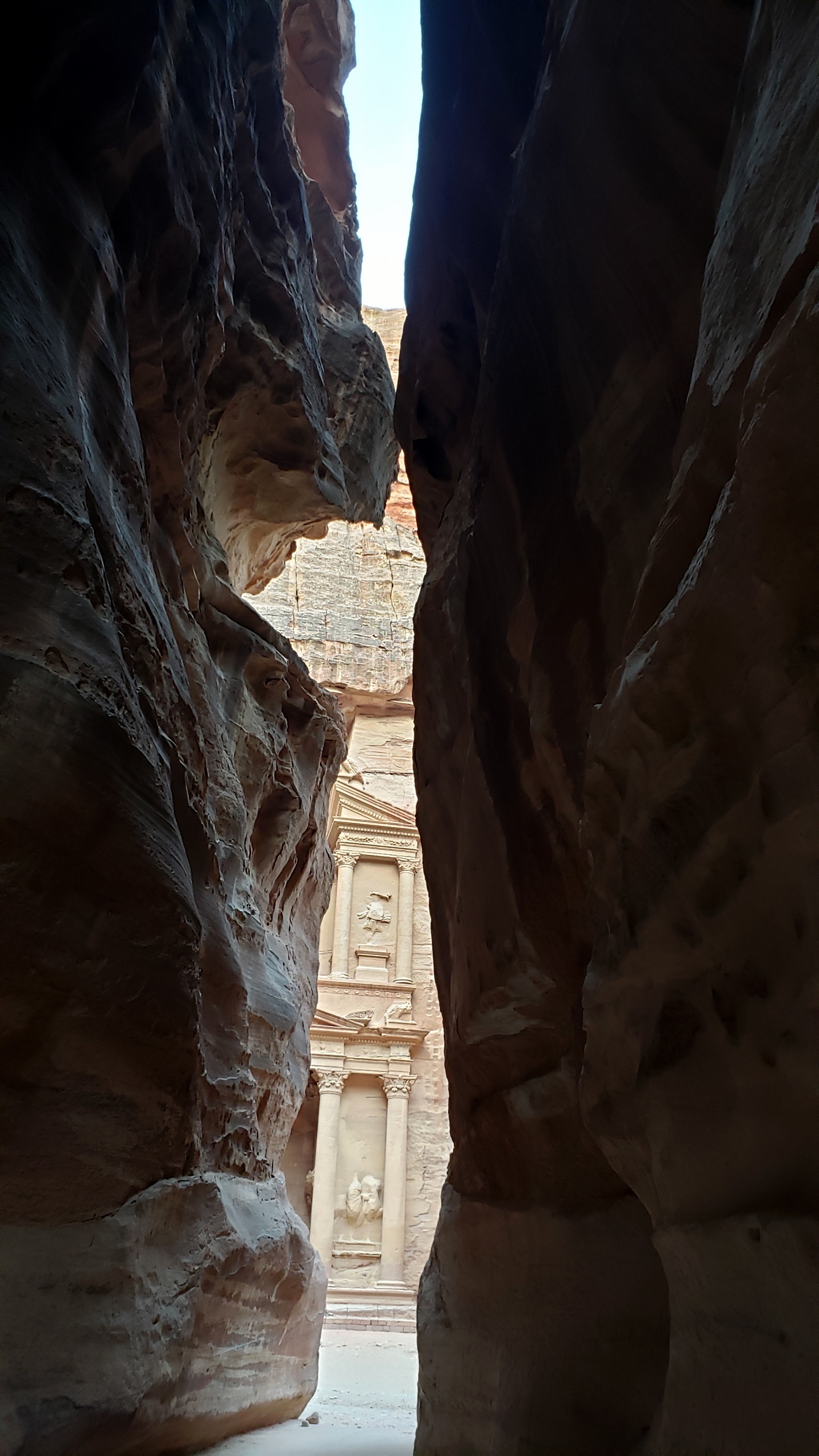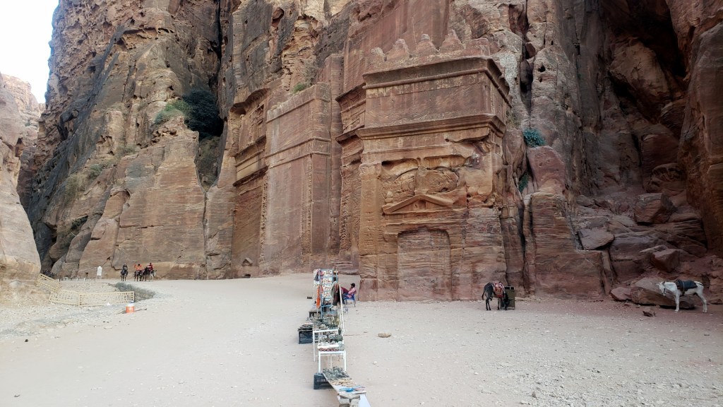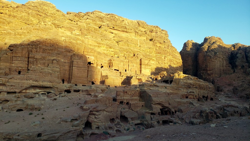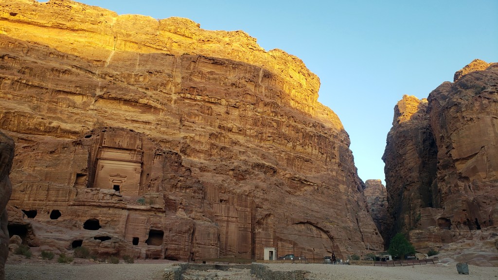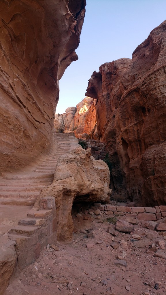 Above: I spent five hours Friday exploring the many things that I’ve already shown you. There are still more images to go from that remarkable afternoon, but this is an exhausted me seeing a beautiful image as I walked away from what you can see below, on my way back to dinner at the hotel. (Remember I’d awoken super early in Suli that morning, flown to Amman and had the long drive down to Wadi Musa, then walked up and down for five hours!) Below is the start of my Saturday morning, looking in to the building called “The Treasury,” quite early so there weren’t very many people around yet. I was on my way to a hilltop perch from which I then waited and enjoyed peace and still as the sun slowly but steadily rose high enough shine directly on this building. This is the most famous and photographed single building in Petra. Discovering it for the first time, with this image as you end your mysterious and atmospheric walk through the canyon of the Siq, is quite inspiring. There are more images of this building to come in future posts. But I figured you were owed at least one early – if partial – glimpse of Petra’s most famous building. 🙂 And for fairness, below that is the image I took just before the image above: one last glimpse of the Treasury before beginning the walk back up the Siq towards town, a meal, a bed.
