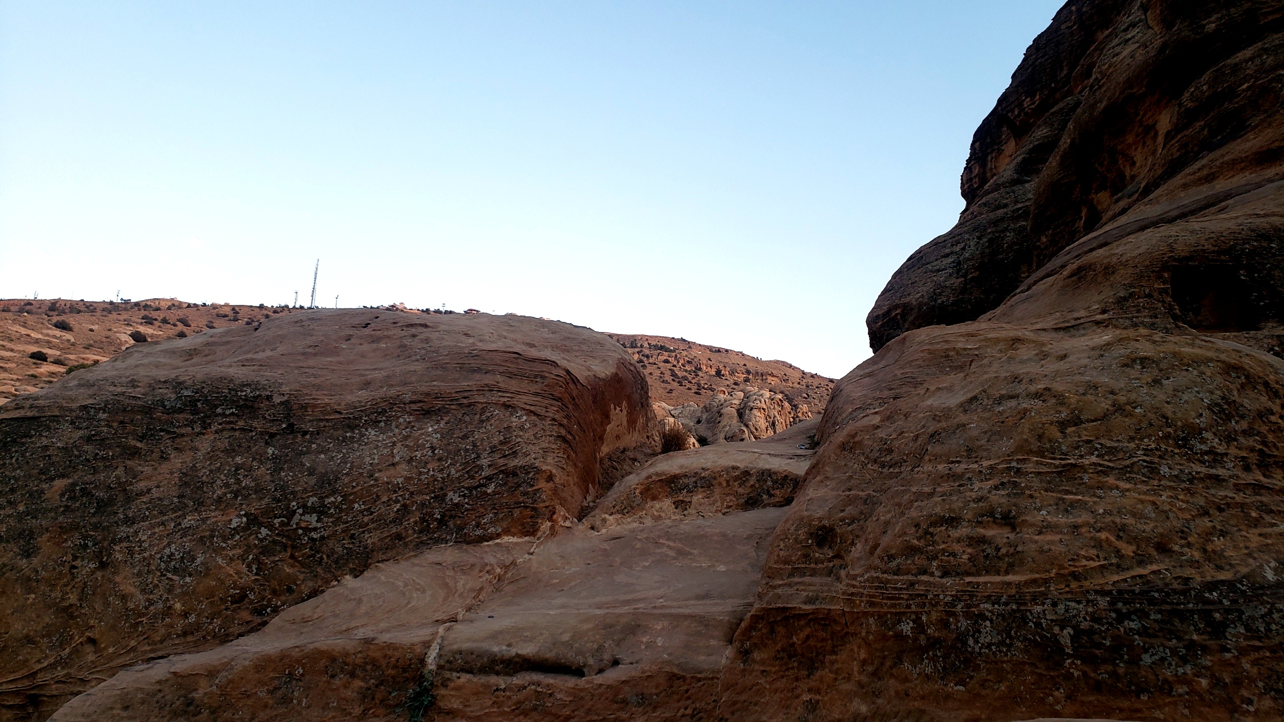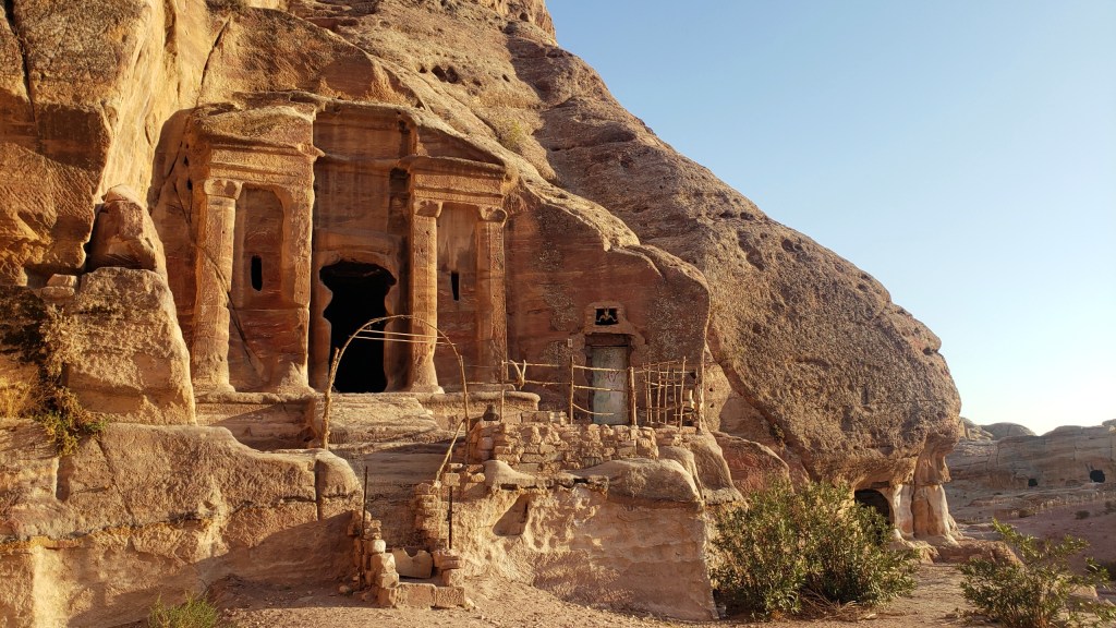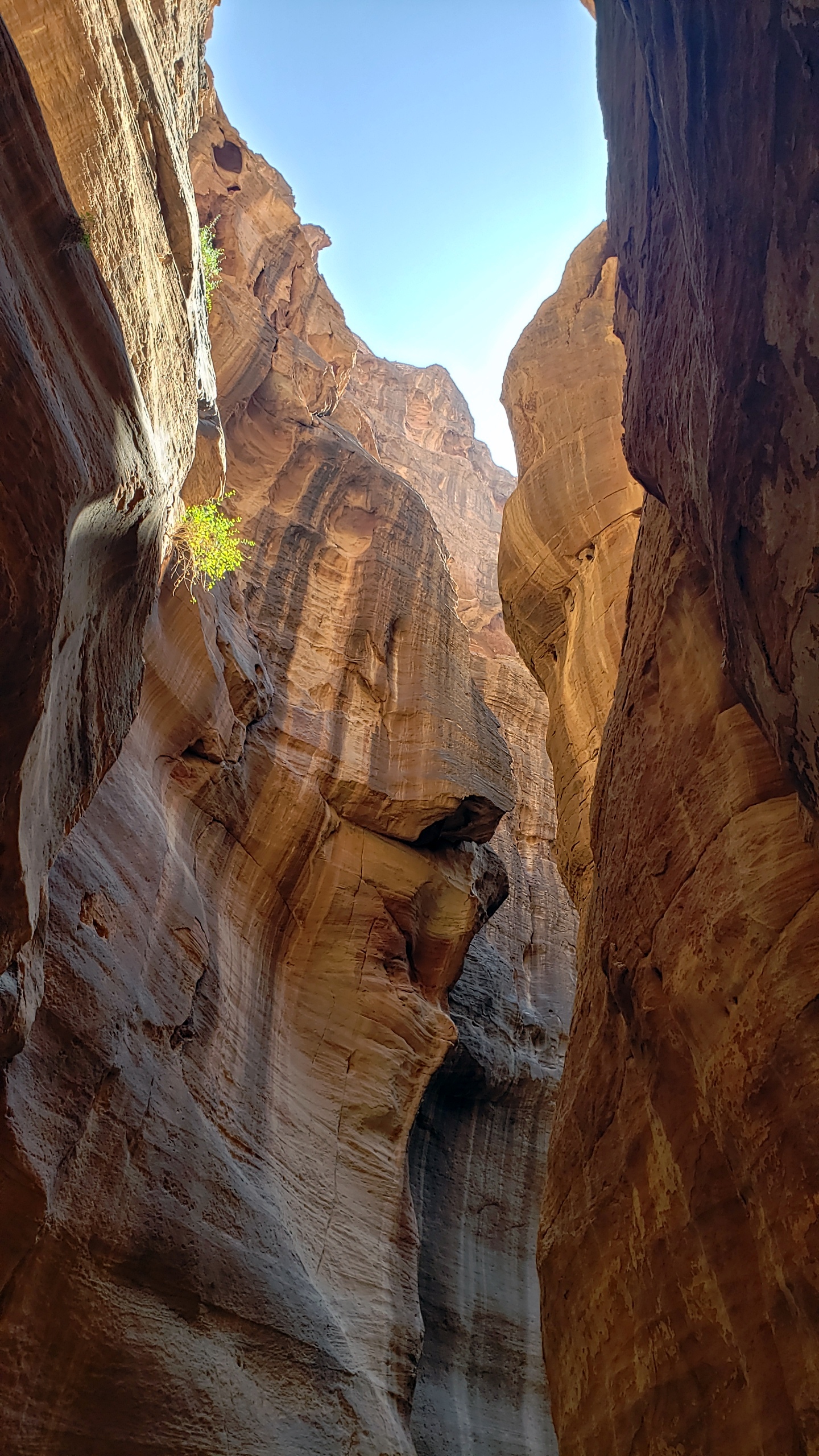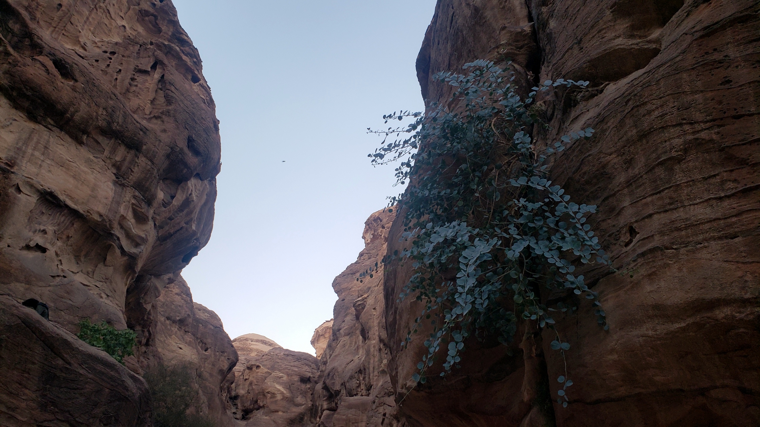 Above: I spent five hours Friday exploring the many things that I’ve already shown you. There are still more images to go from that remarkable afternoon, but this is an exhausted me seeing a beautiful image as I walked away from what you can see below, on my way back to dinner at the hotel. (Remember I’d awoken super early in Suli that morning, flown to Amman and had the long drive down to Wadi Musa, then walked up and down for five hours!) Below is the start of my Saturday morning, looking in to the building called “The Treasury,” quite early so there weren’t very many people around yet. I was on my way to a hilltop perch from which I then waited and enjoyed peace and still as the sun slowly but steadily rose high enough shine directly on this building. This is the most famous and photographed single building in Petra. Discovering it for the first time, with this image as you end your mysterious and atmospheric walk through the canyon of the Siq, is quite inspiring. There are more images of this building to come in future posts. But I figured you were owed at least one early – if partial – glimpse of Petra’s most famous building. 🙂 And for fairness, below that is the image I took just before the image above: one last glimpse of the Treasury before beginning the walk back up the Siq towards town, a meal, a bed.