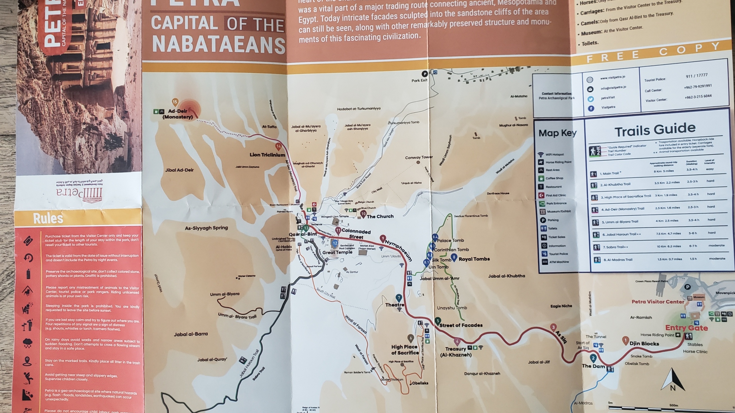 Further down, I’m posting a photo I took this morning of the official map you get upon entry. The main red path indicated on the map, which is basically at ground level from Entry Gate to Qasr Al Bint, is said to be 4km long.