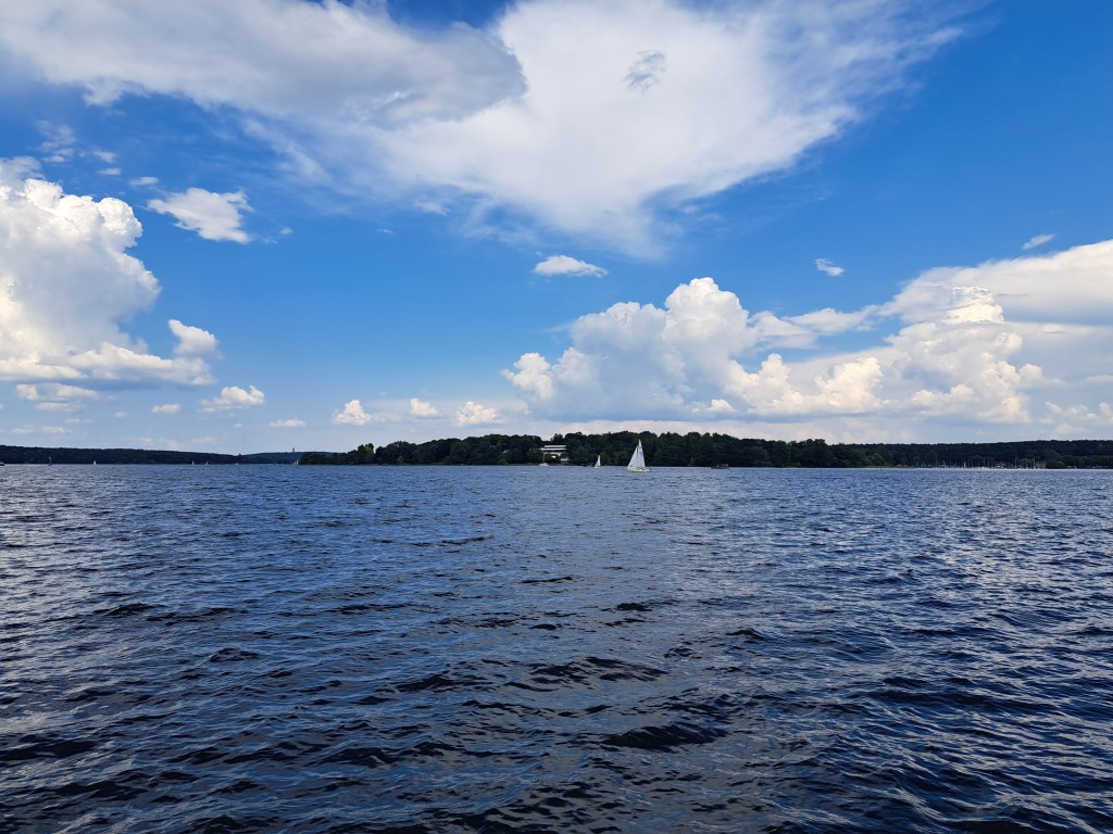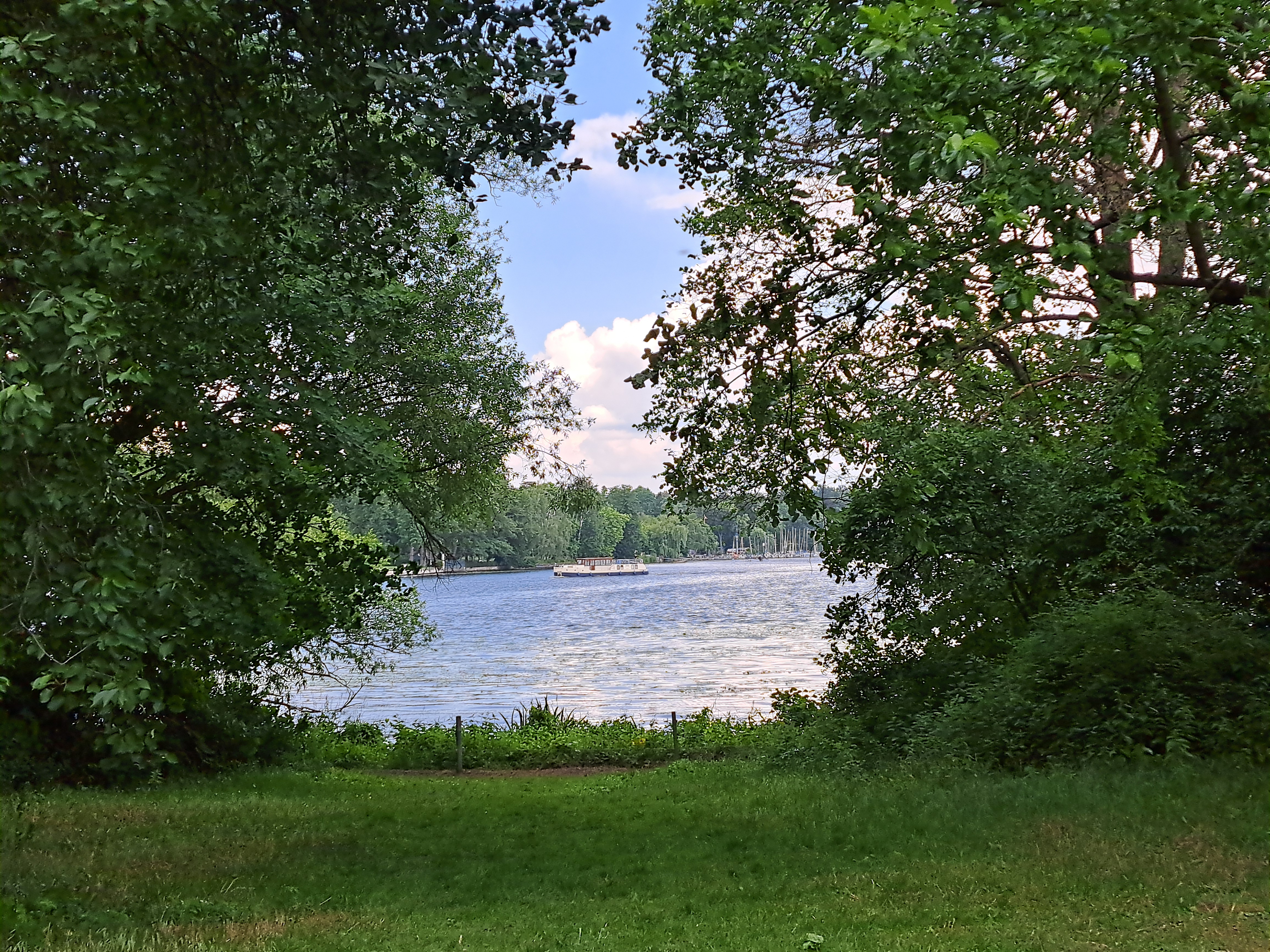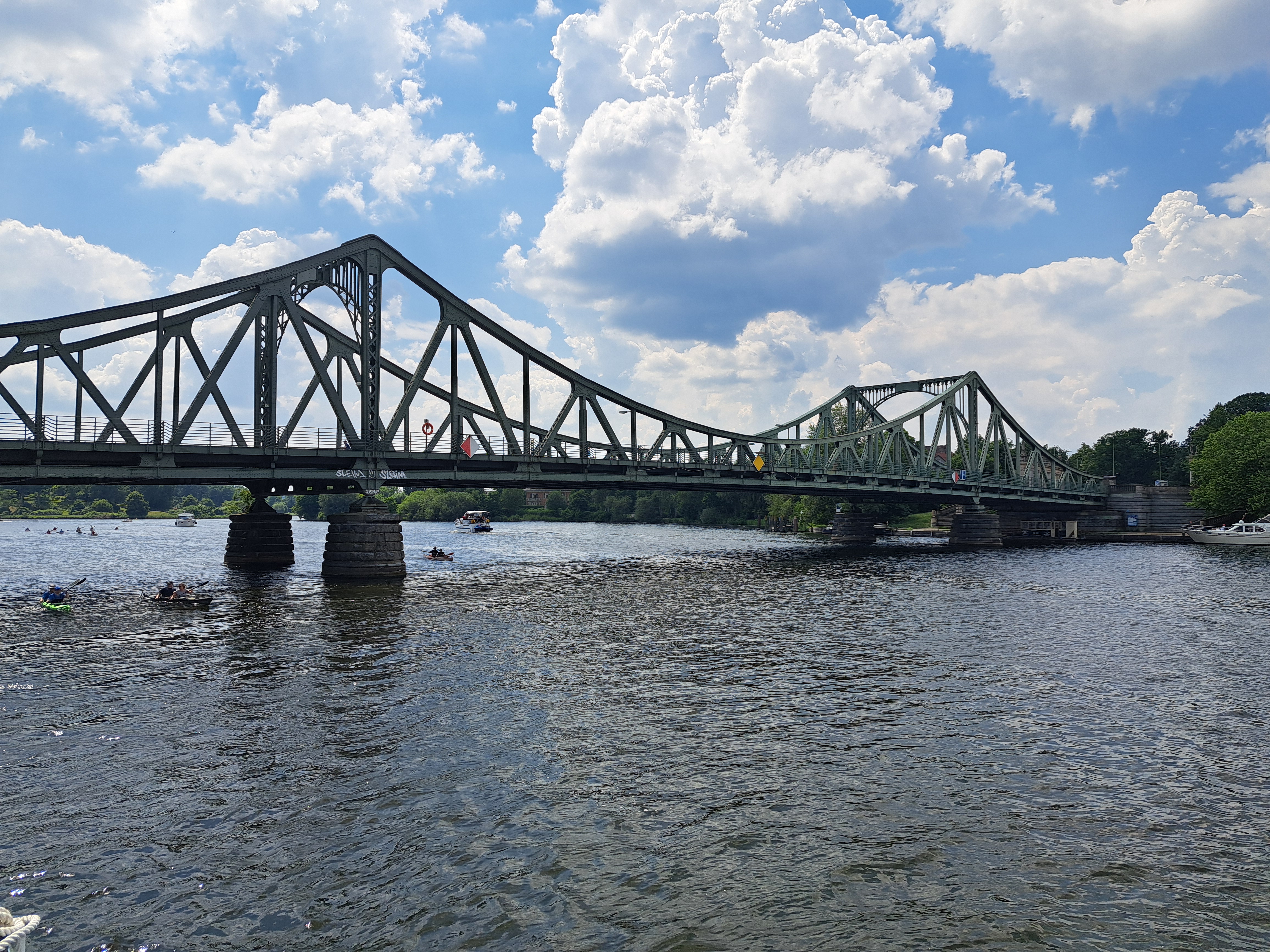 Above left: the bridge depicted in the movie “Bridge of Spies” along with another view from Steve’s and my cruise on June 1. Below, from Pfaueninsel looking over to the shores of Brandenburg. Back in the day, the W/E German border ran down the middle of that water.