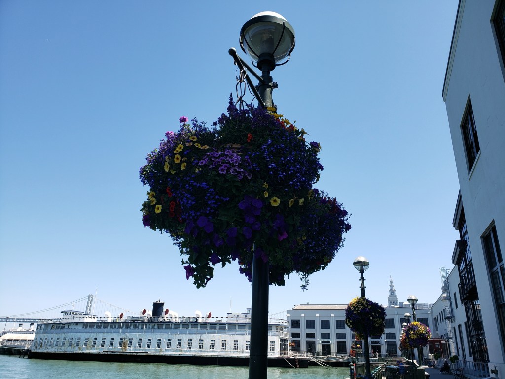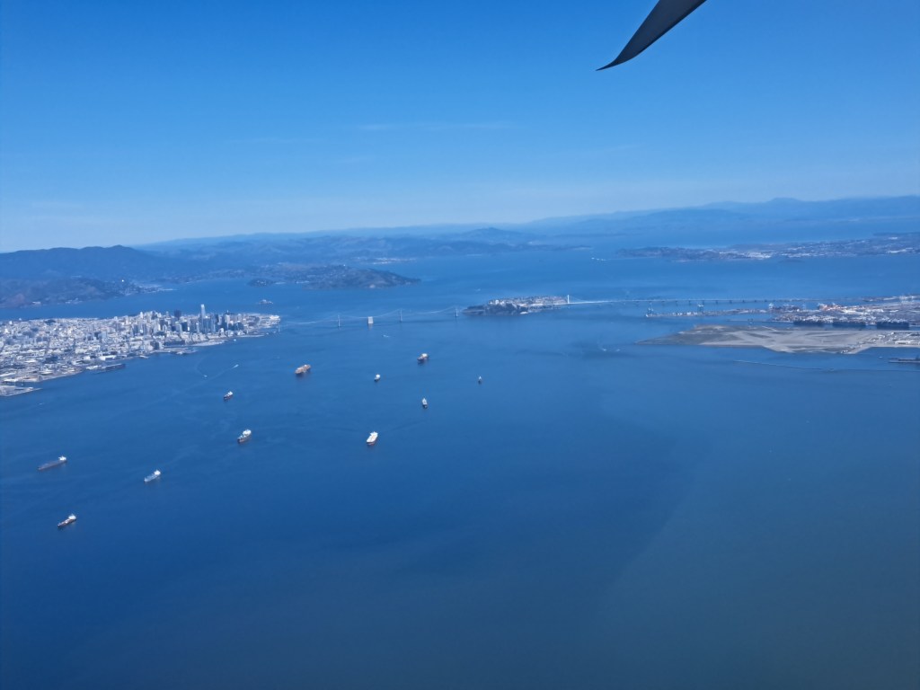 These views of SF and the greater region are from the take-off ascent when we flew back to Amsterdam two weeks ago. The photos at top and bottom were selected as highlights for two reasons. First, because they both show the atmospheric effect of heat in the central valley (more than 100km east – right – of what you see here) pulling cool, moist air — aka fog — in from the vast, cold and wet Pacific directly through the Golden Gate (not the bridge, but the small gap in the coastal mountains which the bridge spans) and then inland, following the river that drains the valley then flows into the bay, in the process flowing over both the city of San Francisco, and some of the surrounding cities to the north and east. Second, because they both also show you the lovely north bay and – if I had that degree of resolution – they likely look right over Sonoma Mountain and the other coastal-range mountains to show Santa Rosa, in its little bowl about 65km north of the Golden Gate. FYI, the bridge you do see is the Bay Bridge, its two spans connecting SF with Oakland and the east bay, forming the western terminus of Interstate 80, just as the George Washington Bridge forms its eastern terminus at the Hudson between NYC & NJ. The Golden Gate Bridge, by that particular Monday afternoon, was already well-wrapped in the fog you see :-).