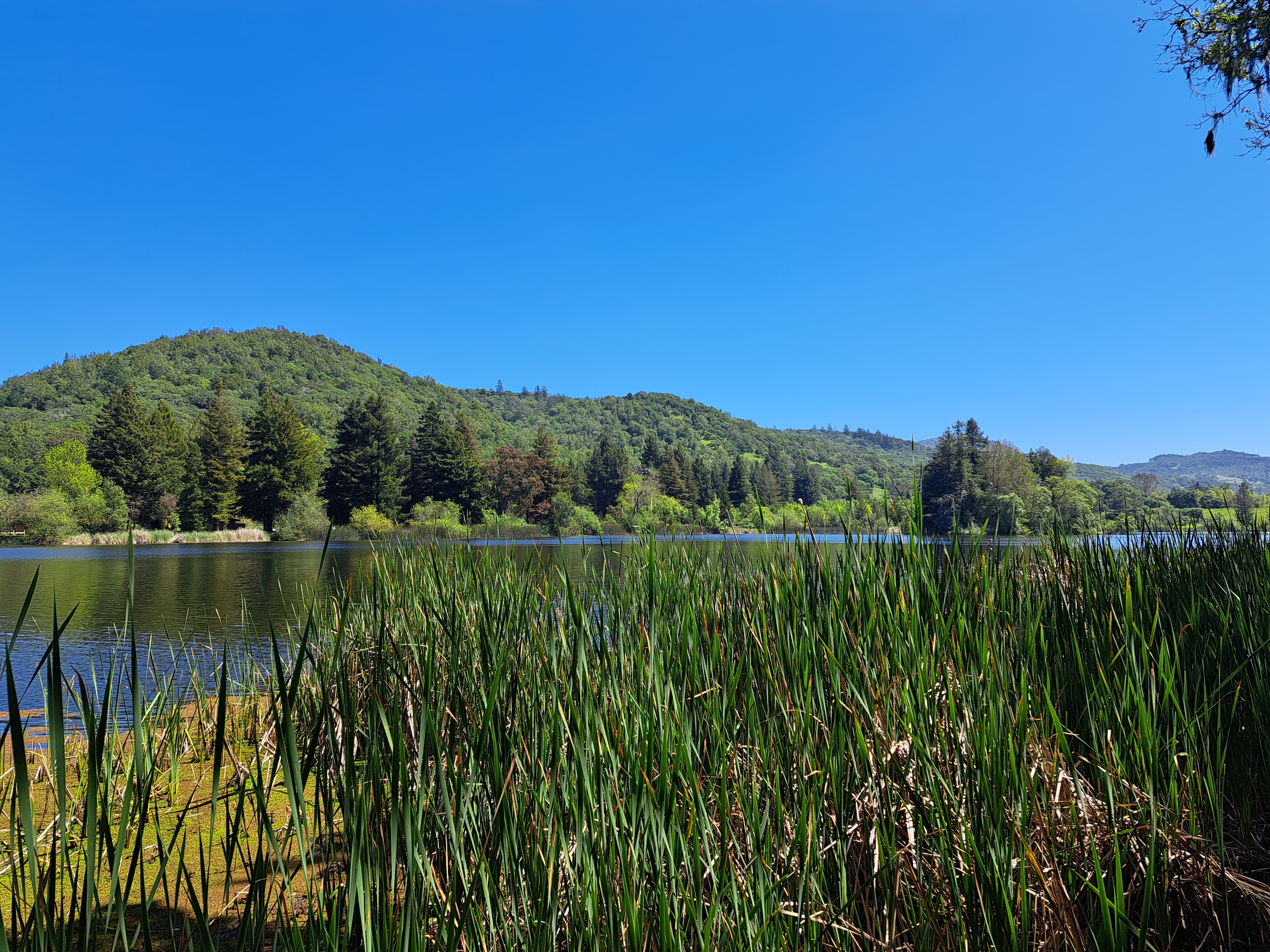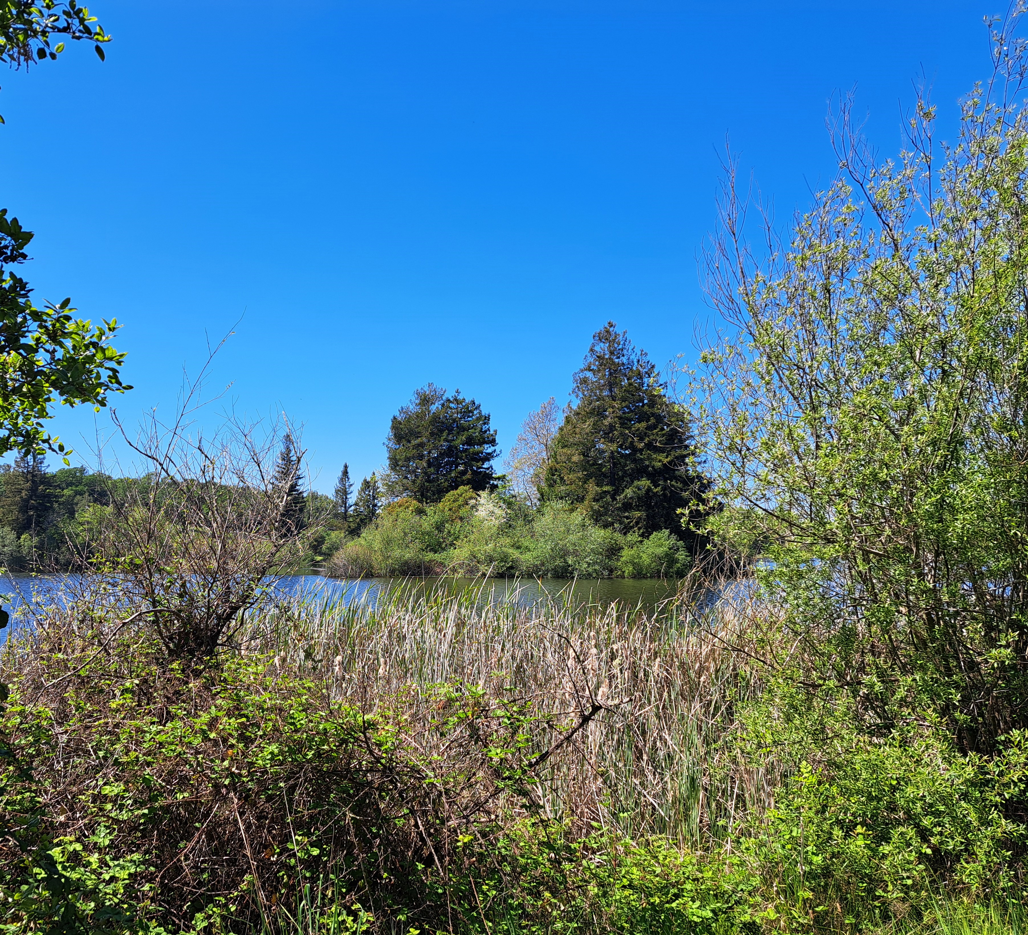 So yes, there’s actually an island in this photo, which you can see more clearly and easily from the other side of the lake, in the photo below :-). (Above, look for the taller pines that seem to grow from closer to or in the lake – yep, that’s the island.) The joy of my various series are that they help me see things in new ways – this is Spring Lake right near the apartment I lived in when I was in Santa Rosa, and despite many bike rides and afternoons reading on benches along its shores, I’m not sure I ever noticed the little island before!
