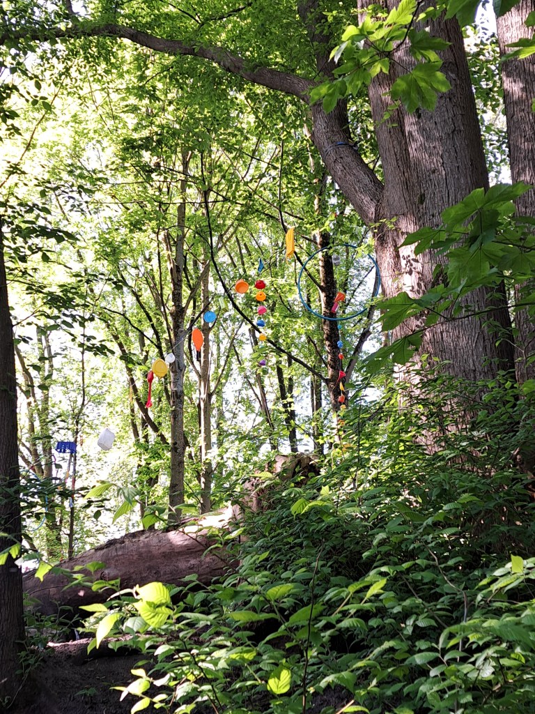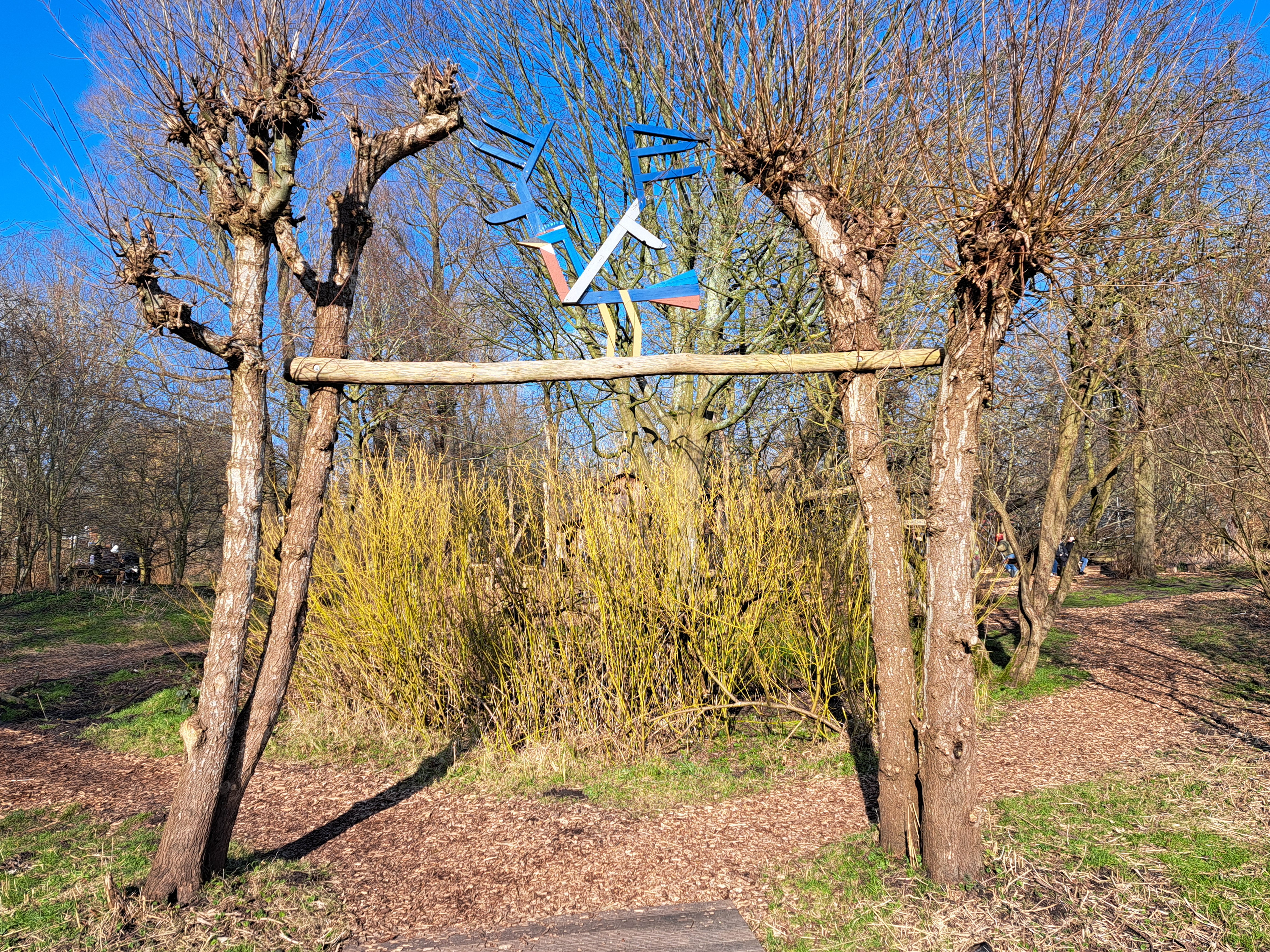 The joys of a contemplative, stress-free walking exploration of one’s local park & lake. E.g. I finally climbed up the top of a little hill with a sculpture on top, which I’d always just looked at from that path down below, previously. I’m lying on said sculpture in the image above. Also, a photo exhibit at the south end of the lake about building dialogue between communities.