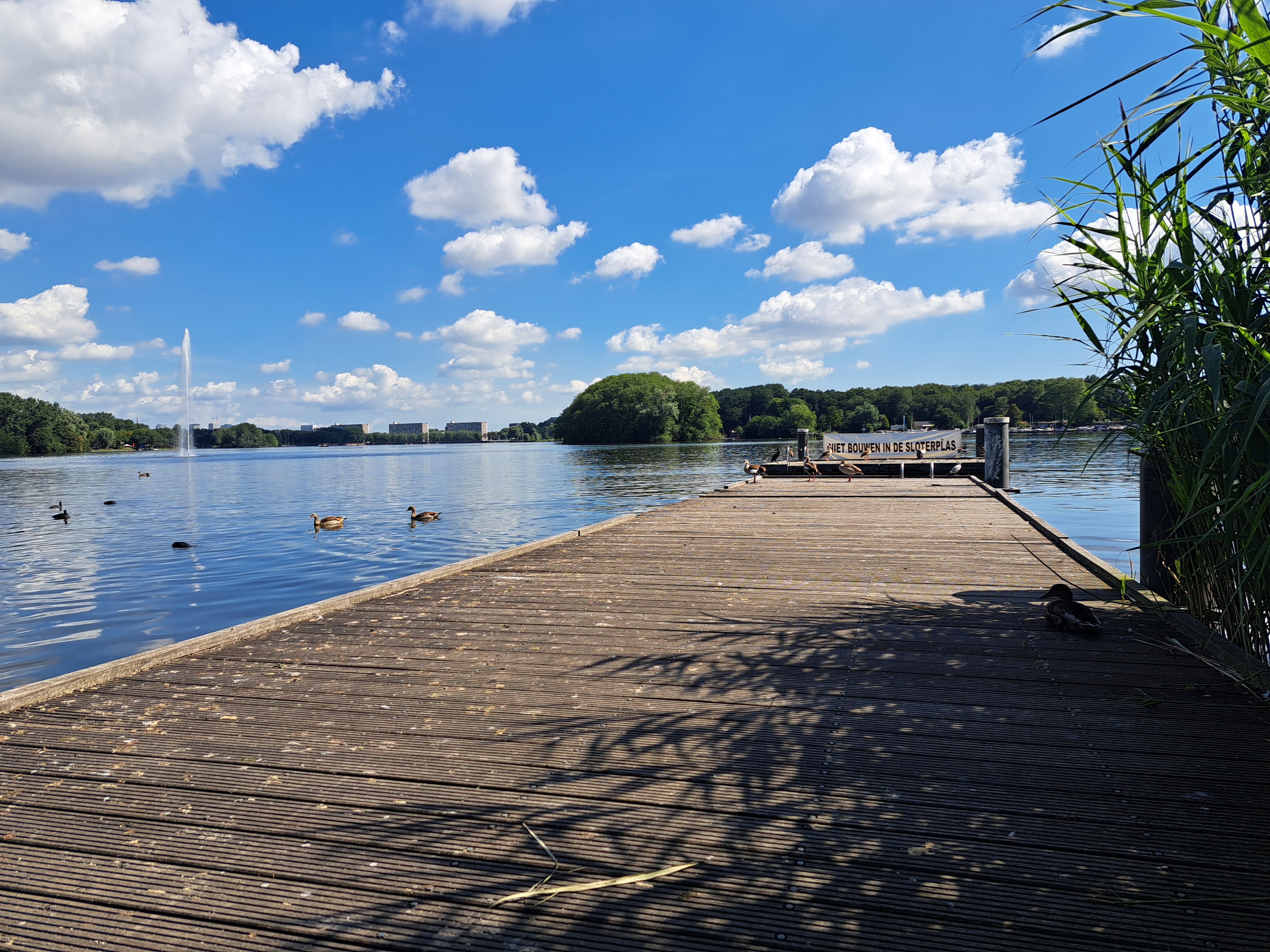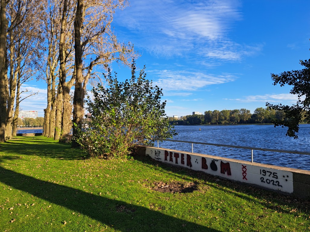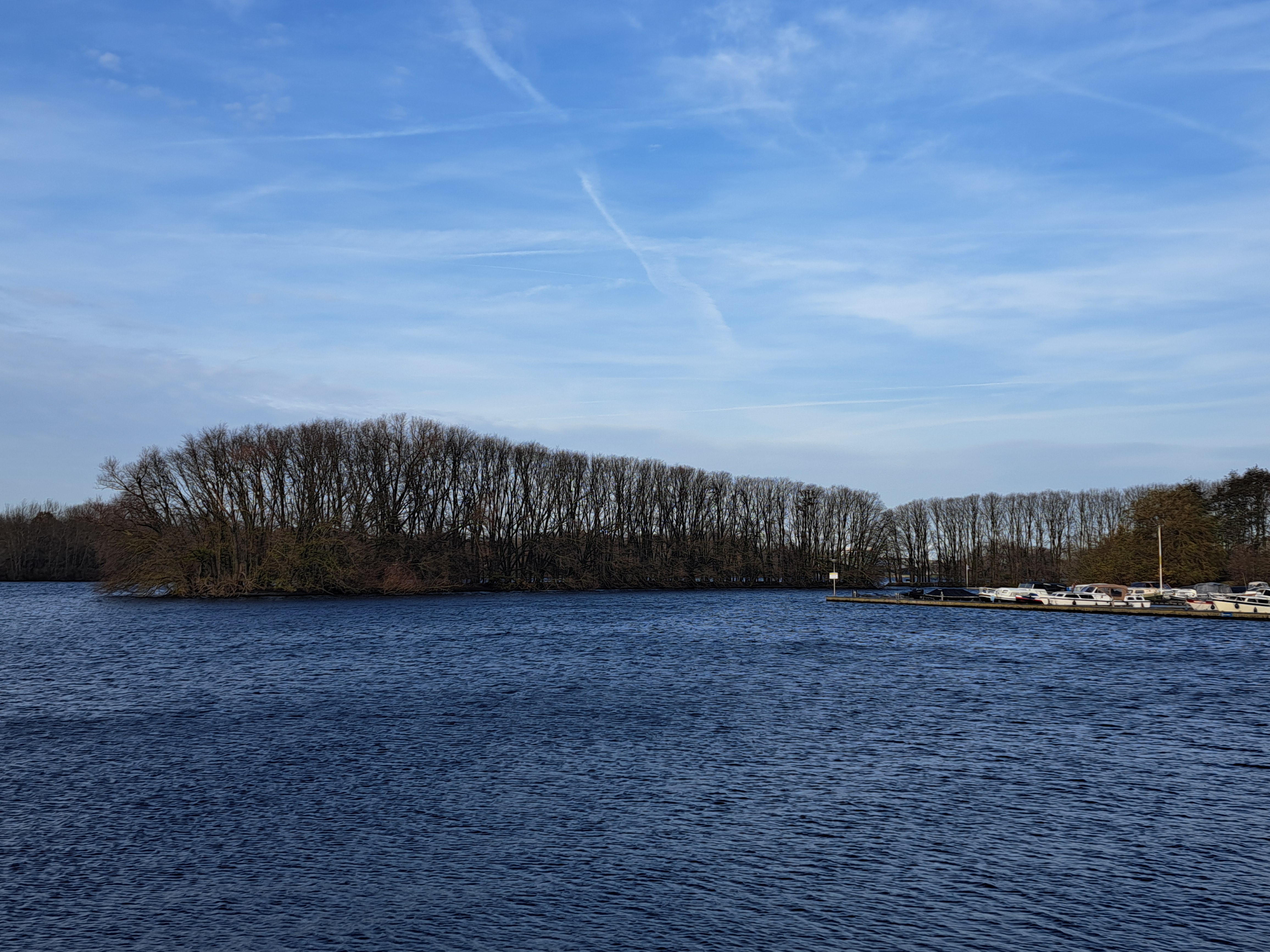 At the top of the above photo is a bit of a hidden little island that’s tucked on the edge of my local park, Sloterpark. Curious about it, I walked over to see that it’s some kind of youth club recreation area, and though I wasn’t able to photograph them well, I’d like you to imagine a dozen or so teenagers zipping through the breaks in the trees on mountain bikes. I think they’ve turned it into a mini mountain bike race course or something. Below are the usual-suspect islands along the edges of the main Sloterplas flood-control & canal-navigation lake next to which I’ve lived since August 2023.