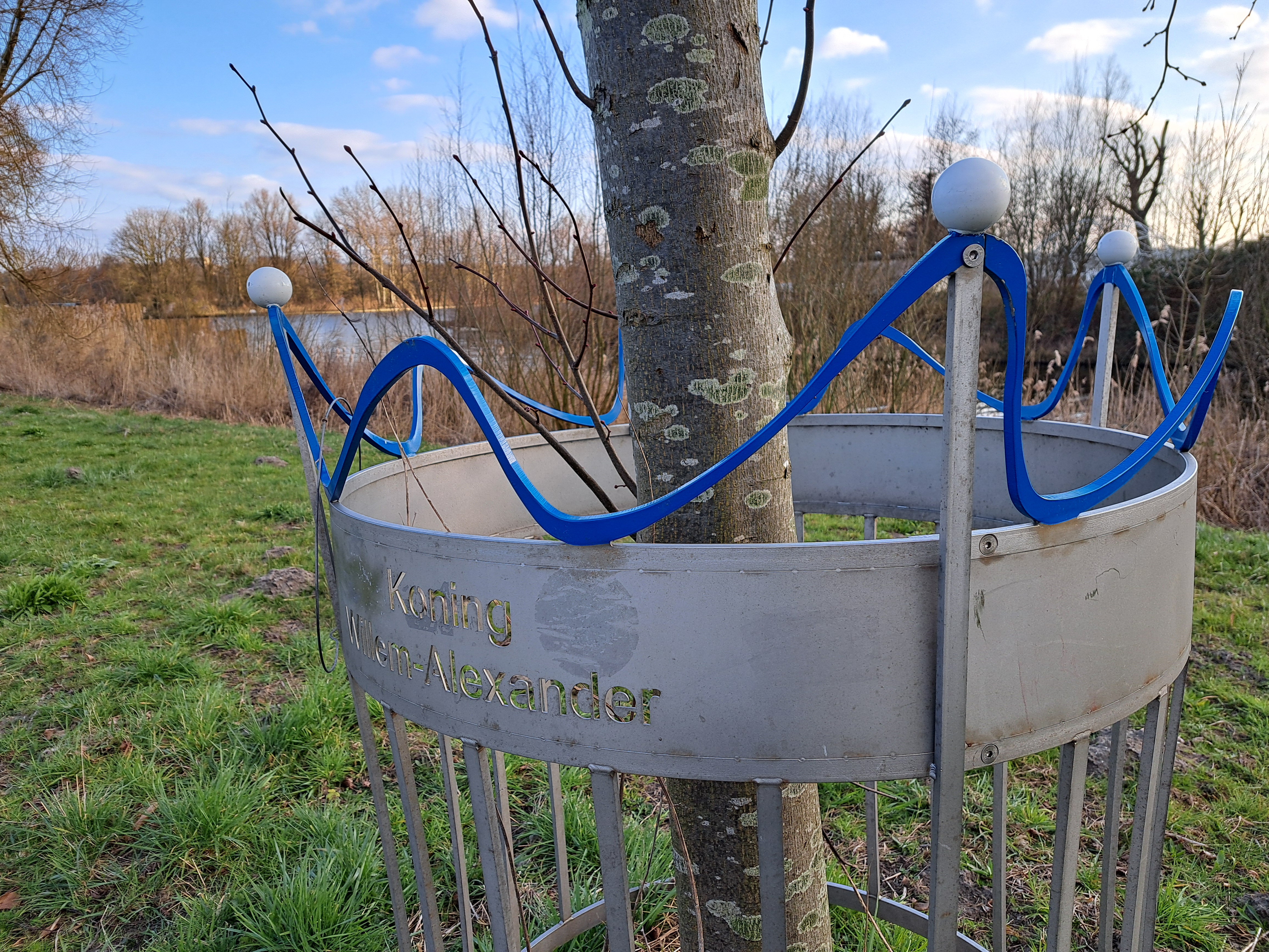 Yes, this sapling protector in my local park bears a crown design and the name of NL’s current monarch, King William Alexander. Don’t ask me why. If I had to guess, I’d say maybe the sapling itself was planted in 2013, when he took on the role after his mom abdicated and left him holding the crown?