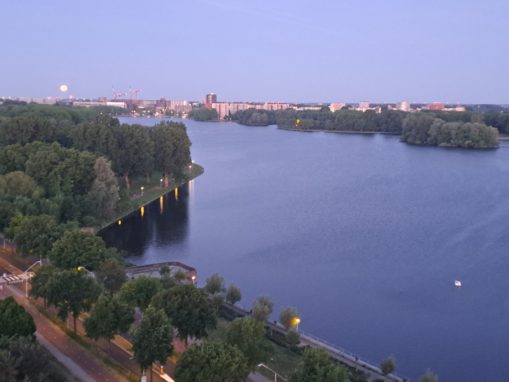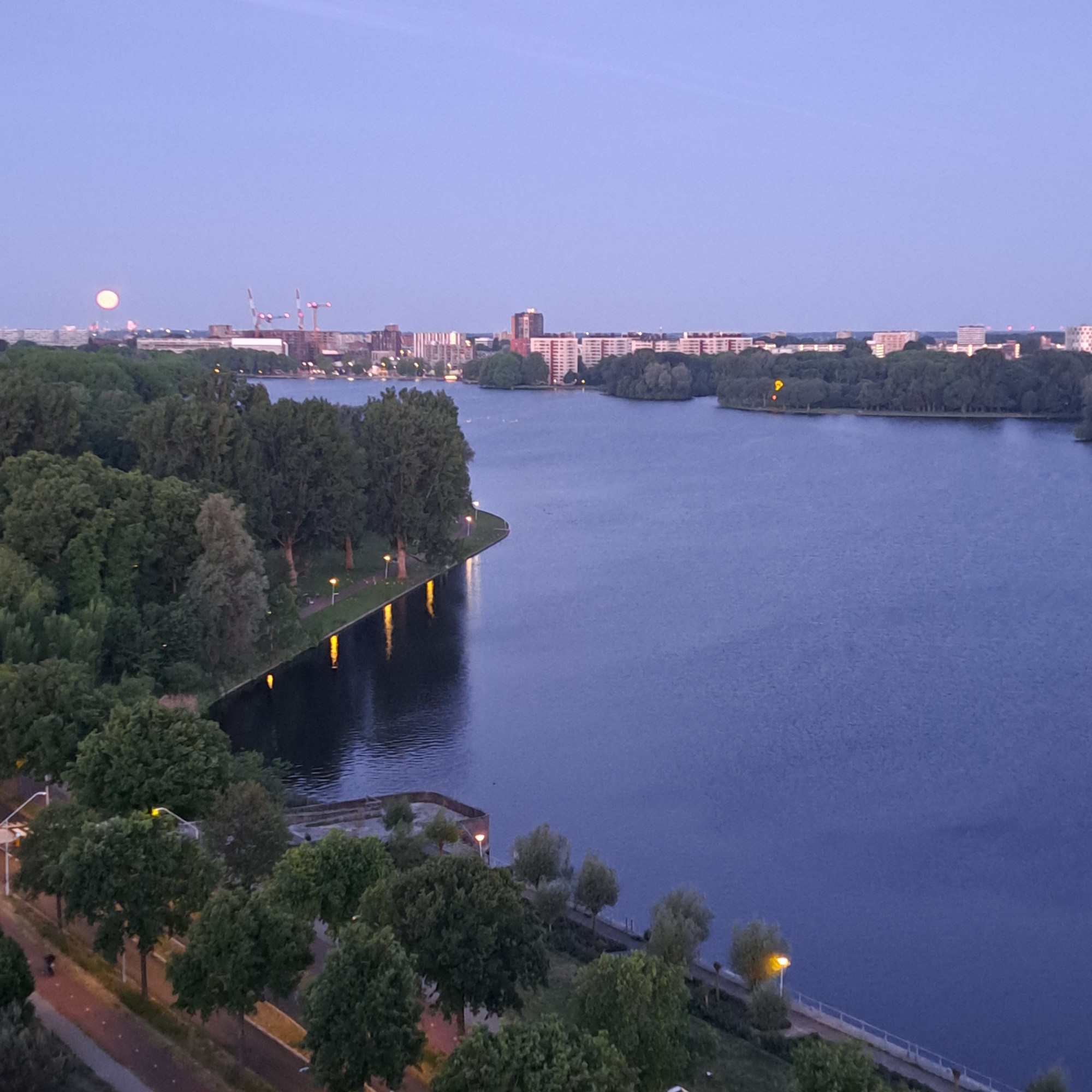 And yes, however lovely the gardens, water lilies and architecture are wherever work or pleasure travel have recently taken me, I breathe a sigh of relief when I get home to my lovely lake views and my own bed & kitchen again :-). I’d been saving this May morning moon-set shot for either sky lights, or city lights, but I like how it pairs with the shot above.