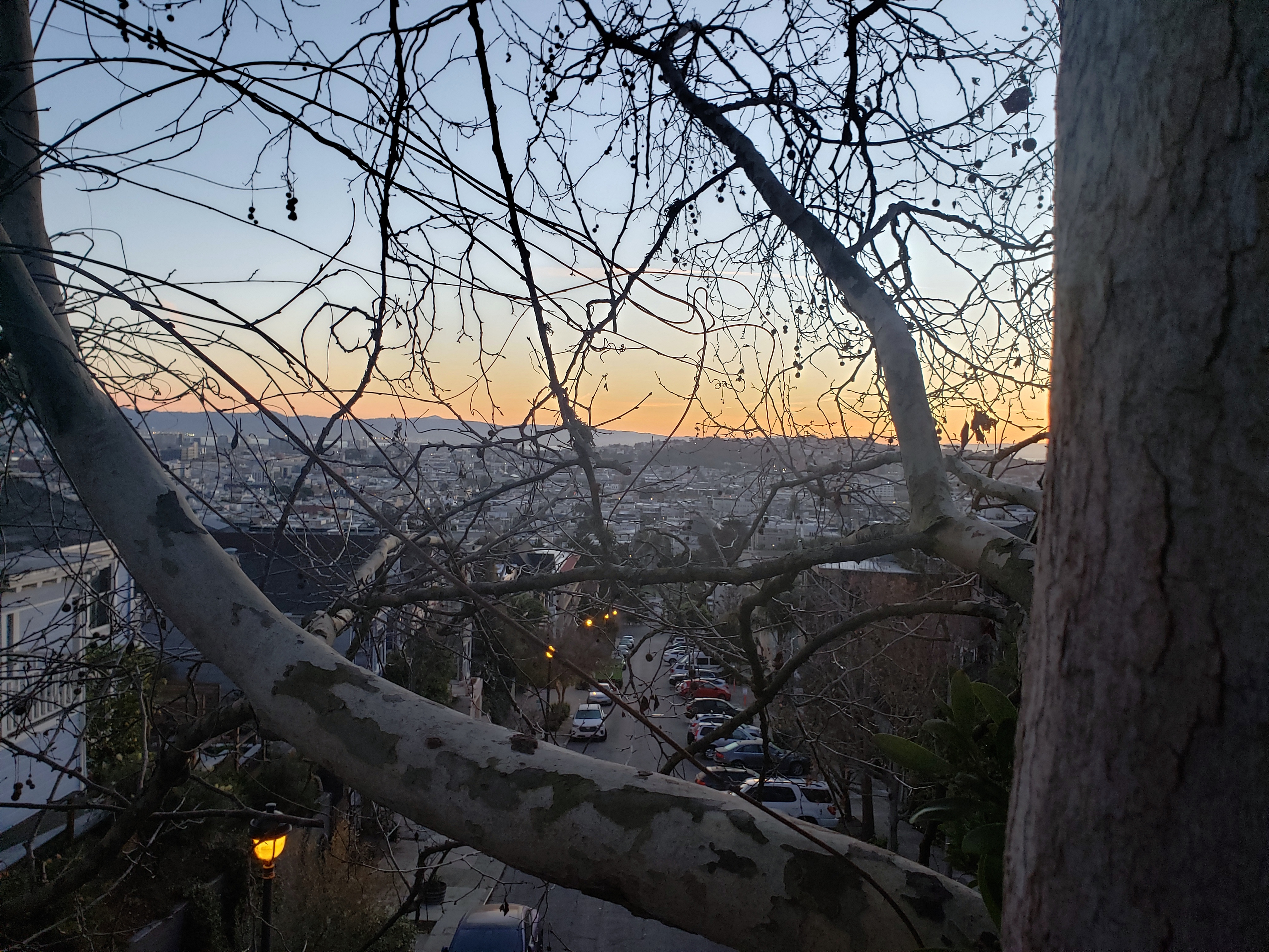 Found a few more lovely photos from my visit down to city in January, so you’ll see those in the mix these next few weeks – no, the trees are not currently quite this bare in SF. When I’m down there later in May, maybe I’ll remember to try the same angle and tree, to see where the sun rises near mid-year, and how much the leaves block the view to the east bay :-).