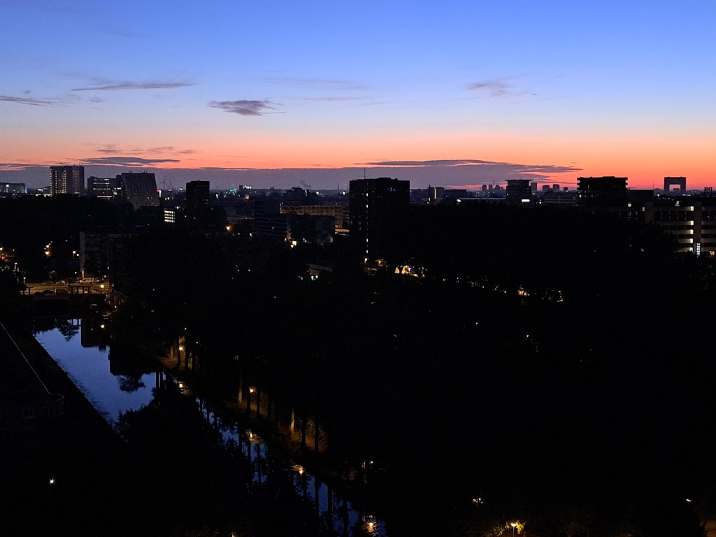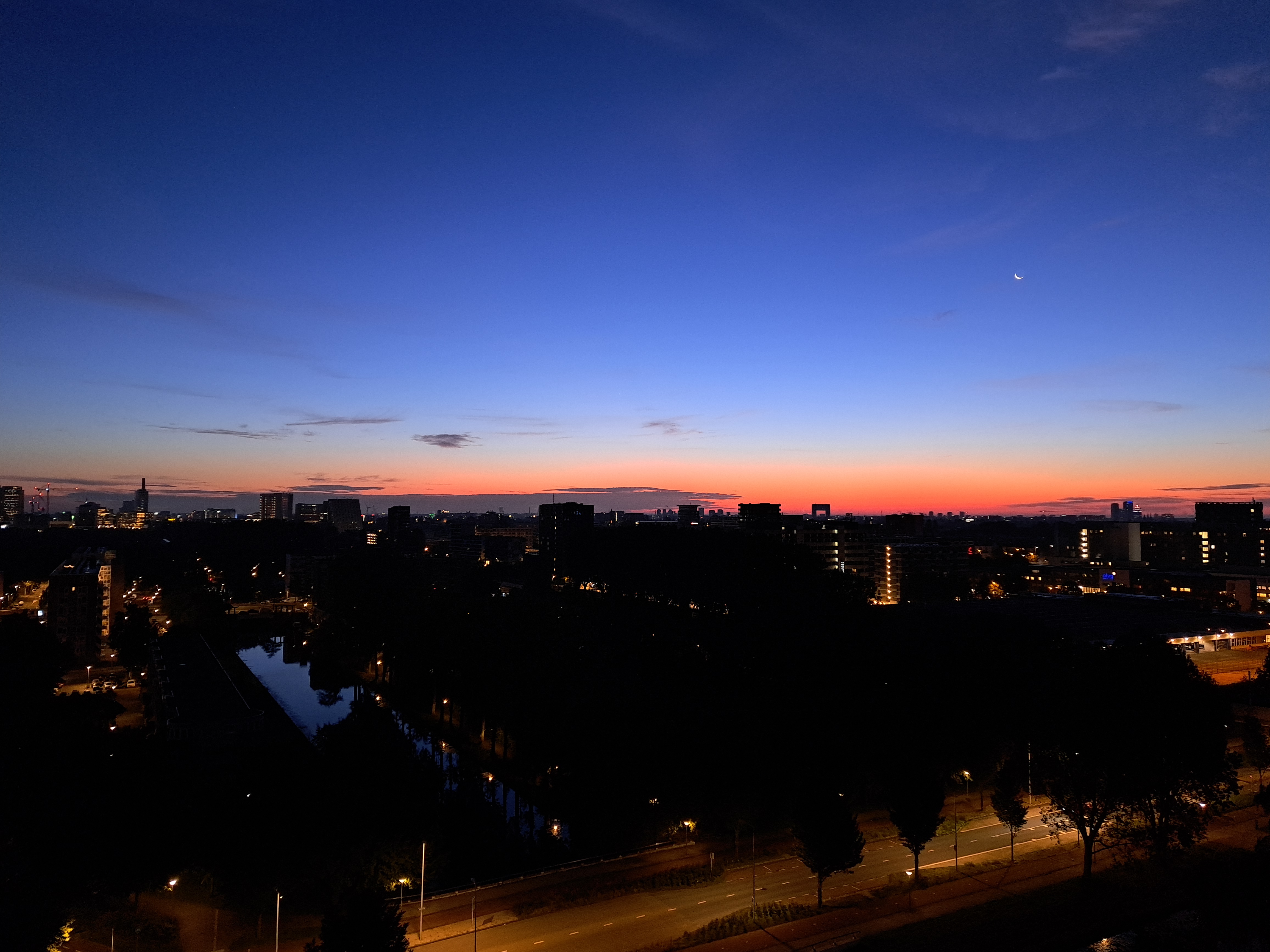 Given how much shorter the days are becoming here in the north now that we’re past the solstice, I figure I’ll have a chance to catch more city-lights photos with the long dark nights that’ll fill the coming six months :-/, so I can spare two in one post. As I mentioned in an earlier post, the apartment I’m now in gives me lovely views at all hours from high above the city – including these shots from mid-August, with a sliver of moon and the earliest glimmers of dawn before sunrise.