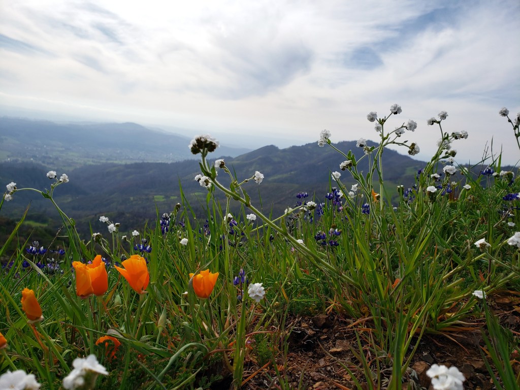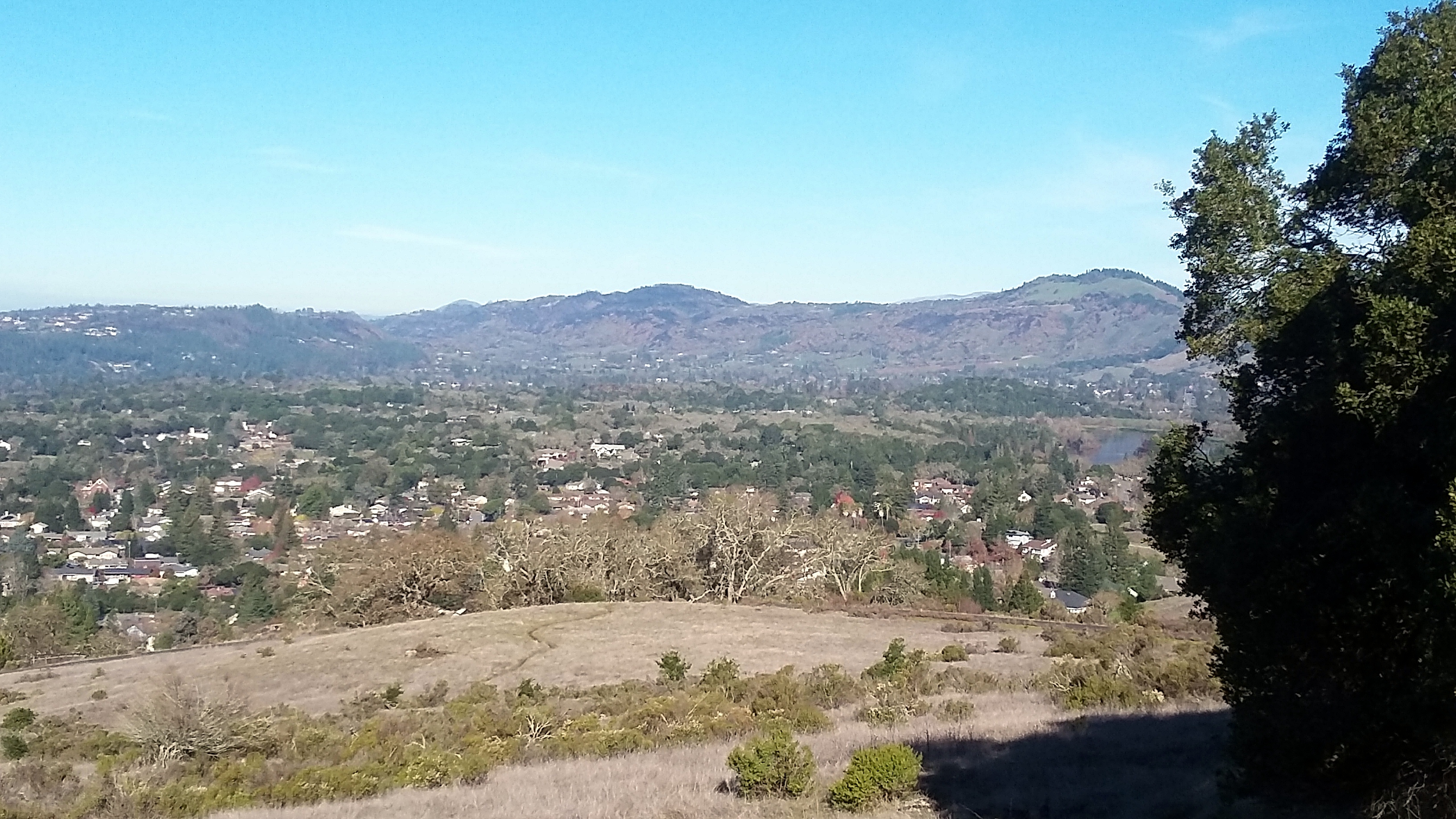 Singing the mountains and valleys, trees and rocks, grass and flowers and even the loud wild turkeys that surround me in my adopted home here in the North Bay. As most readers and friends know, this adopted home town of Santa Rosa, where I’ve hung my hat any available moment between assignments or family-and-work trips elsewhere since 2014, was caught up in a devastating fire which then became a complex of several enormous fires in October of last year. As noted in a few previous posts, I’m trying to watch the process of decay and new growth which nature is pushing forward as the rainy season has rolled from November through now February here. We’re still far too short on rainfall for the rainy season, and must hope for many more inches in coming months if we’re to avoid further devastating fires and water restrictions later on. But for the moment, the grass has greened the hills and gentle steady rains have revived many plants whether burned, dormant, or both. Burned patches scar many of our mountains as seen from a distance, while burned trees and rocks remind us on walks and bike rides that we’re fortunate the fires ended when they did. I’ll soon be off to a new assignment, in a portion of Africa which rarely makes the global headlines, and where the opportunity and luxury of taking photos will rarely apply. So to remind myself of the beauty for which I’m so grateful every time I come home…I’m popping a whole ton of photos (yes, I know, way too many) up on here. Further down you’ll see galleries with tree-and-rock level detail of charred tree trunks still standing and bravely putting out new leaves and shoots; you’ll also see three months’ worth of photos of my fire-scarred rock in its gully and be able to compare the process of regrowth. It’s rather like watching the scar from my own small surgical procedure last December: each month, that scar seems to recede. Mine is only a small scar, unlike many of our mountainsides whose scars still astonish with their size and brownness, even in this relatively green time of the year. Enjoy the photos – click on individual pictures in each gallery and you might see why I included it once it’s a bit larger. (For example, a tree scarred at the bottom but still alive higher up.) Here’s to a year of healing wounds and finding new growth, for me and everyone reading this :-).