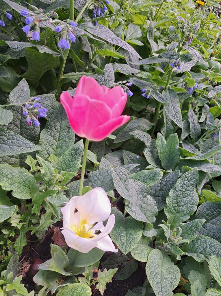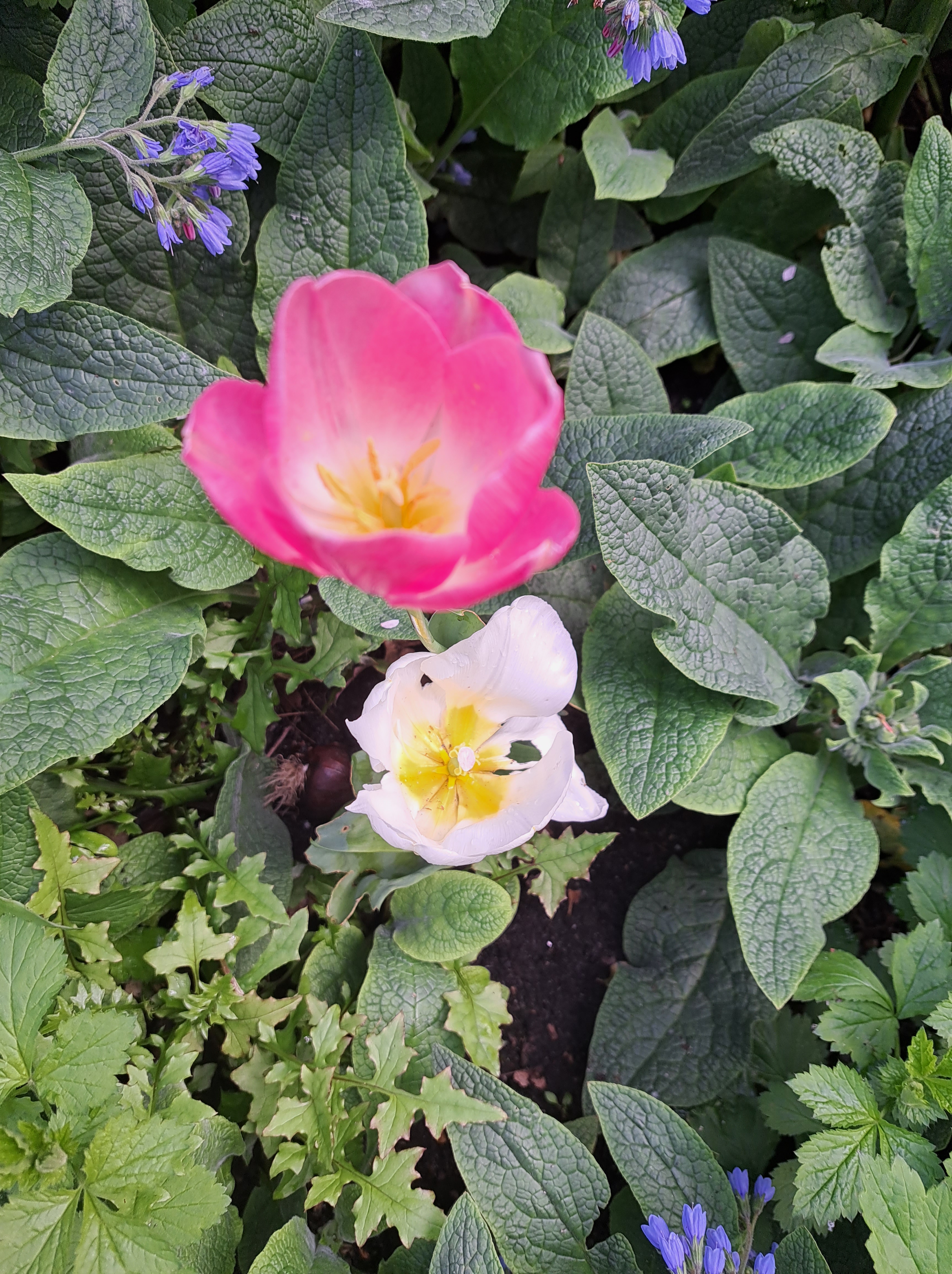 So yes, we landed early Tuesday in Amsterdam. While I was away, the crocuses faded, the leaves remained absent from the trees (though many are strongly in bud by now), and as you see in these photos taken while walking to stay awake, the tulips are coming into their season.