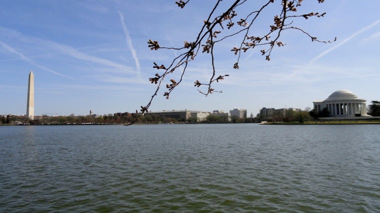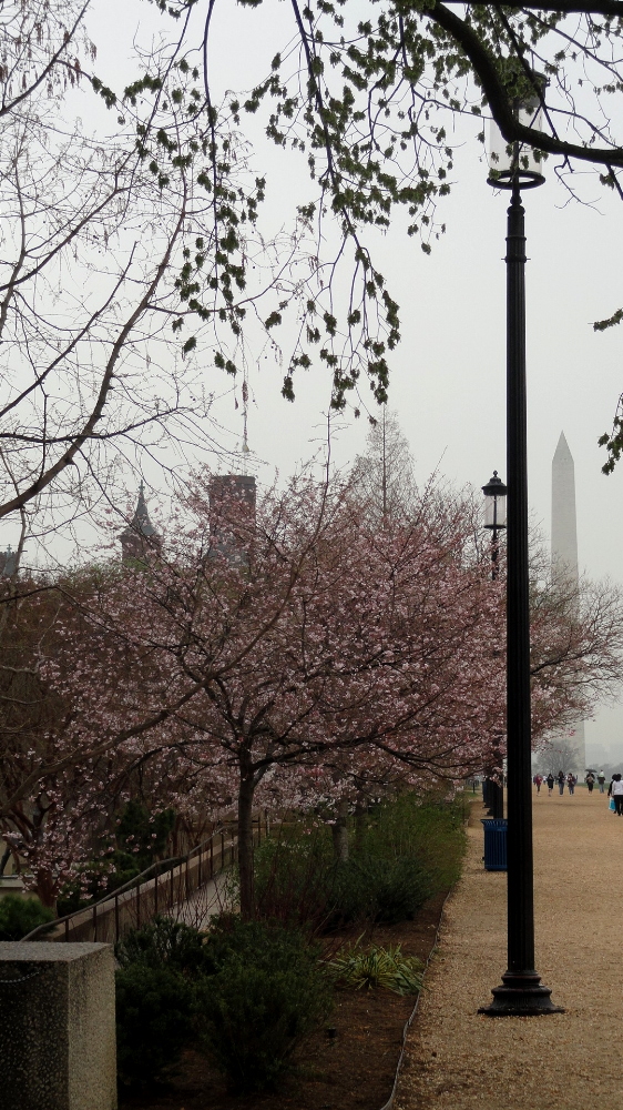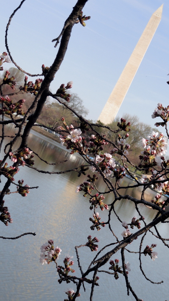 …above, taken earlier in the week; below, about five days later once the trees had burst into full bloom. That’s the Jefferson Monument, by the way, my personal favorite both because I think it’s the most graceful of the three biggest & oldest monuments, and also because Jefferson was such a great philosopher of democracy, and also a conflicted representative of the ideals he represented: a committed Democrat who had slaves and agreed to the original language of the constitution which gave slaves no rights whatsoever but counted them as partial people for the distribution of political power in the new system (for allocating seats in the House of Representative, if my memory of history serves correctly…)
