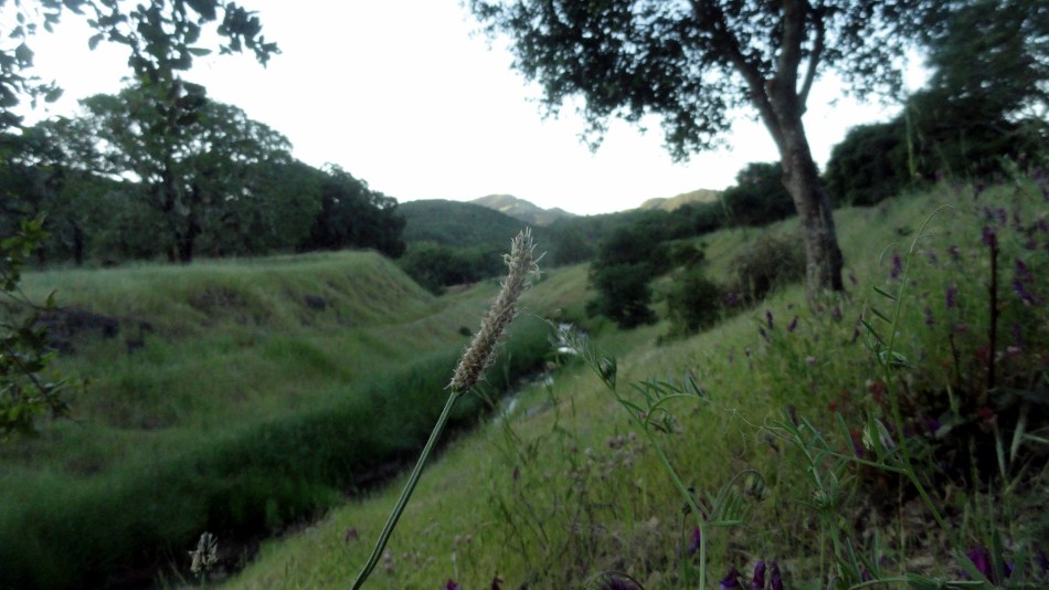 The first photo in this post was taken in Annadel State Park in late April – at the end of the wettest rainy season we’ve seen in many years. Of course, that rain meant we had lots of new growth this year. And of course, we had our usual dry season which led to the brown hills with dusty green of scrub oaks and lots of dry new growth, which you’ll see in other posts. Look closely at the photo just below, and you’ll see how the grass burned on the hills of Annadel just above a city park where I often play tennis. It’s fairly common for parks to burn, this late in the dry season. It’s not at all common for a firestorm to erupt and spread so very rapidly under heavy winds. Friends who were here at the time, and who were evacuated, tell stories of going to bed aware of heavy winds, waking up to the sound of neighbors knocking on doors and/or loading their cars with family and pets then driving off, at 3 in the morning. I do not have the heart to show the destruction to property and homes: those photos are already out there, and for me to pile on feels disrespectful to the members of my adopted community who have lost so much. I am worried about one of my favorite farmers, who grows in the northern part of Santa Rosa where the first fires were at their most intense. (It’s her produce you see in one of the photo galleries further down – from figs to aubergine/eggplant and peppers.) I hope when I next make it to the farmer’s market, I’ll learn that she and her farm and family are all OK.
