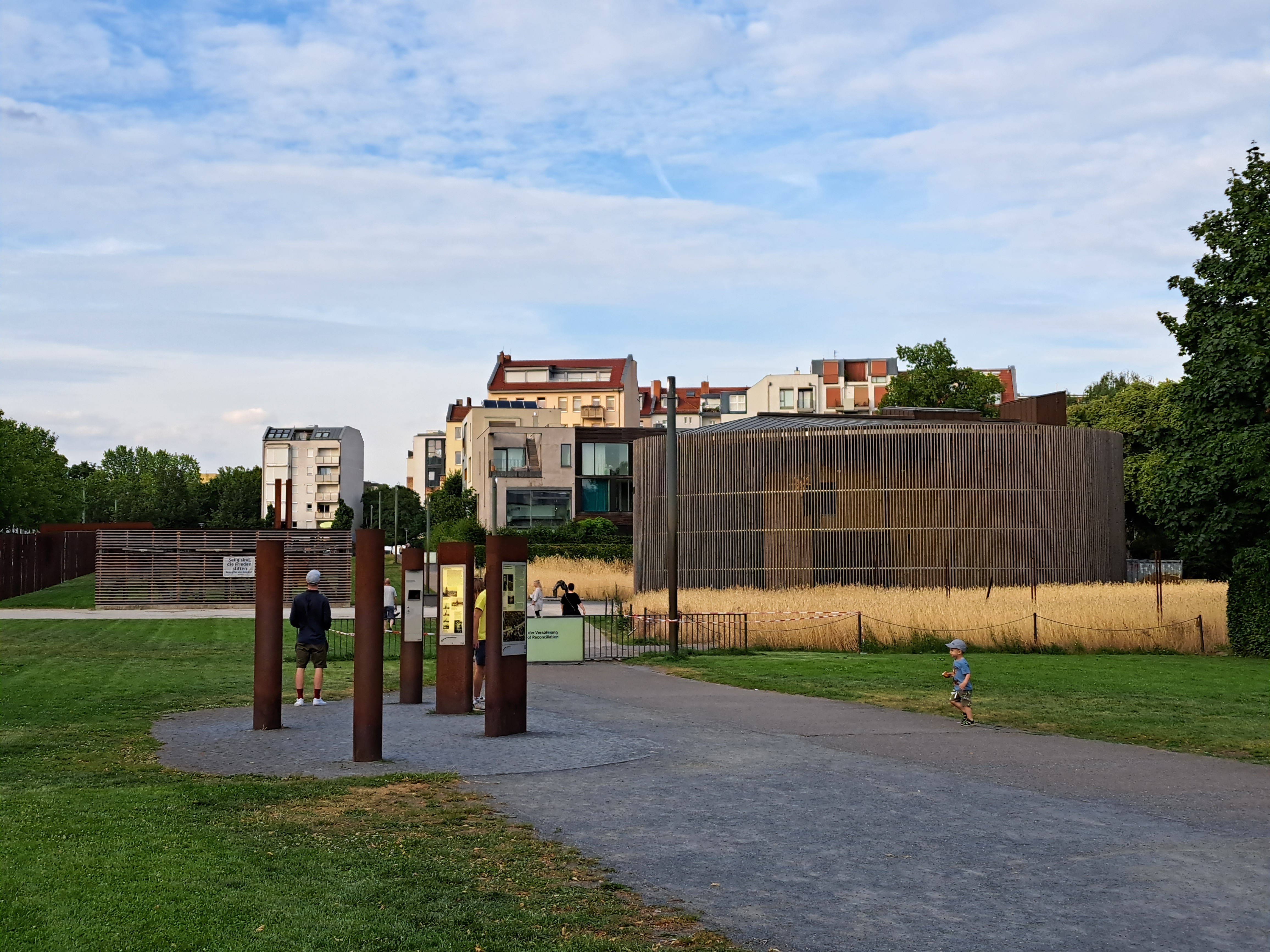 Returning to Berlin in July for those work meetings gave me a chance to visit neighborhoods where the city was once and is now no longer divided. Yes, I still cry when I walk past these places and remember my own crossings of that wall when it was really rather scary, because you knew armed border / wall guards were watching you. These photos are all from an evening walk in and around the Berlin Wall memorial park along Bernauer Strasse, one of the streets along which the wall itself once ran. The lovely murals in the gallery below were on an apartment building in what was then East Berlin…I’m fairly sure…my dear brother, for whose book on the period right after the wall was finally breached I will give an unabashed plug right here, might correct me if he sees fit.